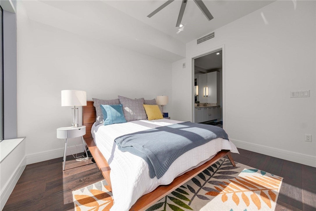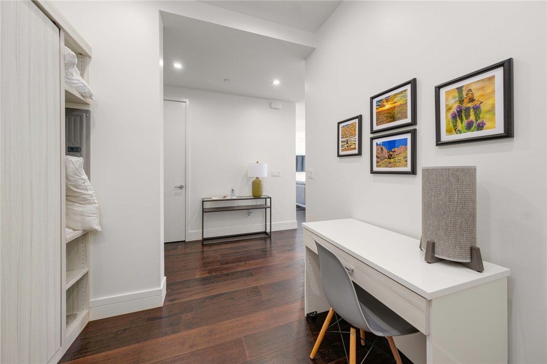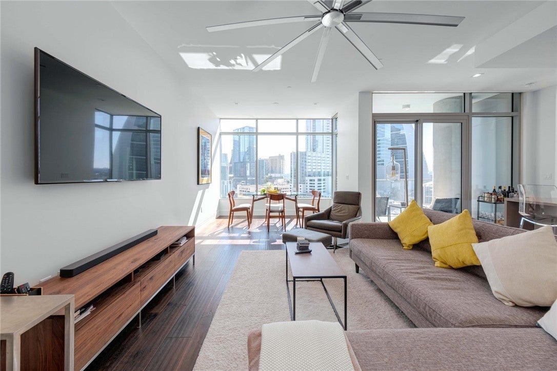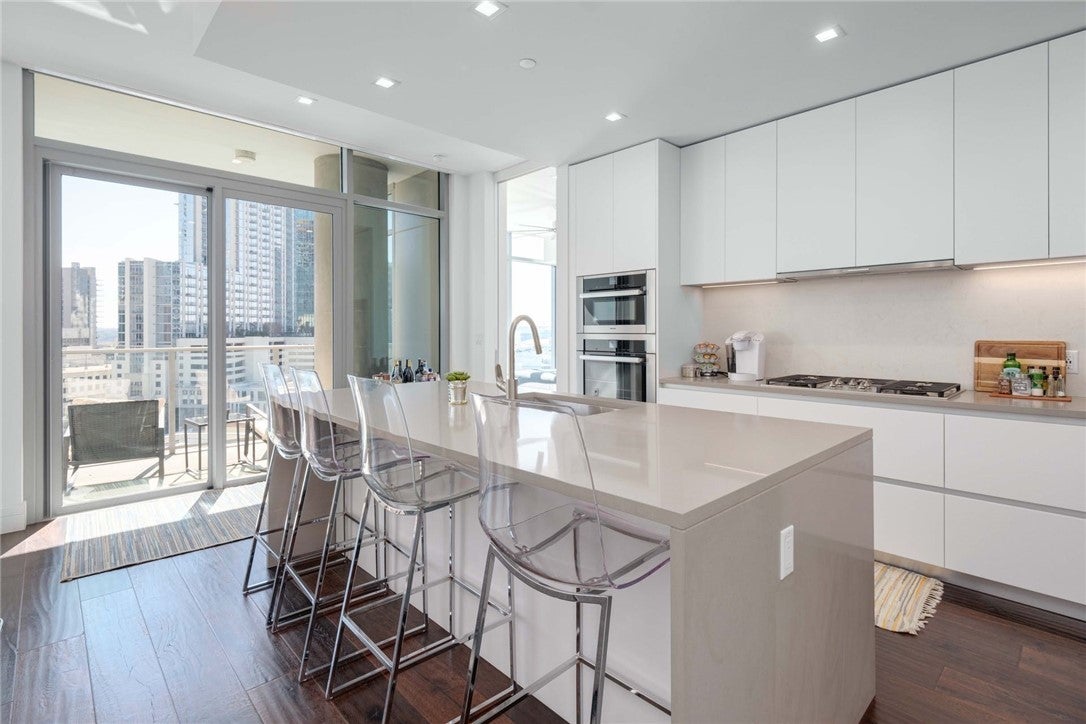 Embrace your downtown lifestyle at Fifth and West. Walls of insulated UV filtering glass surround your 10th-floor residence, finished with high ceilings, recessed lighting, and wide-plank, oak floors. The heart of this spacious 1,092 sq. ft. residence is a sleek chef's kitchen showcasing a 7-ft quartz island with a waterfall edge. Italian, flat-panel cabinets, designer Miele appliances, a low-profile vent hood, oversized custom walk-in pantry and a single-basin stainless under-mount sink anchor the space with state-of-the-art functionality. Working from home gets an upgrade in your private study with an accompanying powder room. The study has a Murphy bed that can also be used as a second bedroom. Light floods your serene owner's suite, yet the wall of windows feature blackout shades for bedtime bliss. Take time to luxuriate in your marble spa bath featuring a frameless shower, water-conserving Kohler toilet, and a double linen closets. Every square inch of this primary ensuite has been thoughtfully designed bathroom to the oversized custom walk-in closet. You'll enjoy unobstructed views of Downtown, SoCo, and the 6th-floor Sky Deck from your spacious glass-surrounded terrace. All Fifth and West residences were designed with technology at the forefront. Savant home automation systems, smart thermostats, and motorized shades enhance your everyday comfort. The keyless entry gives you peace of mind. Conceived by a local, award-winning architecture and design team, Fifth and West is a low-density luxury community packed with 20,000 sq, ft. of amenities including 24-hr concierge, yoga & fitness studio, guest suites, pool, pet park, conference room and so much more. Your new residence feels like a hotel, without the hotel guests. Enjoy your Market District location, within walking distance to the Austin Central Library, the Seaholm District, Whole Foods, Lady Bird Lake, and everything your Downtown Austin lifestyle requires.