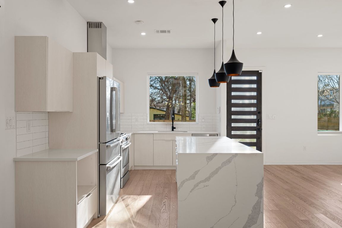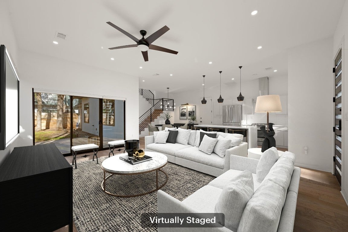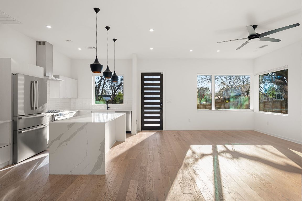 Discover the ultimate South Austin lifestyle close to the St. Elmo District / South Manchaca neighborhood, this practically new 2020-built corner home lives like a true single-family residence and offers exceptional privacy, space, and flexibility. Fully fenced and gated corner lot, the property features both a welcoming front yard and a spacious backyard shaded by mature Live Oak and Elm trees—an ideal outdoor retreat just South of 78704. The thoughtfully designed two-story layout includes 4 bedrooms and 3 full bathrooms, with a full bedroom and bath conveniently located on the main level, perfect for guests or multi-generational living. The open-concept main floor is filled with natural light and showcases hardwood floors throughout, custom window shades, and a beautifully appointed kitchen with a waterfall-edge island, bar seating, and seamless flow into the living and dining areas—ideal for everyday living and entertaining. Upstairs, you’ll find the primary suite, additional bedrooms, a full bath, and a second living or family room, perfect as a media room or play space. The primary suite offers a spa-like bathroom, an oversized walk-in closet, and a private balcony with peaceful treetop views. All bedrooms feature generous walk-in closets and large windows that enhance the home’s bright, airy feel. Adding even more versatility is a detached bonus studio in the backyard(ADU/Flex Space), ideal for a home office, gym, creative studio, or flex space. With modern finishes, multiple living areas, and a prime location to get to Downtown or airport, also is just minutes from Radio Coffee, Veracruz, Pins Mechanical, The Yard and other local favorites—this home seamlessly blends comfort, style, and convenience in one of Austin’s most desirable neighborhoods.