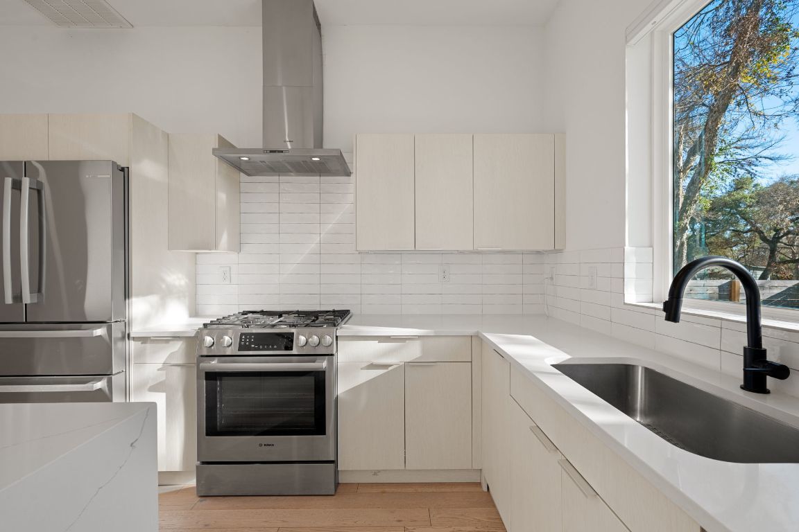 - Disposal, Dishwasher, Exhaust Fan, Free-Standing Range, Tankless Water Heater