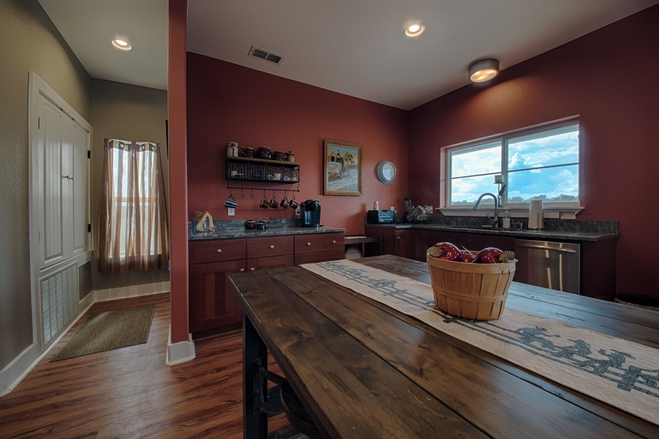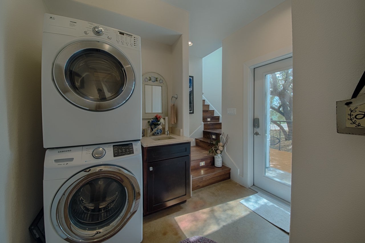 Absolutely charming unique property on Lake Travis in the quiet gated community of Chimney Cove Estates. Just 13 miles East of Marble Falls, this property is capable of comfortably accommodating a group of 16 people, this property consist of seven tree shaded acres with five bedrooms, three full bathrooms and two half bathrooms. The main house consist of the master bedroom with private full bath, two guest bedrooms, full bath in hallway, inside laundry room, full kitchen with stainless steel appliances, gas cooktop, gas fireplace, screened in porch, surround sound and an upstairs loft with panoramic Hill Country views of Lake Travis. The spacious detached three bay garage has high ceilings and a half bath with a two bedroom guest house above. The guest house features a wraparound partially covered deck, a full kitchen, dining space, living area and two bedrooms with a shared hall full bathroom.