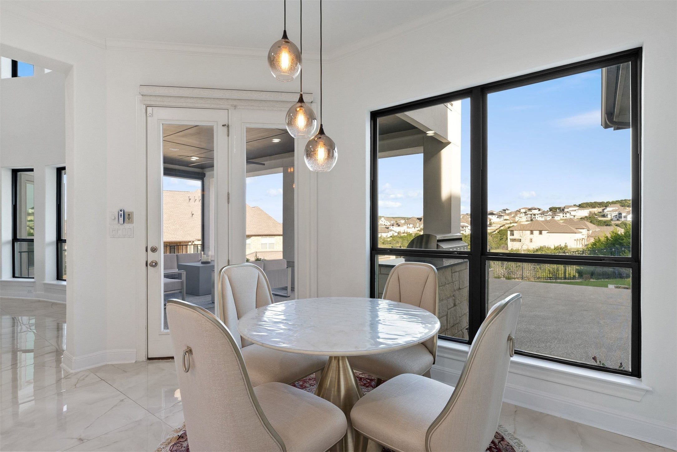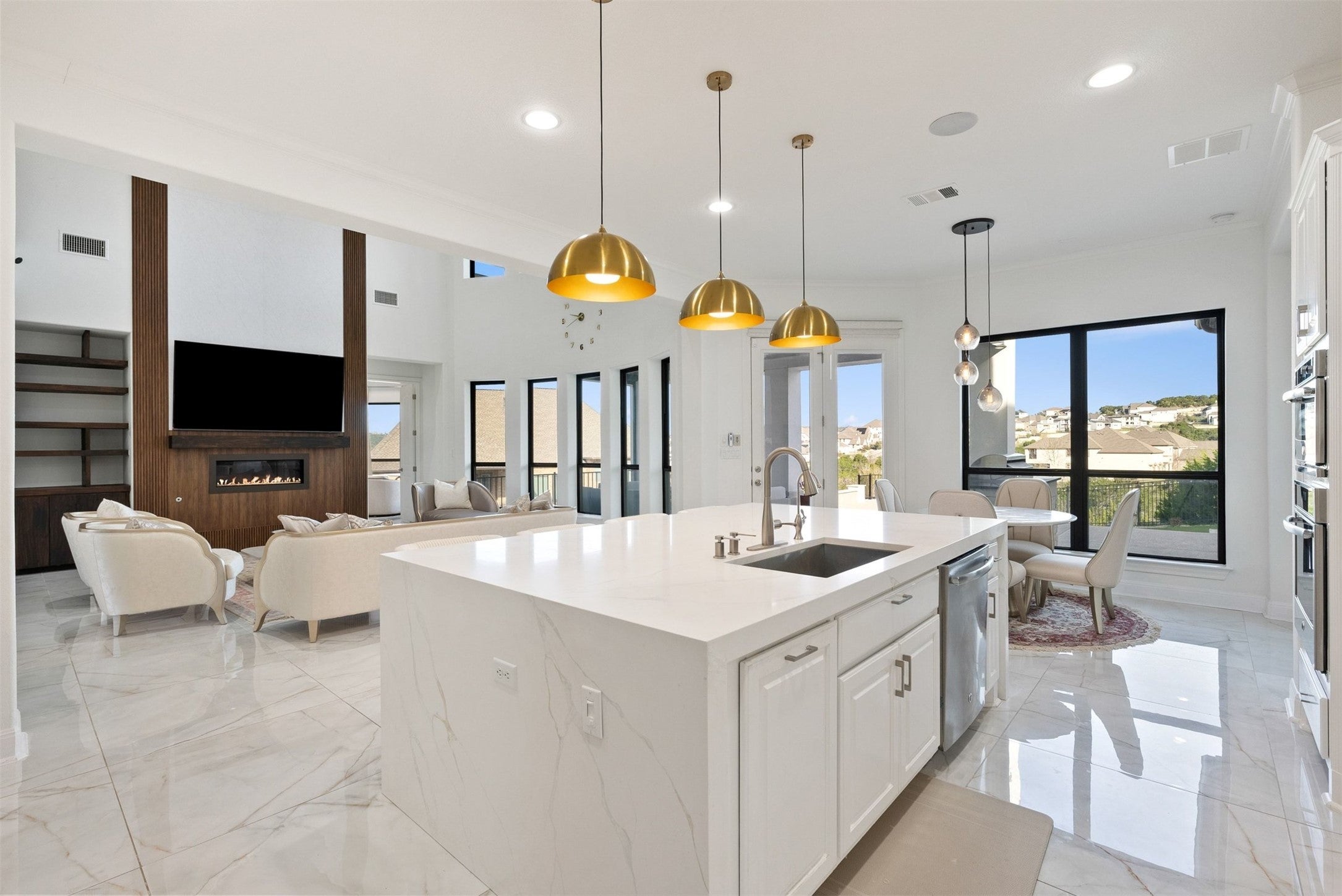 This Travisso two-story single-family home offers 5 bedrooms, 4.5 bathrooms, a game and media room, and expansive Hill Country views from an elevated lot, making it an ideal choice for those seeking a balance of quiet relaxation and space for hosting. Set within the 78641 zip code, this Taylor Morrison build combines a spacious layout with high-end finishes that feel both high-quality and welcoming. Living in Travisso provides a peaceful atmosphere while keeping you close to the natural beauty of the Texas Hill Country and the growing amenities of Leander. The main level centers on a living room featuring a floor-to-ceiling fireplace and custom built-in shelving and cabinetry. Just past the living area, the kitchen features a quartz waterfall island, an updated backsplash, and a wine fridge. With built-in speakers that extend from the kitchen to the outdoor area, the home is set up for easy entertaining. At the front of the house, a dedicated office with custom built-ins provides a quiet spot to focus. The primary suite is also located on the first floor, offering a custom closet and an ensuite bath with integrated speakers. Upstairs, the media room is ready for movie nights, fully wired with 7.1 surround sound for an immersive experience. The outdoor spaces are just as intentional, with a first-floor patio featuring a built-in 5-burner gas grill, an outdoor kitchen, and extended Cool Crete decking. The second-story balcony provides a great vantage point for the rolling hills. Upgrades throughout the home include a generator, pool equipment, 2 high-efficiency HVAC systems, 2 Rinnai tankless water heaters, and a Kinetico water softener with reverse osmosis. This home is next to the Travisso community center, is close to the upcoming Travisso shopping center, is 5 miles from the local HEB and Walmart, 7 miles from Costco, and only 8 miles from the Target and Cinemark, ensuring that shopping and dining are always within a short drive of your Hill Country home.