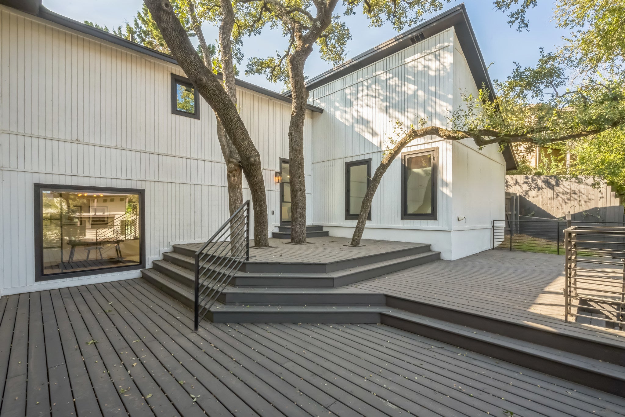 Generous .27-acre lot in close-in Eanes, this FULLY FURNISHED split-level home is a standout for modern living with its custom upgrades and 4 bedrooms + office and 3 bathrooms spread across 3,485 sqft. Close to Downtown, coffee shops, dining, farmers market, and walking distance to acclaimed Eanes ISD schools. Recent upgrades have transformed the home, including: new roof, windows, water heater ,and 3 new HVAC systems, all new doors, all new White Oak plank flooring, all trim, deck, bathrooms, cabinets, appliances, a black marble fireplace, cedar wrapped beams, new modern office with metal and glass wall system, built-in shelving and visually striking dual color kitchen cabinets. The exterior limestone finish has been revitalized with a mortar wash and has been freshly painted. Interior is filled with light, highlighting the highly functional floor plan. Main-level guest room with updated ensuite bathroom and walk-in shower. Spacious Chef's kitchen showcases high end Viking appliances, stunning Quartz countertops, Herringbone pattern subway tile backsplash, breakfast area and center island. Second story houses two more secondary bedrooms, a full bathroom, and private primary suite. This suite features a soaking tub ,walk-in shower, dual vanities, a large closet, and a balcony overlooking the backyard, offering a peaceful retreat. 1,004 sqft attached rear outdoor entertainment area from the kitchen and living has the plumbing, electrical and gas all pre-installed. Privacy landscaping added including clumping Bamboo along the fence line and all new drought-resistant sod and landscaping. Fresh deck with added self-closing gate system. Freshly epoxied and oversized garage (695 sqft) has plenty of space for both 2 cars plus golf cart and storage. This home is turnkey and ready for immediate move-in.