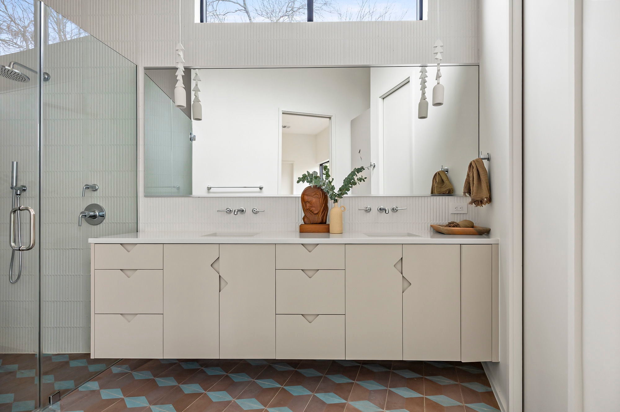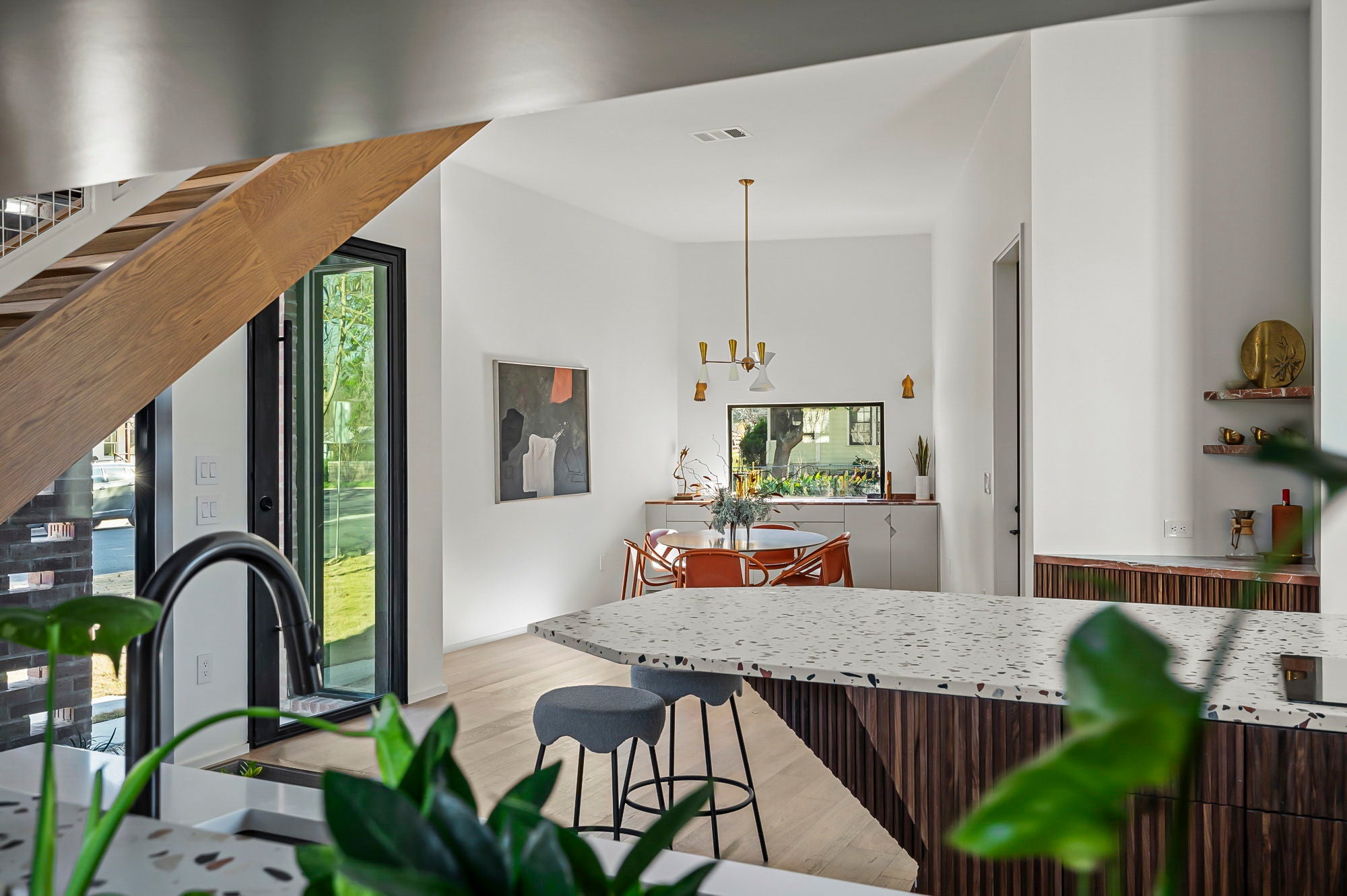 Not your typical spec home - featured on Arch Daily and the Modern Homes Tour - this architecturally significant eclectic home designed by Davey McEathron Architecture with interiors + construction by Cary Paul Studios is completely unique and custom. New construction home in the heart of Zilker blends mid-century modern charm with 70s and Memphis modern influenced interiors. Inside, you'll find a sunken conversation pit, perfect for intimate gatherings, alongside a walnut-clad and terrazzo topped mid-century kitchen peninsula accented by mod floating shelves and warm brick details with a retro planter box. Throughout the home, custom built-ins with an angular motif, boutique lighting, and hand-selected tile create a one-of-a-kind aesthetic.The primary suite is a true retreat, featuring sliding doors to the main-floor deck, and a built-in closet plus a spacious walk-in closet with stackable washer/dryer connections. The primary bath offers spa-like relaxation with a soaking tub, a walk-in shower, and a private toilet closet. The second level has two bedrooms with a jack + jill bath plus a spacious laundry room and a light filled landing with a custom storage cabinet and a reading nook. The large deck with downtown views is a show stopper. Not to be outdone, the third floor has a covered private deck with city views, a lounge area with a custom wet bar + panel ready beverage fridge, a bedroom with a built in bench and a bright modern bathroom.The outdoor spaces are equally breathtaking, with unobstructed downtown cityline views from the expansive second-floor Ipe deck and a private third-floor suite deck.