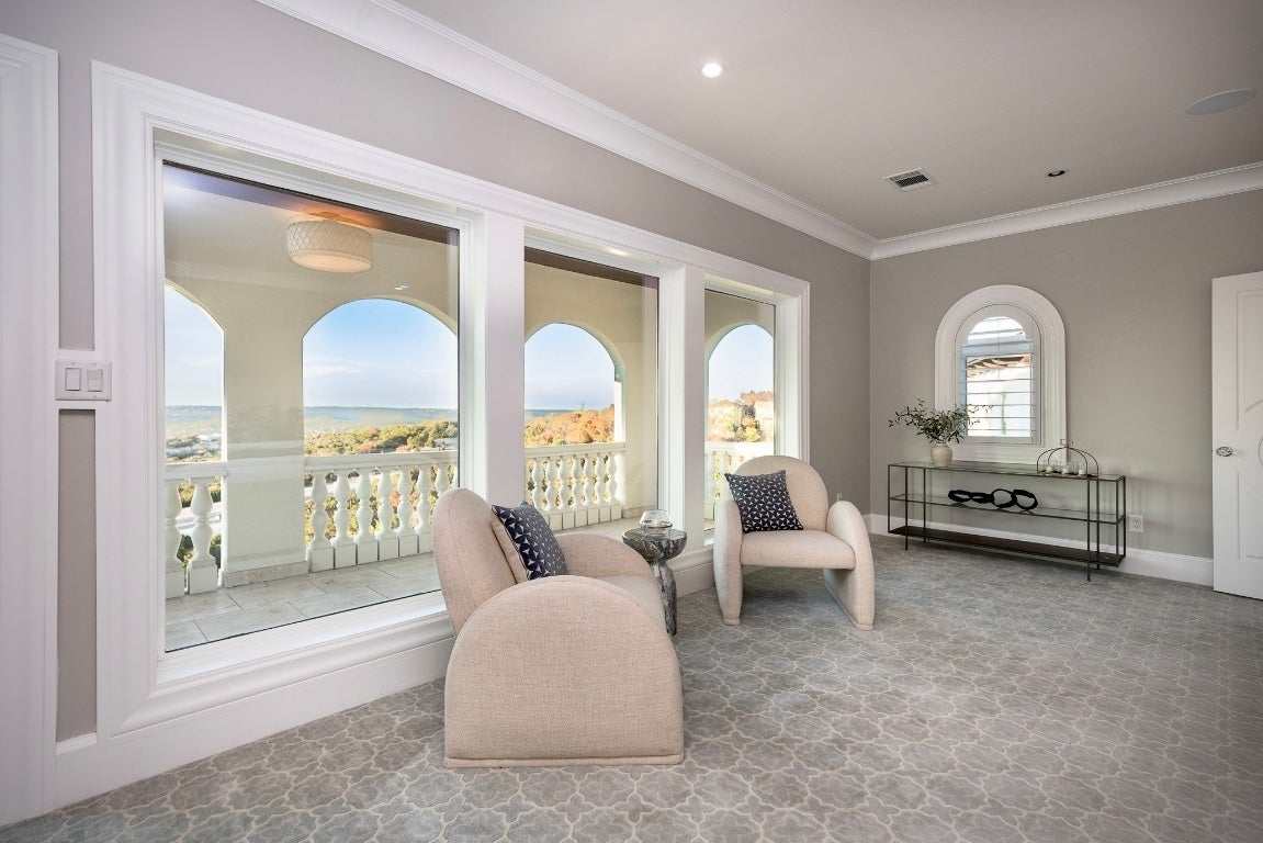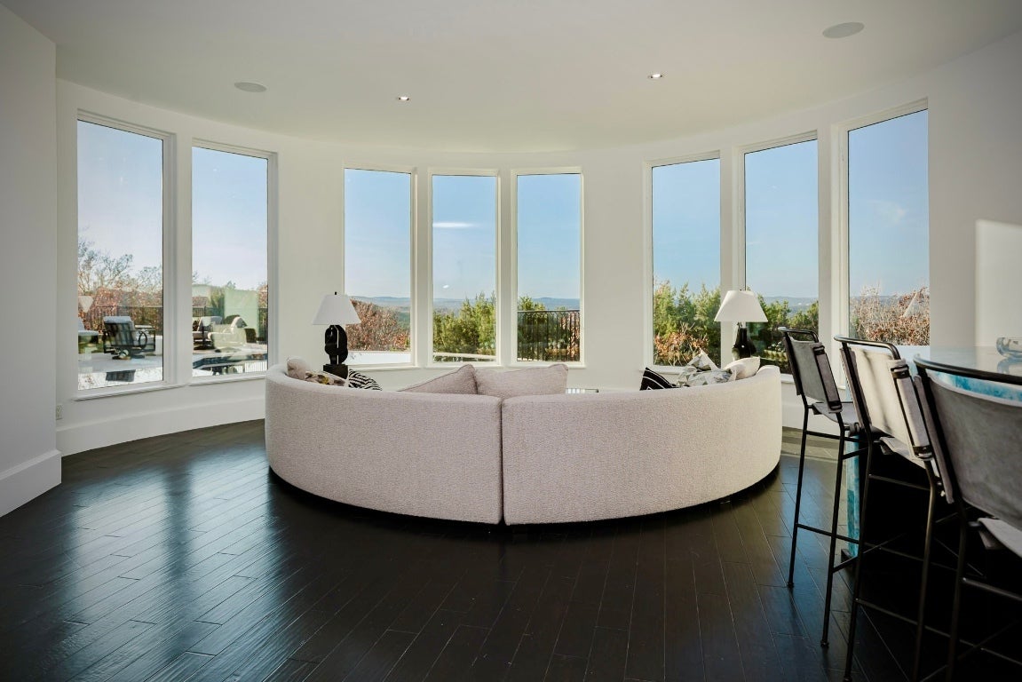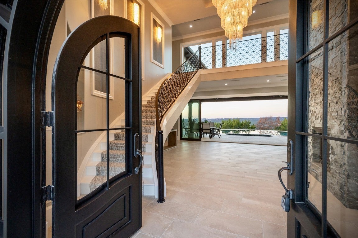 This beautifully designed home sits high above one of Austin’s most desirable communities, Davenport Ranch, on the edge of Westlake Hills, and offers stunning views of the surrounding Texas Hill Country, world-class architecture, and luxury finishes throughout. The dramatic entry features a sweeping staircase and abundant windows that fill the home with natural light, creating an immediate and inviting first impression. An open floor plan unfolds gradually, revealing a series of well-designed spaces: a cozy covered porch overlooking the spa, expansive Hill Country views, a nearly nightclub-sized bar and game room, a theater room with sunken seating, a study, a guest room, and more. The main level also includes a wonderful kitchen, living room, and dining area that works equally well for everyday living and entertaining. Upstairs, the home offers an enormous primary suite with a large walk-in closet, covered terrace, and a luxurious dressing area. A separate sleeping wing includes three additional bedroom suites and an oversized game room, providing privacy and flexibility. Above the three-car garage is a private one-bedroom, one-bath apartment with its own living room and kitchen, ideal for guests or extended stays. The home sits on approximately 2.6 acres, offering exceptional space and flexibility for future customization in accordance with HOA guidelines.