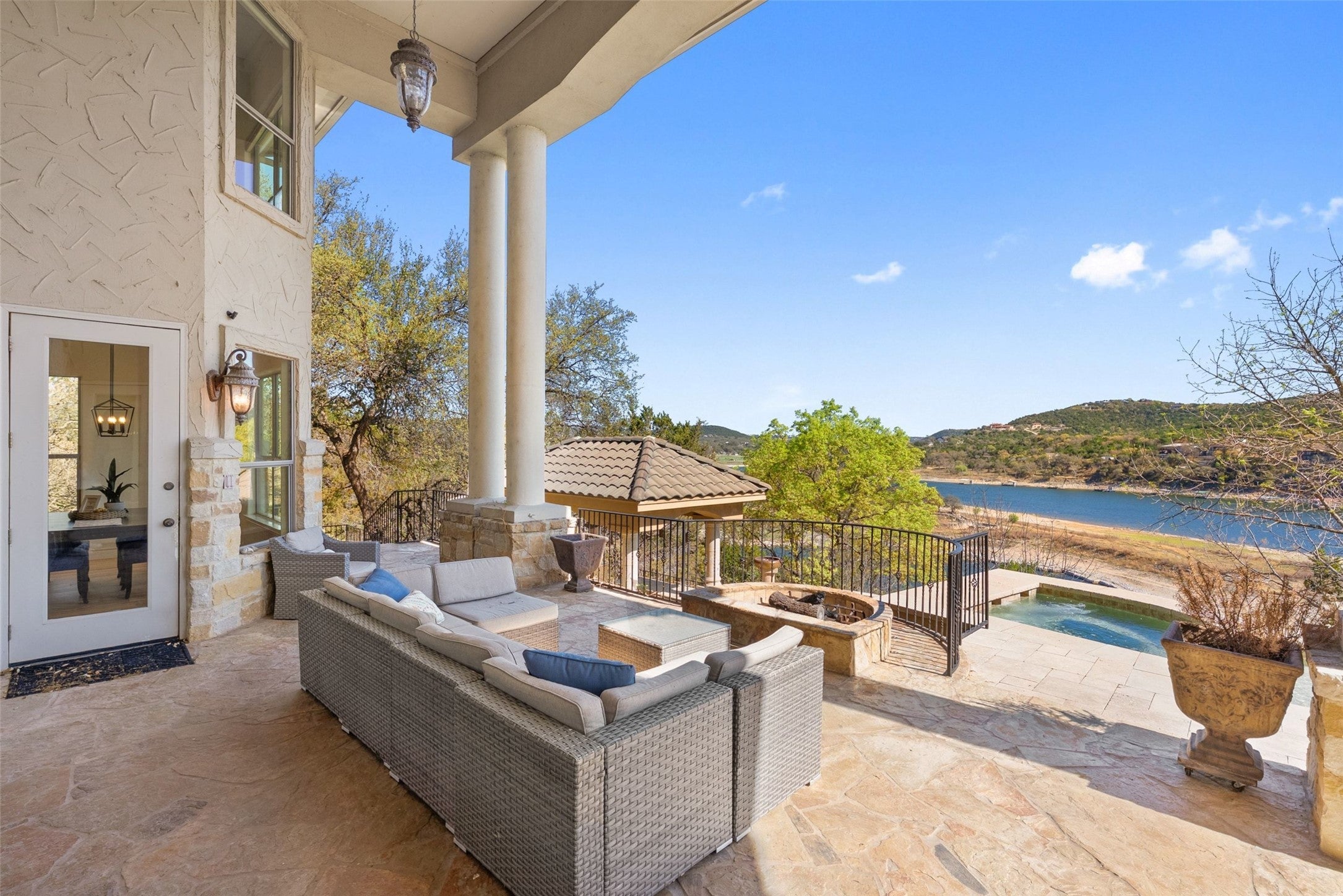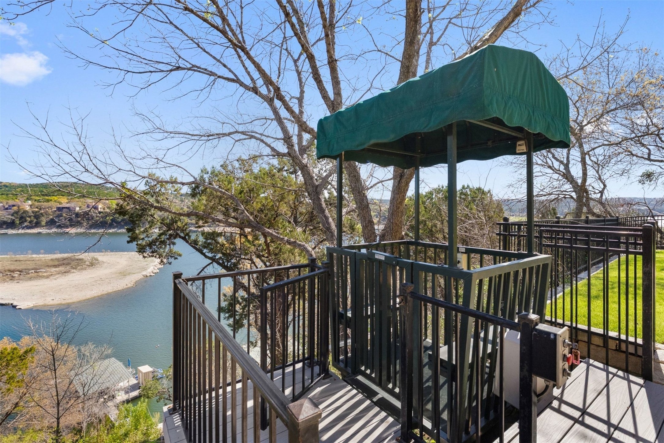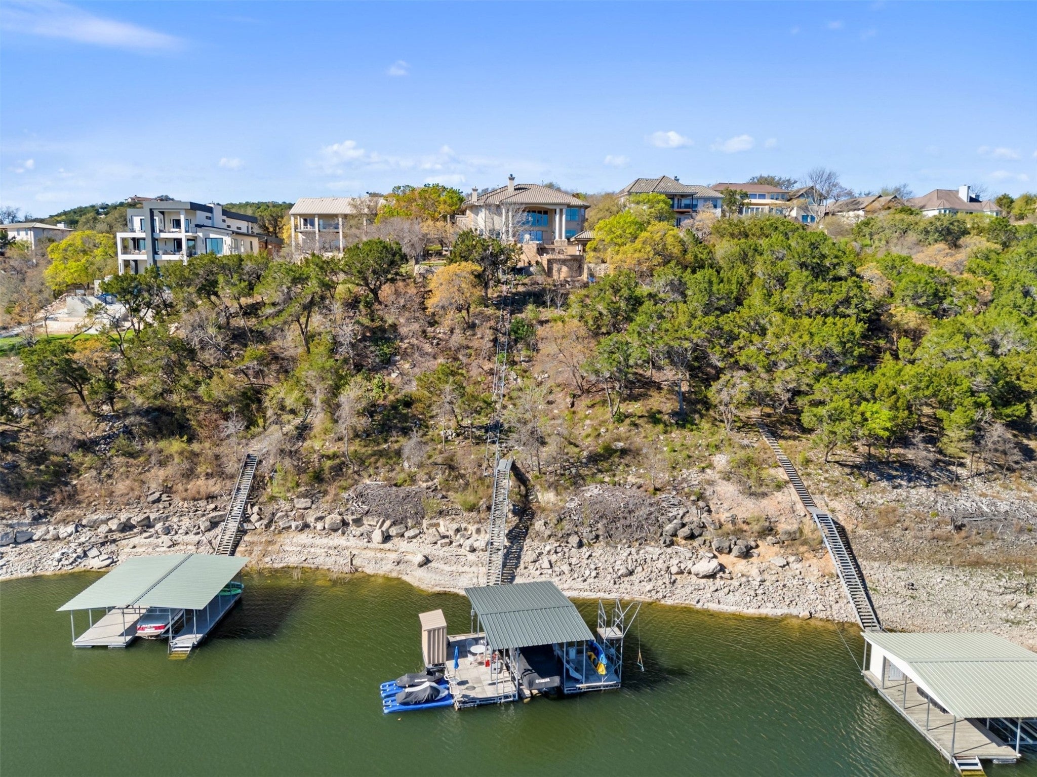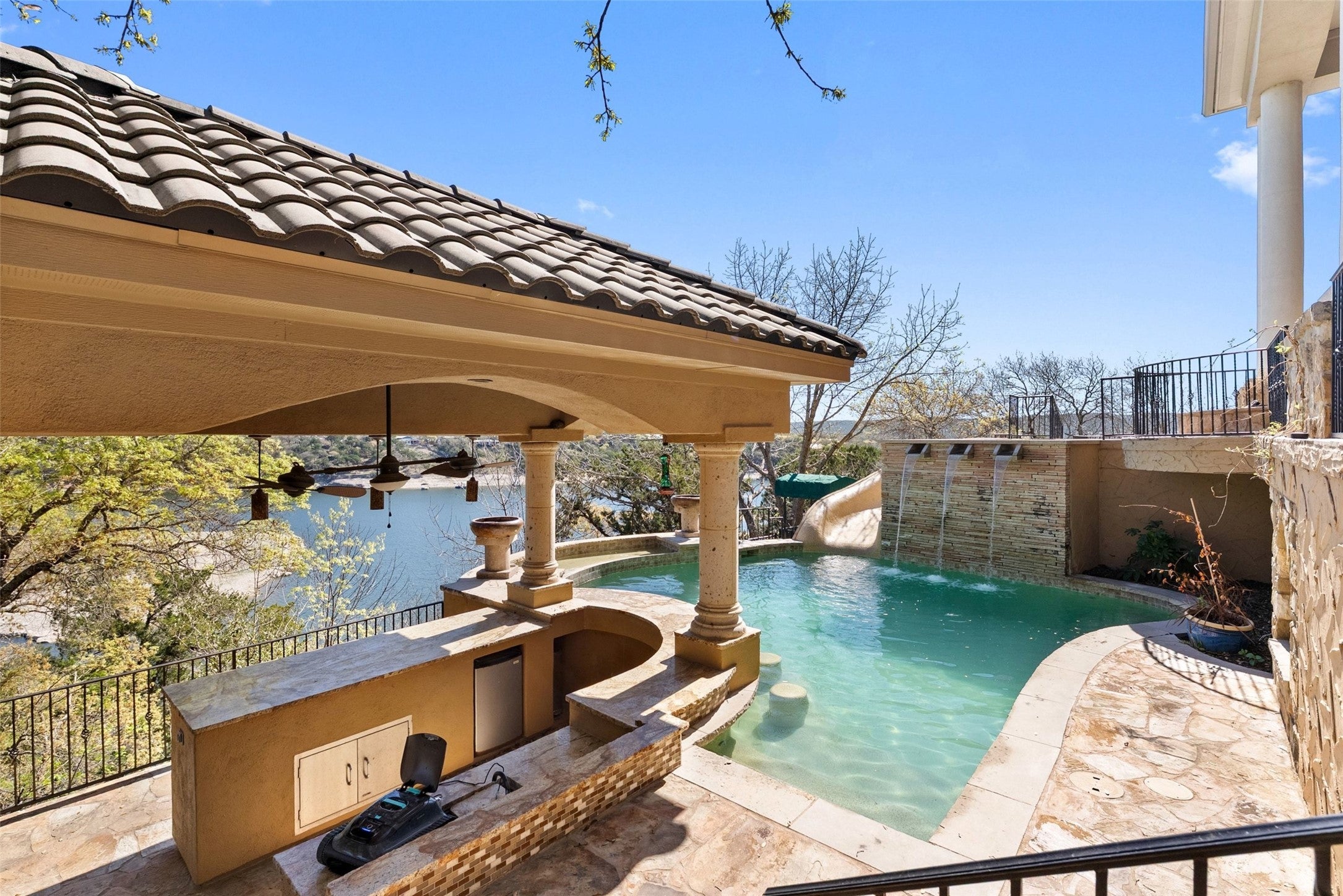 Private Lake Travis retreat with tram access, covered dock, and resort-style outdoor living just minutes from Cedar Park. A covered tram carries you from the home down to the floating dock, where a HydroHoist boat lift and three jet ski lifts are ready for full days on the water. The backyard feels like a private lakeside resort. A heated pool overlooks the water, while new Trex decking connects outdoor spaces from the pool terrace to the dock entrance. The covered patio is designed for entertaining with a full outdoor kitchen featuring granite countertops, gas grill hookups, sink, and a swim-up bar that keeps the conversation going. Inside, expansive windows fill the home with natural light and showcase east-facing Lake Travis views. The open living room anchors the home with a floor-to-ceiling stone fireplace, built-in cabinetry, and seamless access to outdoor spaces. The kitchen is designed for gathering with abundant granite workspace, center island, brick-accent cooktop surround, built-in ovens, double sinks, and a large walk-in pantry. A spacious owner’s suite offers lake views, patio access, fireplace, and a spa-inspired bath with dual vanities, soaking tub, and oversized shower. Game room, media space, oversized bedrooms, and three-car parking complete this thoughtfully designed Lake Travis waterfront home built for entertaining, relaxing, and enjoying life on the water.