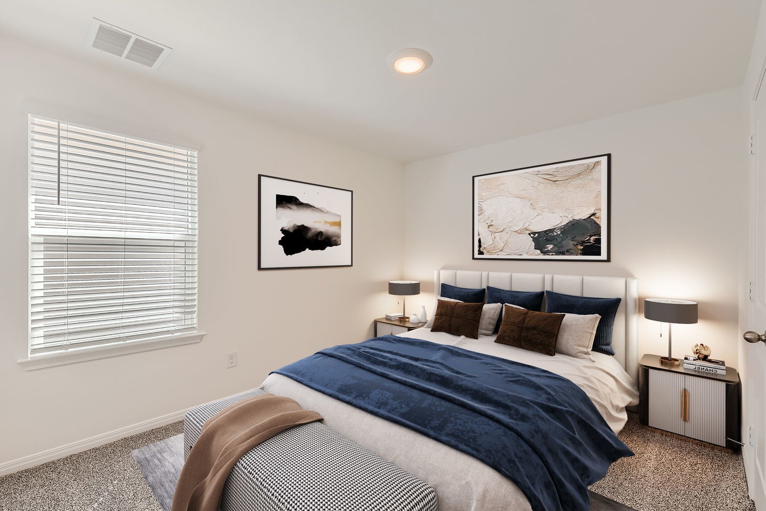 Gorgeous home with all the bells and whistles on a private street. This single-level residence offers 1,535 square feet of thoughtfully designed living space, featuring 3 bedrooms, 2 bathrooms, and a 2-car garage. Enter through the lushly landscaped entryway into a spacious family room that opens seamlessly to the kitchen and dining area—perfect for everyday living and entertaining. The kitchen boasts quartz countertops, stainless steel appliances (refrigerator included), recessed lighting, and a center island for additional prep and gathering space. The private primary suite features a generous walk-in closet and a walk-in shower. Secondary bedrooms are well-sized, each with carpeted floors and ample closet space. Step outside to a spacious backyard with an expansive lawn—ideal for relaxing, entertaining, or accommodating pets. Irrigation system throughout for easy maintenance. Enjoy comfortable, easy living in a beautifully maintained home.