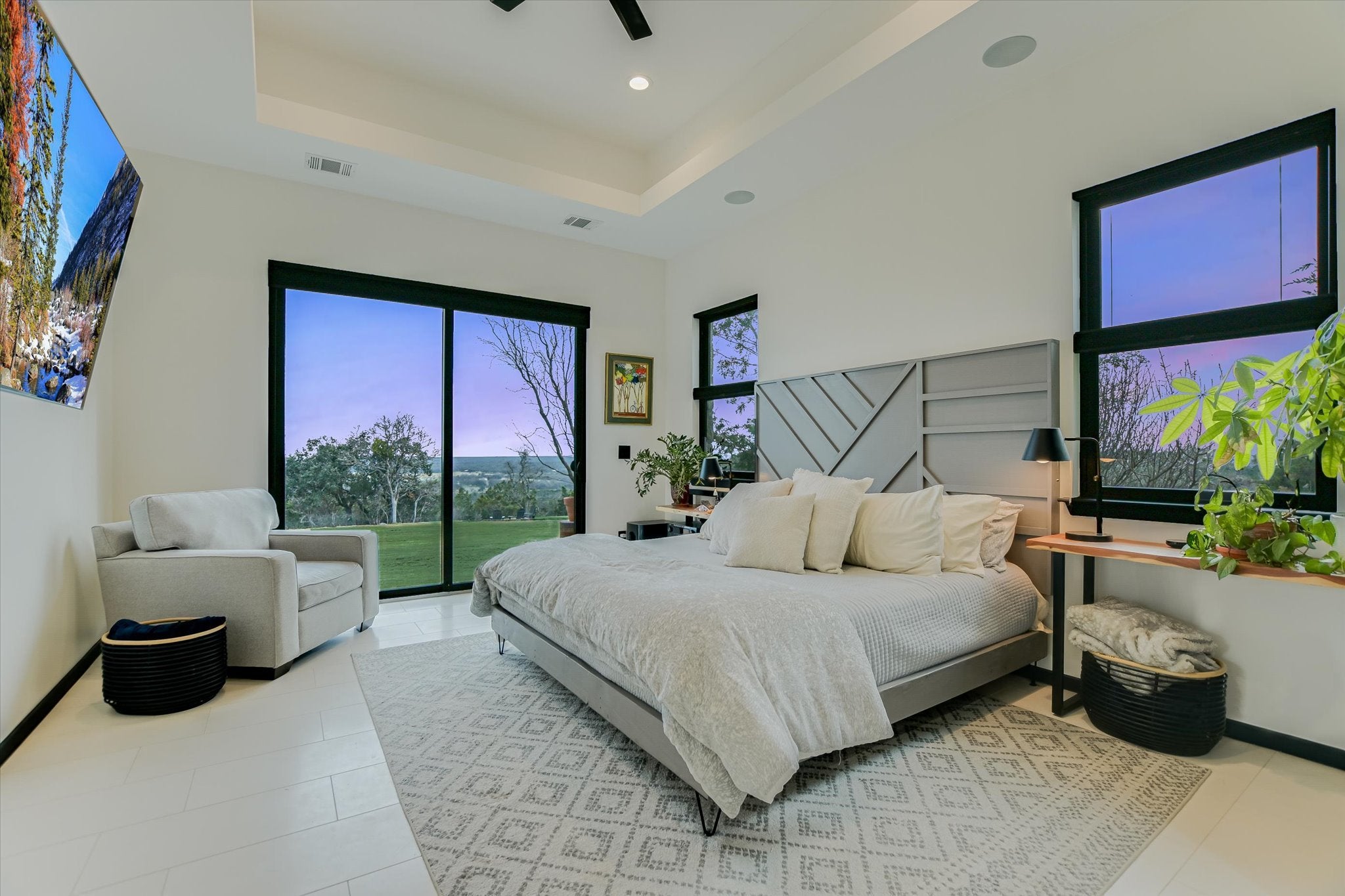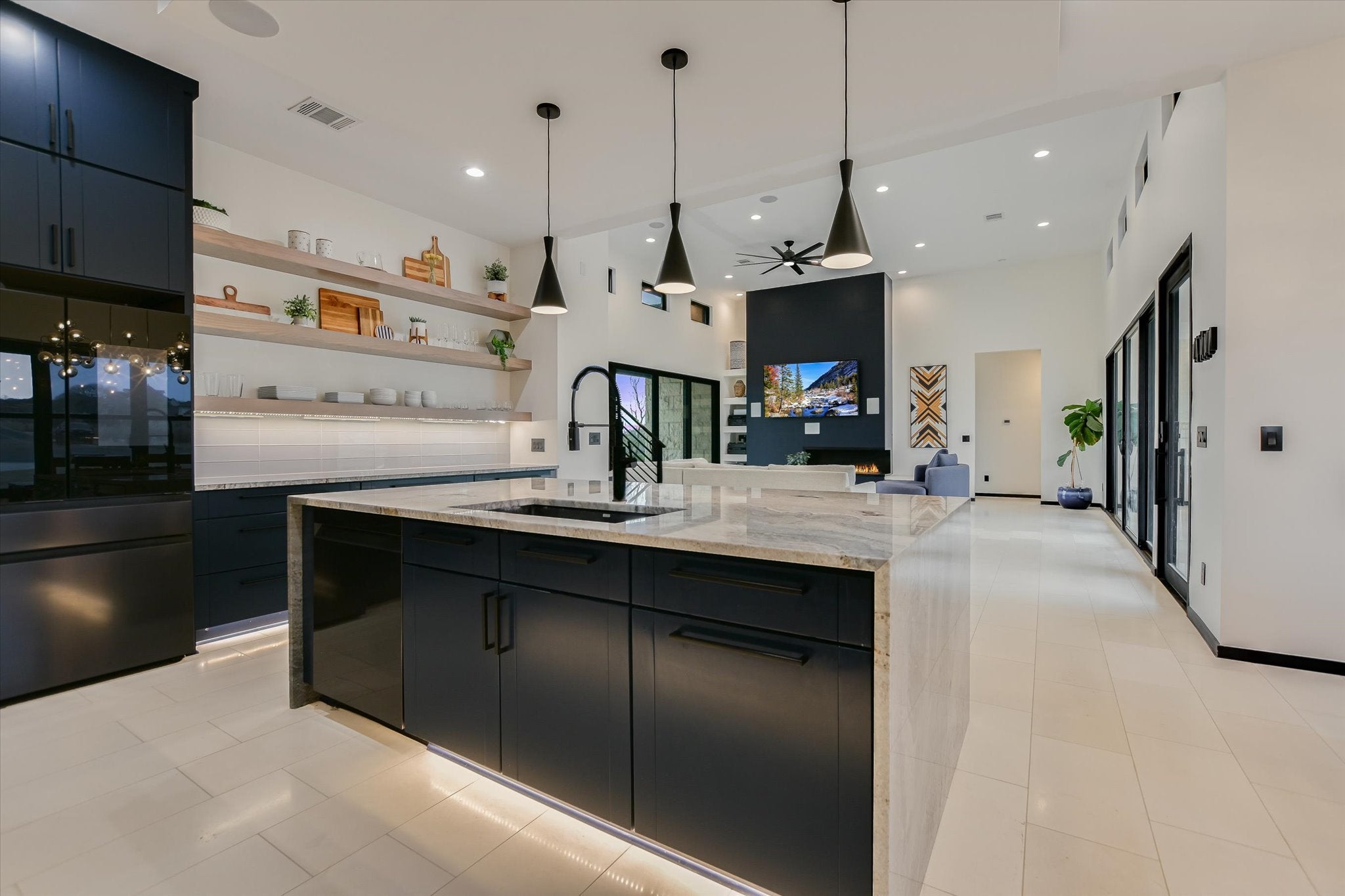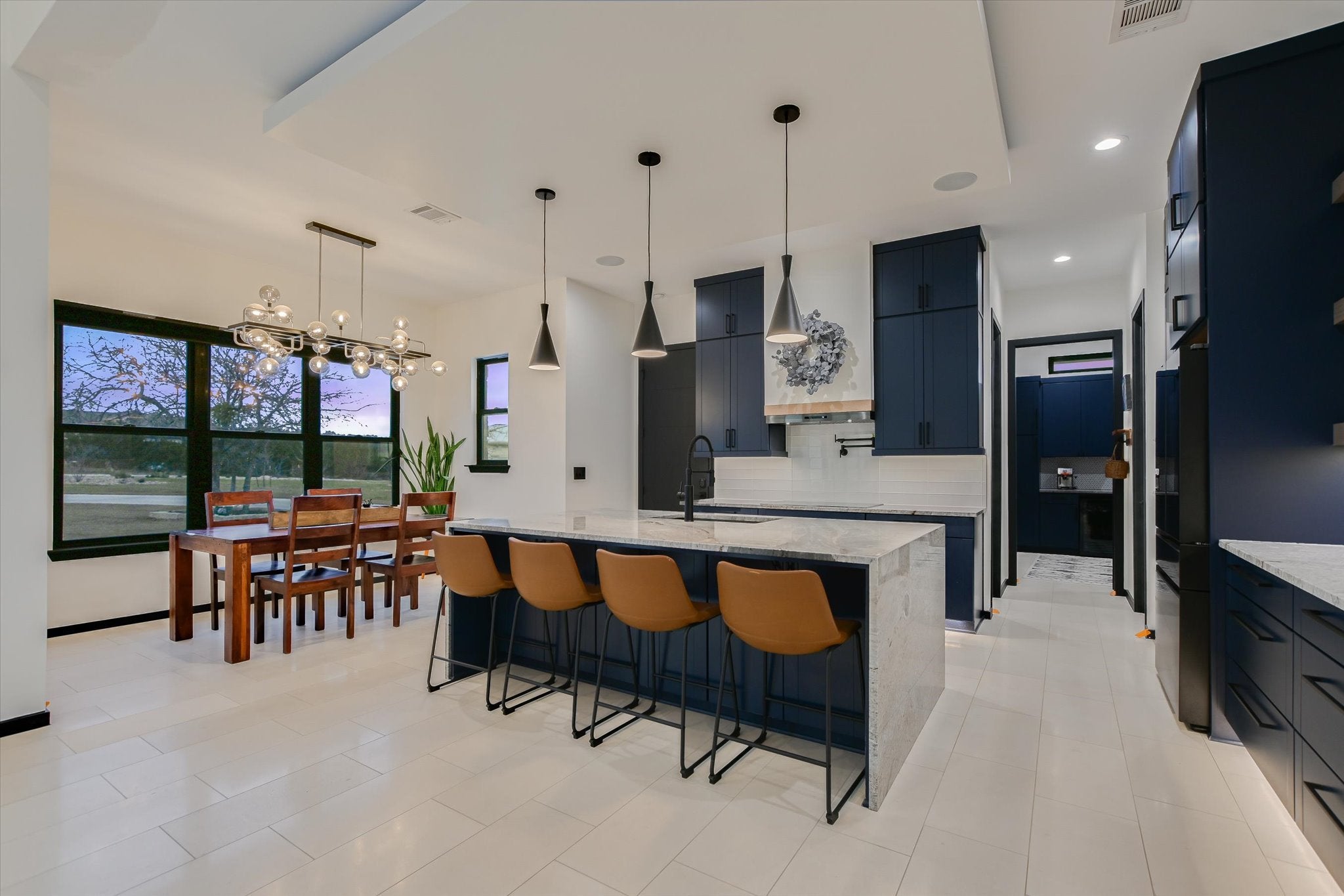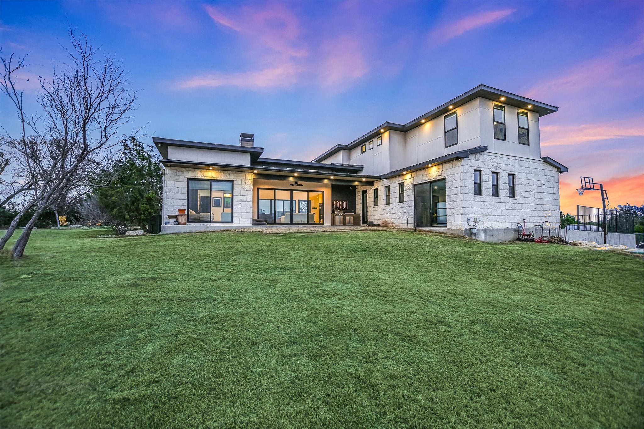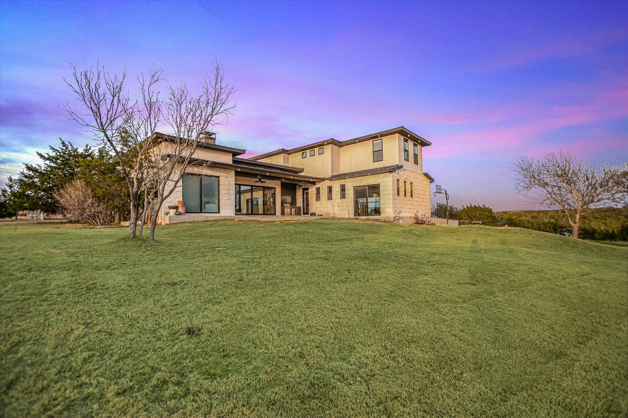 Designed as the builder’s personal residence, this 5-bedroom, 3.5-bath estate rests on two private acres and captures some of the most majestic, uninterrupted views in the Texas Hill Country. Built in 2020, the home blends strength, sophistication, and thoughtful design. Soaring ceilings anchor the main living area, where a statement fireplace and 7.1 surround sound create a cinematic atmosphere. Expansive windows — tinted and fitted with solar screens — provide privacy without sacrificing the view. The kitchen is both art and function. Waterfall countertops cascade with clean lines. Floating shelves and a custom vent hood add architectural interest. A generously sized walk-in pantry keeps everything effortlessly organized. Just beyond, the first-floor laundry room doubles as a curated coffee bar space. The primary suite is a retreat unto itself. Located on the main level, it offers its own fireplace and 5.1 surround sound for an elevated, resort-style experience. The spa-inspired bath showcases floating cabinetry, custom granite accents, and abundant storage. Upstairs, four additional bedrooms and two baths surround a versatile flex space currently designed as a game room — ideal for entertaining or relaxed family living. Throughout the home, limestone and bamboo flooring provide seamless flow — no carpet. A custom batting cage, full irrigation system, and lower-level parking area further elevate the estate’s functionality. Brand new private in-ground pool & hot tub will be completed by June!