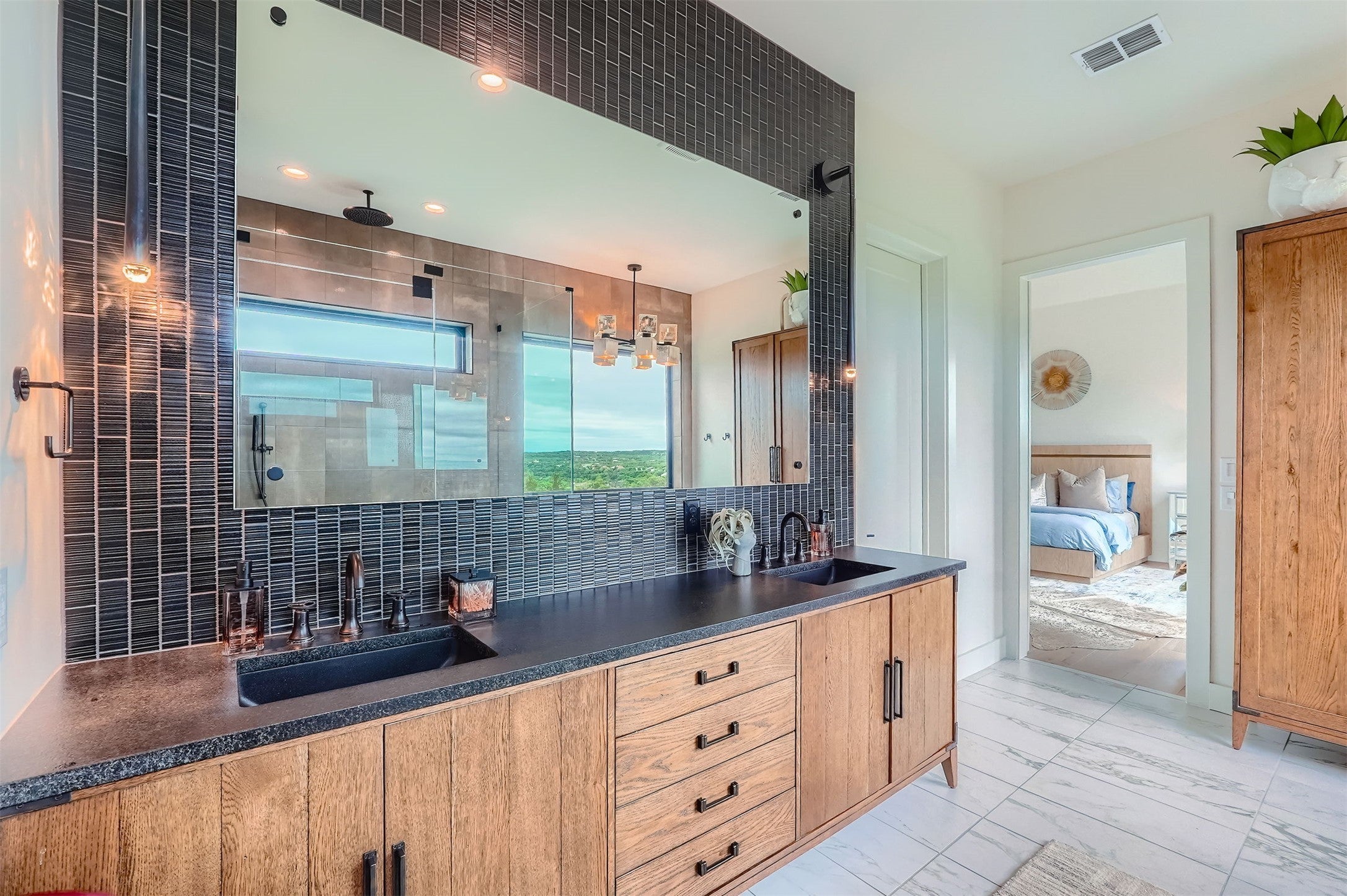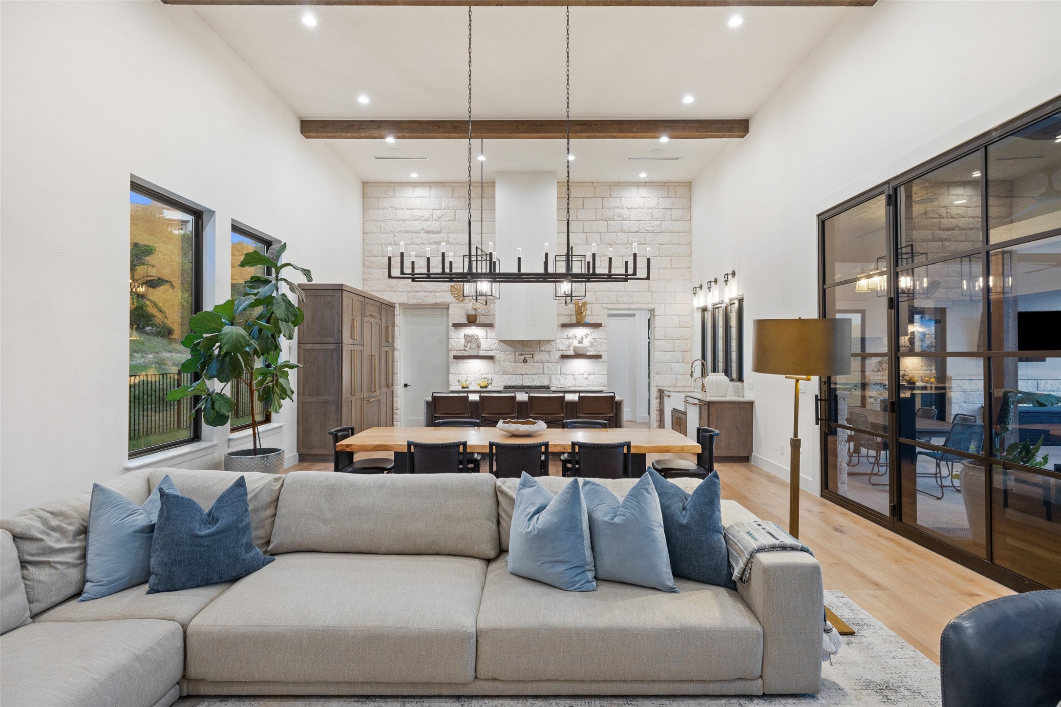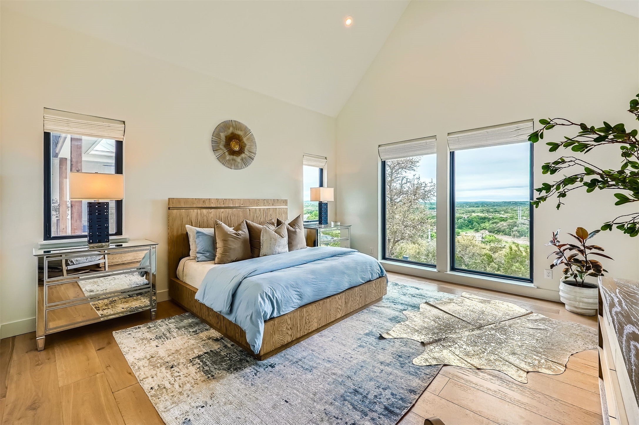 Hill Country modern home with custom-built luxury in the prestigious gated community of Tierra Vista in Spicewood. This rare single-story home, spanning 3,638 SF, was meticulously and thoughtfully designed with impressive features throughout. The spacious floor plan features 4 bedrooms, 4 full baths, a dedicated office, and a game room. The primary suite is a true retreat, boasting a vaulted ceiling and elegant Restoration Hardware lighting. Cook with ease in the kitchen, which features quartzite countertops and a Luxury line of appliances with unique rose gold handles. Cleanup is a breeze with double dishwashers. The home also includes a water softener and a reverse osmosis system. Throughout the home, you'll find custom window treatments, designer lighting, with fabulous iron doors at the entry. Step outside and enjoy the outdoor space to entertain, with a custom pool and spa, panoramic Hill Country and sunset views provide the perfect escape. A built-in outdoor kitchen, which overlooks the pool, the Pedernales River, and the stunning surrounding landscape. Minutes from Lake Travis premier Pace Bend Park with deep water boat ramps, scenic hiking & biking trails, Briarcliff full-service marina, luxury shopping and dining. Renowned Lake Travis ISD schools.