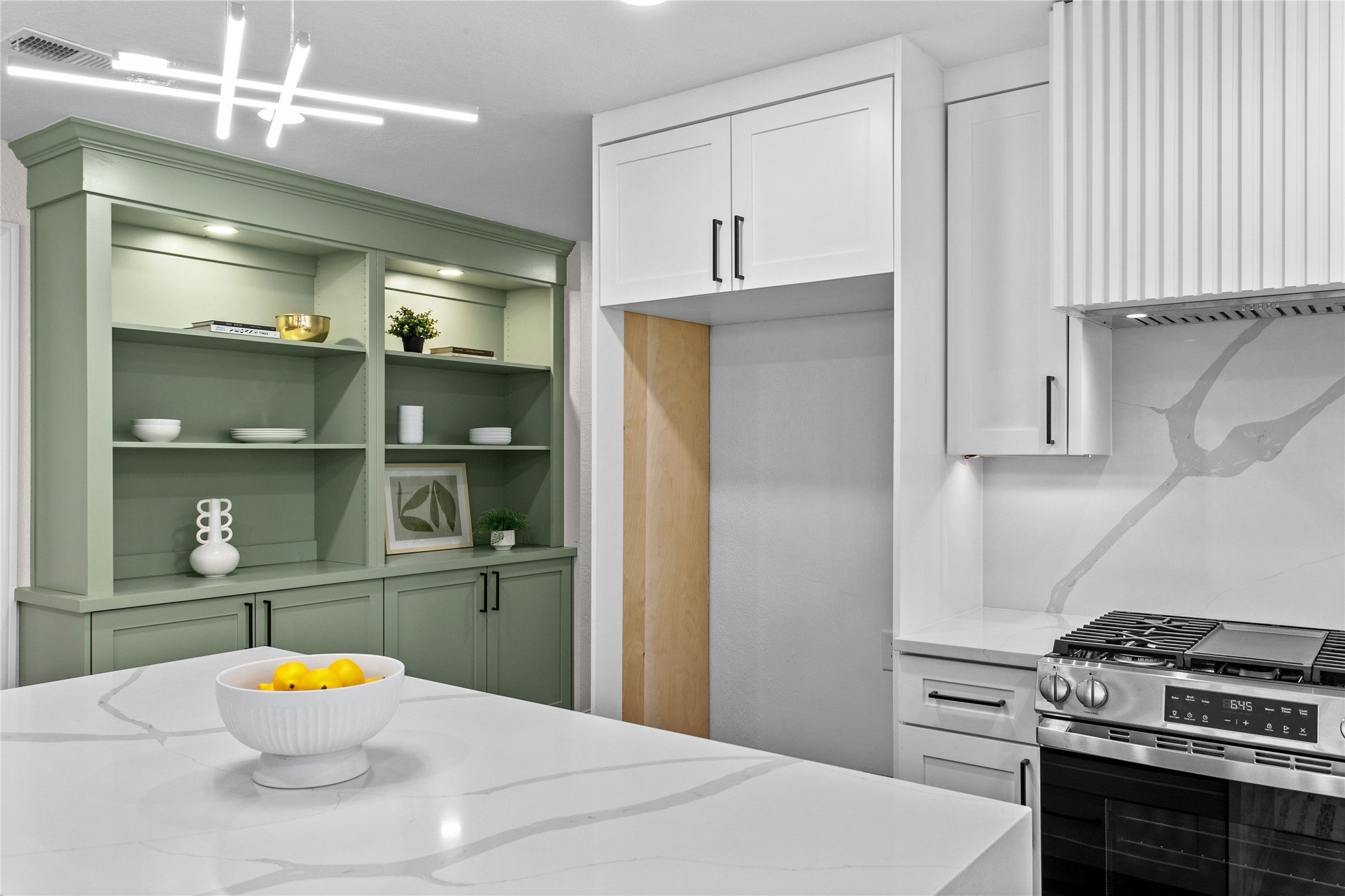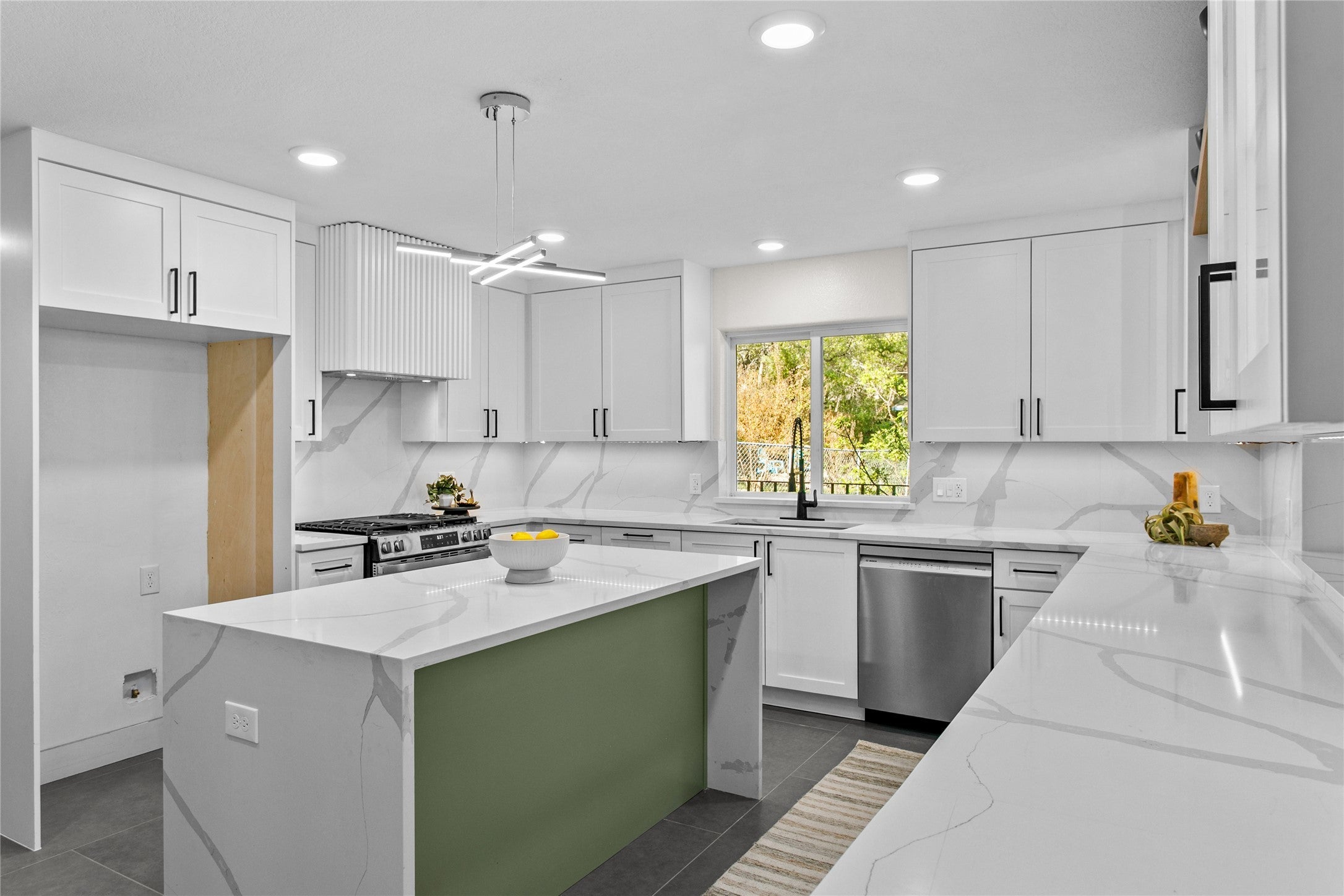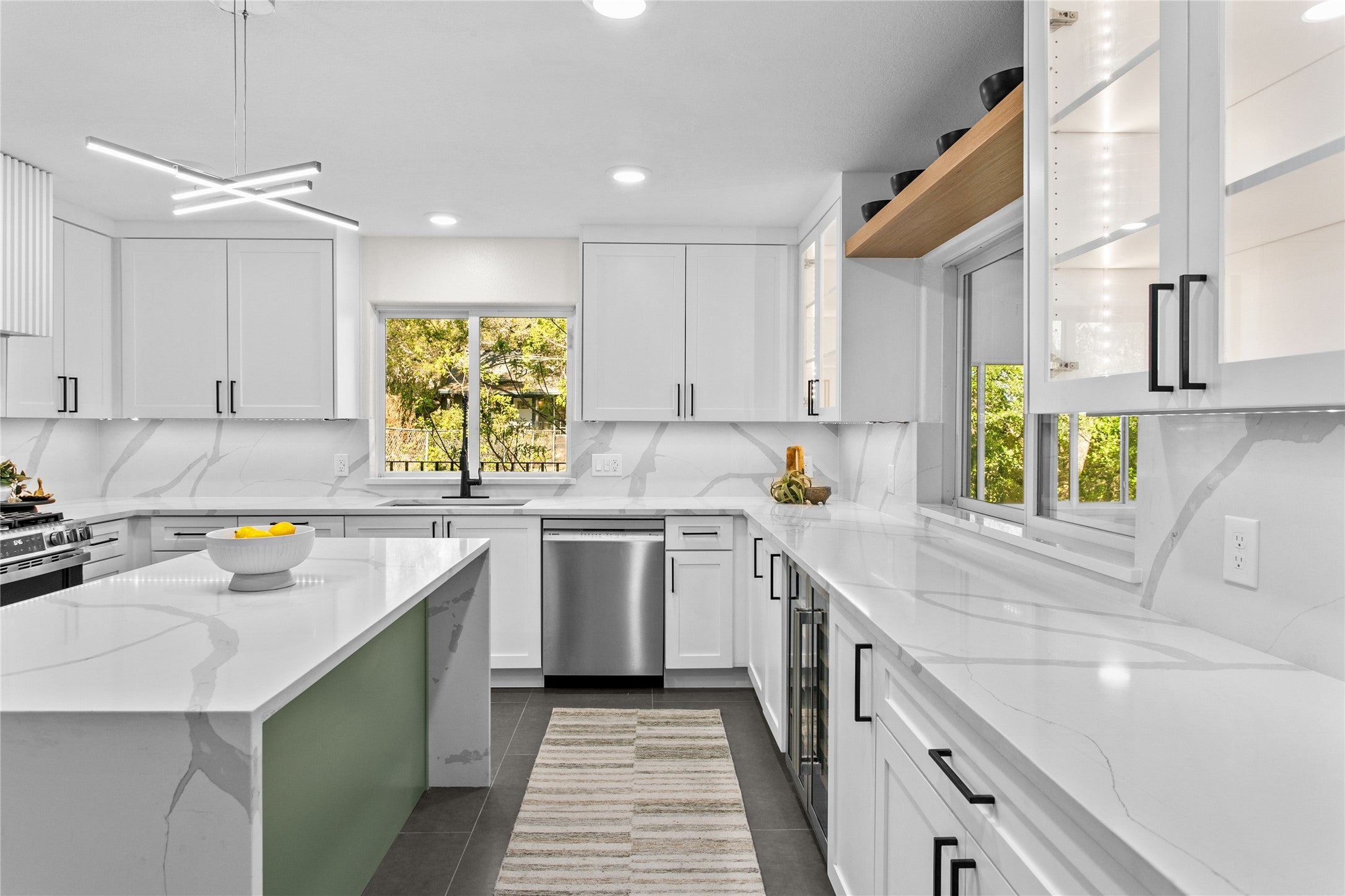 - Dishwasher, Free-Standing Gas Range, Microwave, Wine Refrigerator