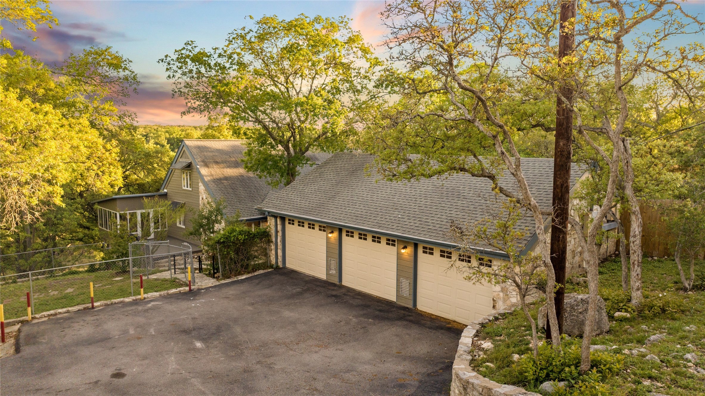 Tucked away in the highly desirable Fitzhugh Place community, this private and peaceful property offers a rare blend of Hill Country charm and modern updates. Backing directly to Barton Creek and neighborhood greenspace, the setting delivers incredible views, mature oak trees, and a sense of seclusion that’s hard to find. Originally built in 1991, the main home has been fully renovated to maximize natural light and showcase the surrounding landscape. Inside, you’ll find an inviting layout featuring 4 bedrooms, 3 full baths, a private office, formal dining room, spacious family room, and an oversized sunroom perfect for enjoying the views year-round. sqft includes the 3,173 main home and 700 sqft The fully fenced property includes an automatic gate for added privacy and convenience. In addition to the main home, there’s a charming 1-bedroom, 1-bath guest house with its own private yard—ideal for guests, extended family, or potential rental use. Additional improvements include a detached 3-car garage, RV carport, and a large storage building/well house. From its unique design to its unbeatable setting and access to top-rated schools, this is a one-of-a-kind property that truly has it all.