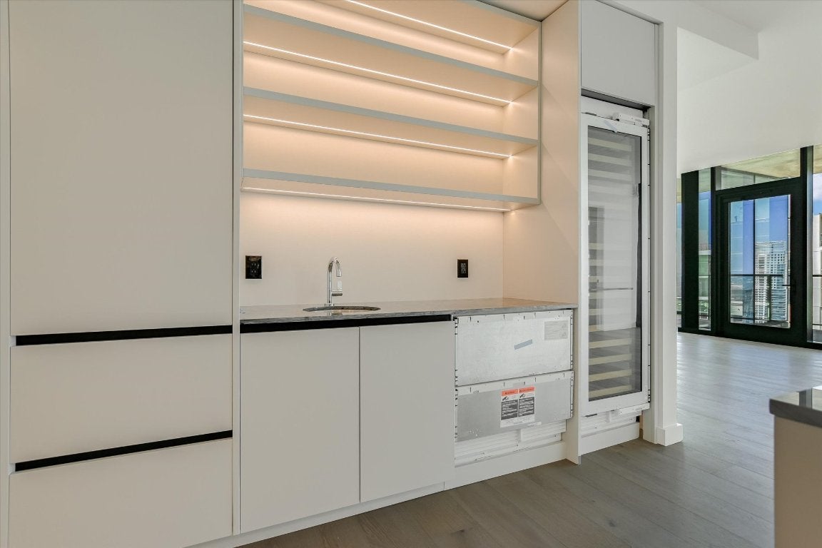 Luxury redefined in this expansive residence situated on the southwest corner of The Modern. Featuring over 3,800 sq ft, this thoughtfully designed 5 bed, 5.5 bath residence with soaring views of Lady Bird Lake and the Austin skyline offers the very best of urban living. Floor-to-ceiling glass frames stunning sunset, city and hill country vistas, along with two sprawling covered balconies. The chef-inspired kitchen features dark quartzite natural stone countertops and full height backsplash, Italkraft cabinetry, high-end appliances including SubZero refrigerator, Wolf six-burner range and microwave, and Bosch dishwasher. Entertain with ease with the beautifully designed wet bar equipped with SubZero 86-bottle wine fridge with LED lighting and separate temperature controls, refrigerator drawer and freezer drawer with ice maker, and lighted shelving. The elegant primary bath is a welcome oasis showcasing a curated selection of designer tiles, walk-in shower and soaking tub, dual vanity with backlit mirrors and expansive walk-in closet. Three of the secondary bedrooms feature en-suite baths for added privacy. Additional highlights include AV upgrades, hardwood + tile flooring and two premium reserved parking spaces. Residents will enjoy over 19,000 sq ft of curated amenities across three levels, including a 25-meter pool and spa, indoor and outdoor lounges with private dining areas, catering kitchen and gas grills, fitness center and yoga studio, dog park and wash station, board rooms and business center, sky lounge, guest suites, and 24/7 concierge service. Perfectly positioned in the Rainey Street District, The Modern offers unmatched access to Austin’s best restaurants, nightlife, and the scenic trail along Lady Bird Lake.