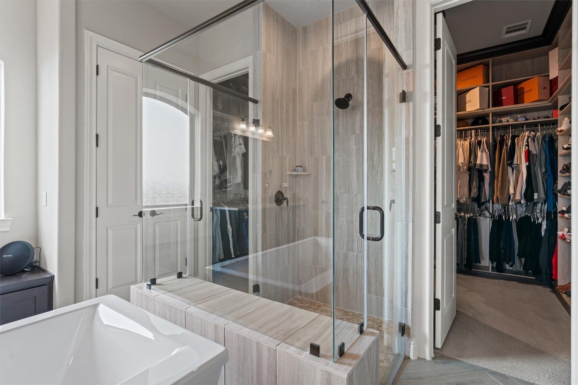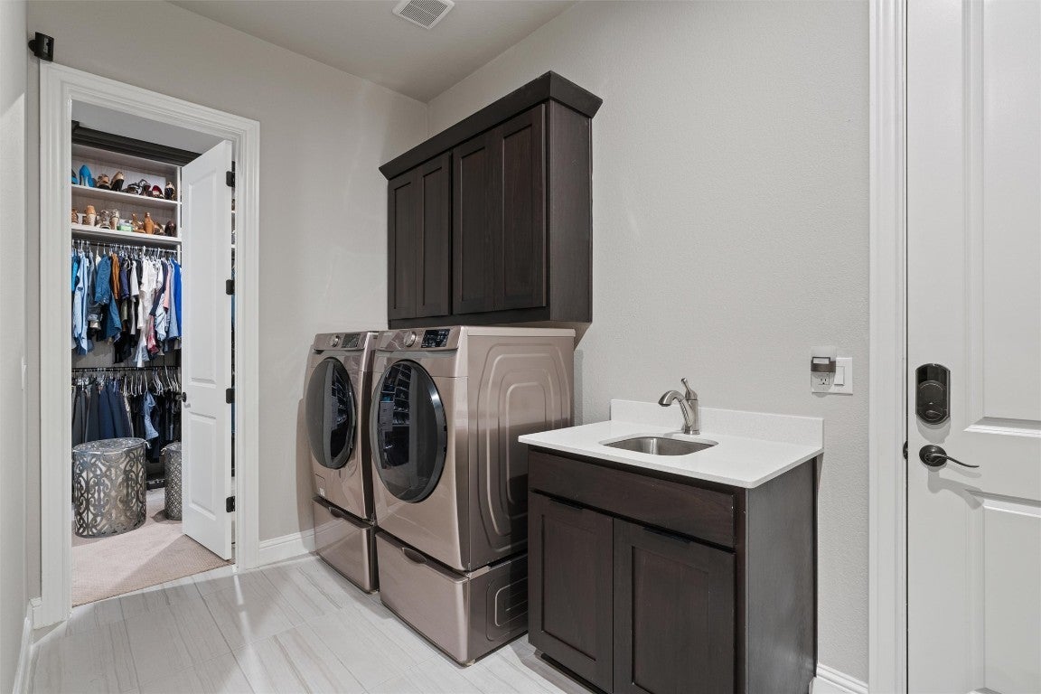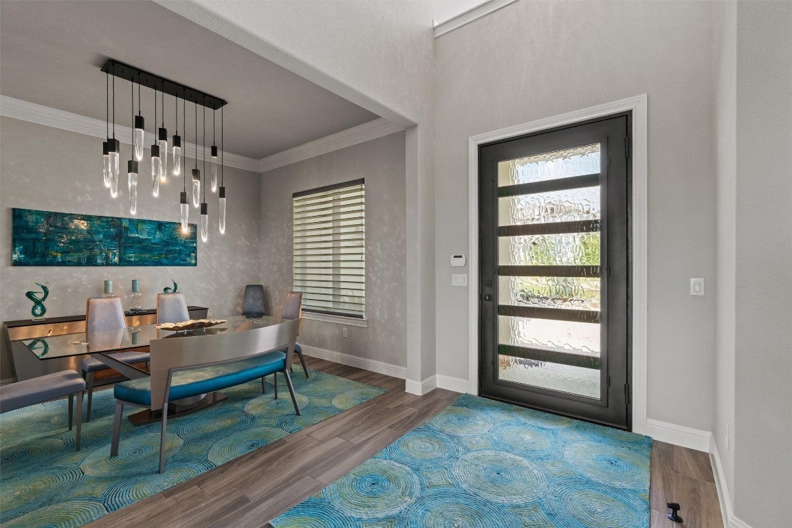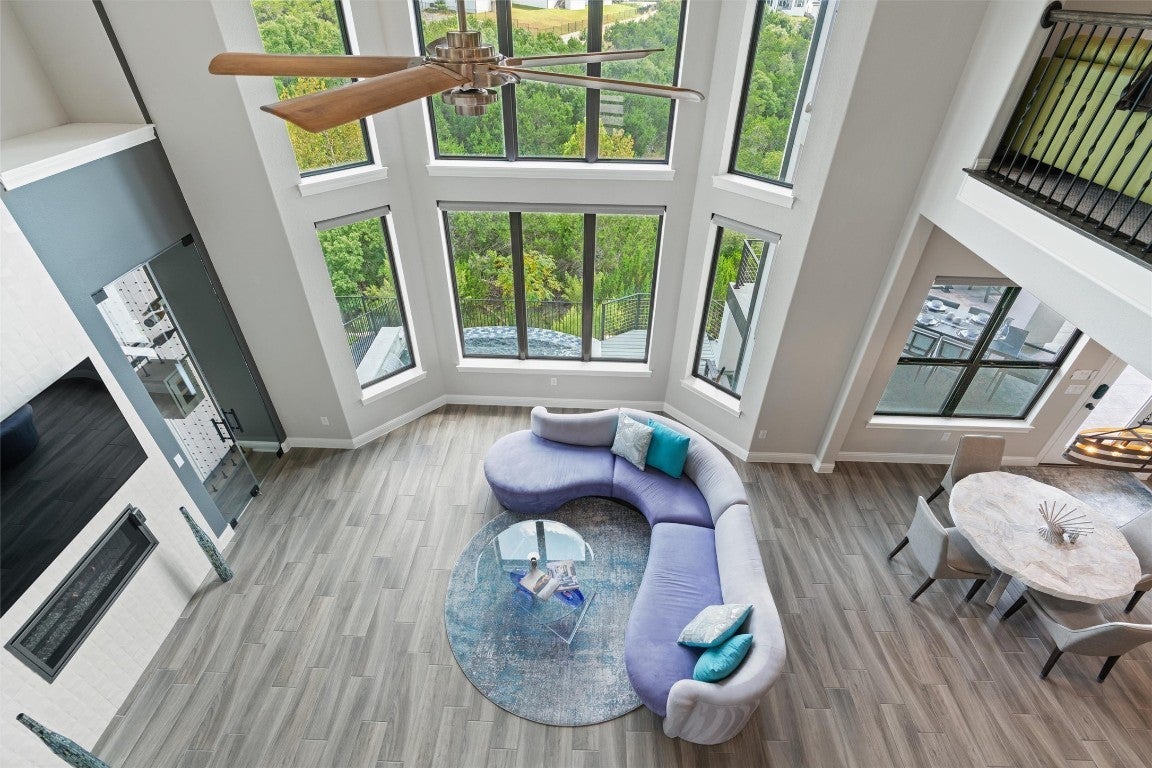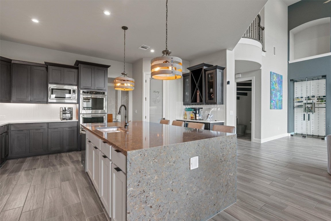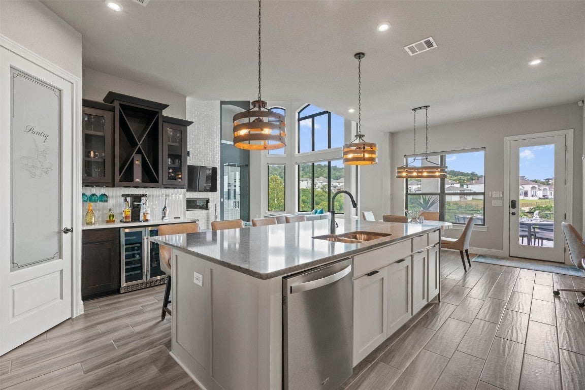 New roof installed in 2025 + Experience contemporary Elegance with Uninterrupted Views - This extraordinary Toll Brothers residence showcases thoughtful design and extensive upgrades throughout. Positioned against a permanent greenbelt, the property delivers panoramic views from multiple rooms. + The main level features an expansive primary suite designed for privacy and indulgence, with a spa-like bath offering a deep soaking tub, oversized walk-in shower, and custom dressing room that connects directly to a spacious laundry area. A secondary bedroom with its own en-suite bath and a custom-designed powder room also occupy the first floor. + Entertaining flows effortlessly thanks to two wine walls (one climate-controlled), a built-in bar, and a contemporary chef’s kitchen equipped with dual ovens, a five-burner cooktop, an oversized island, and generous counter and storage space. Upstairs, a large loft—already plumbed for an additional bar—sits beside a fully customized theater for true cinematic experiences at home. + The outdoor living spaces are equally impressive. Multiple terraces and an oversized spa take advantage of the protected green space beyond, ensuring unobstructed views across three levels – and from the spa. The outdoor kitchen completes the well thought-out space. + Residents of Travisso enjoy resort-style living with access to two premier amenity centers. The Palazzo Clubhouse offers a fitness center, resort pool with splash pad, lighted tennis courts, and playgrounds, while the new Forum Amenity Center features a lap pool, bocce and basketball courts, a recreational pond for kayaking, zip line, and indoor wellness spaces. Miles of hike-and-bike trails wind through parks and open green space, connecting neighbors to the outdoors. Just minutes from the Texas Hill Country, Travisso combines modern amenities with the natural beauty of one of Central Texas’ most scenic landscapes. + Travisso is zoned to the popular Leander ISD.