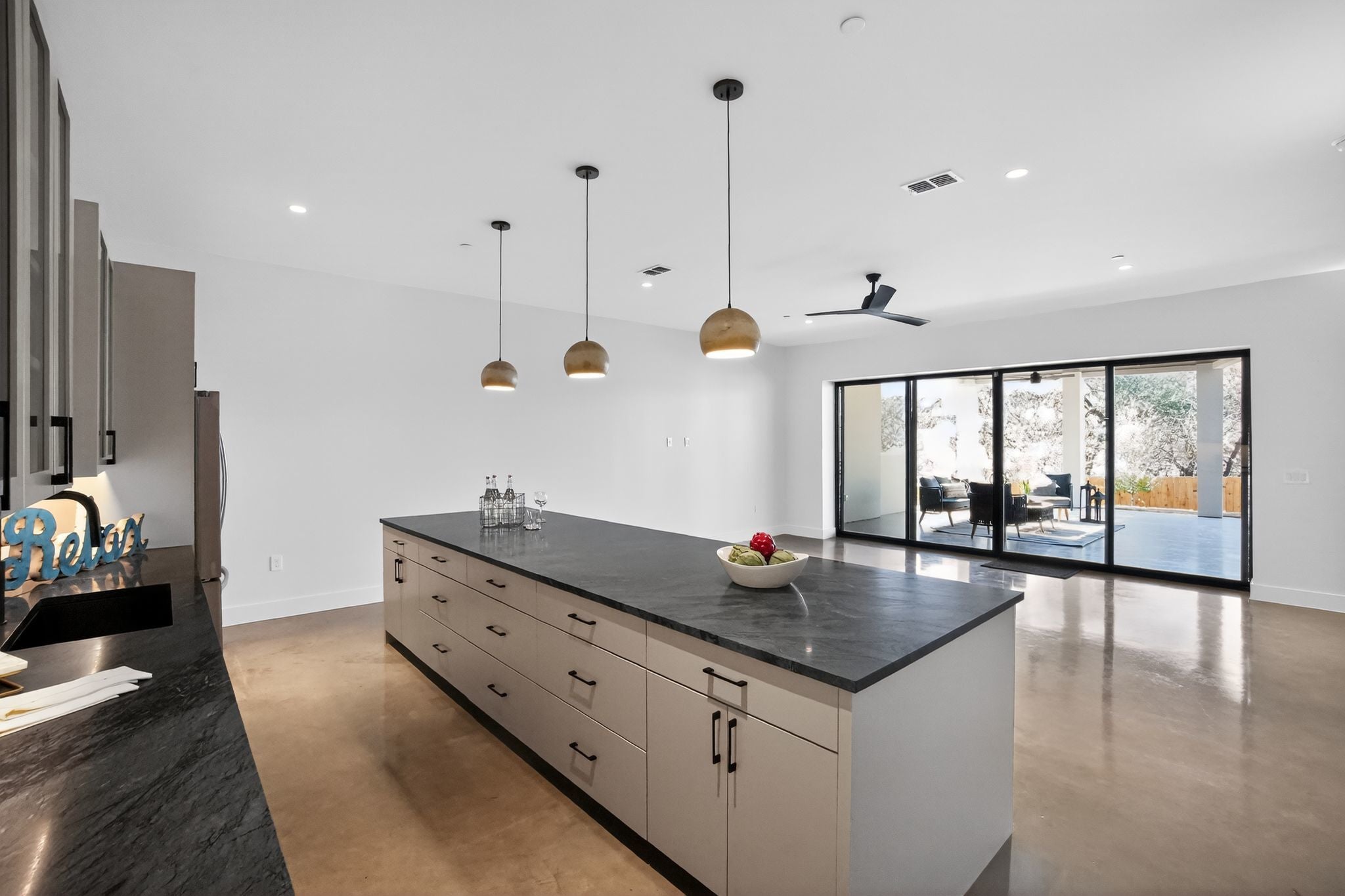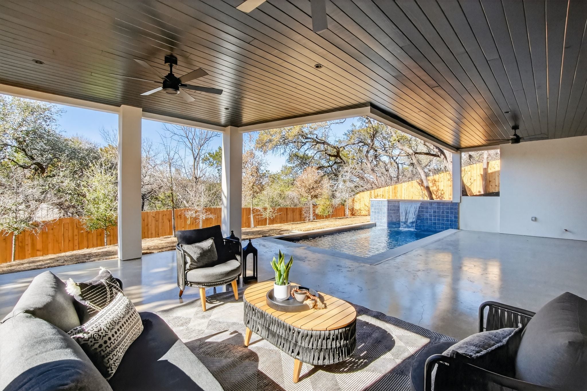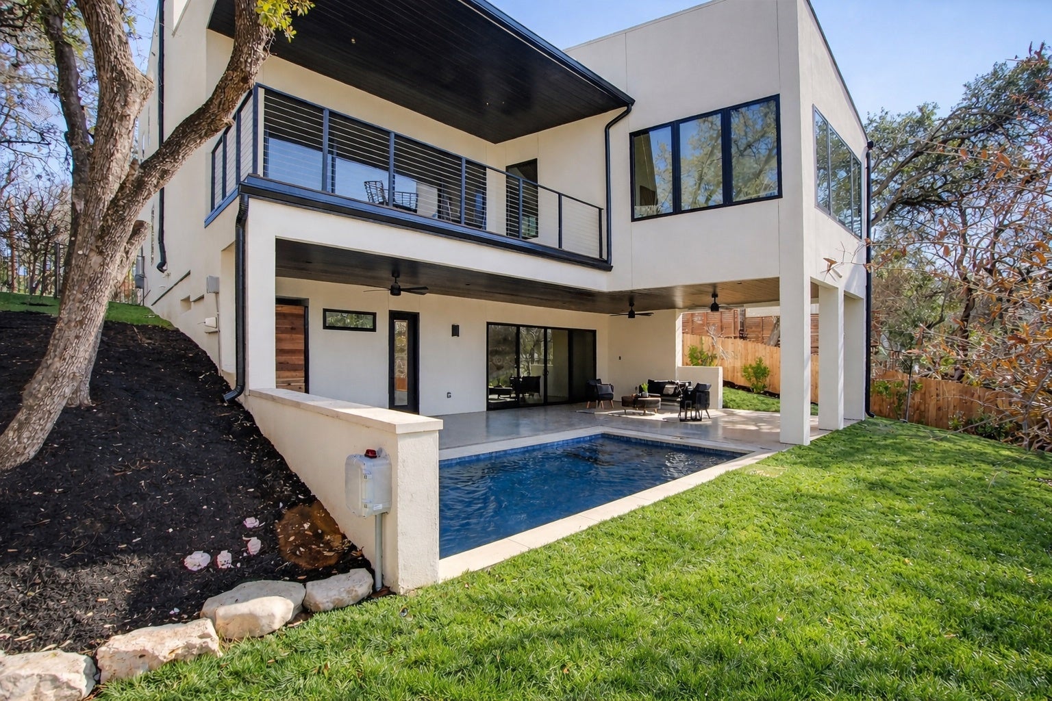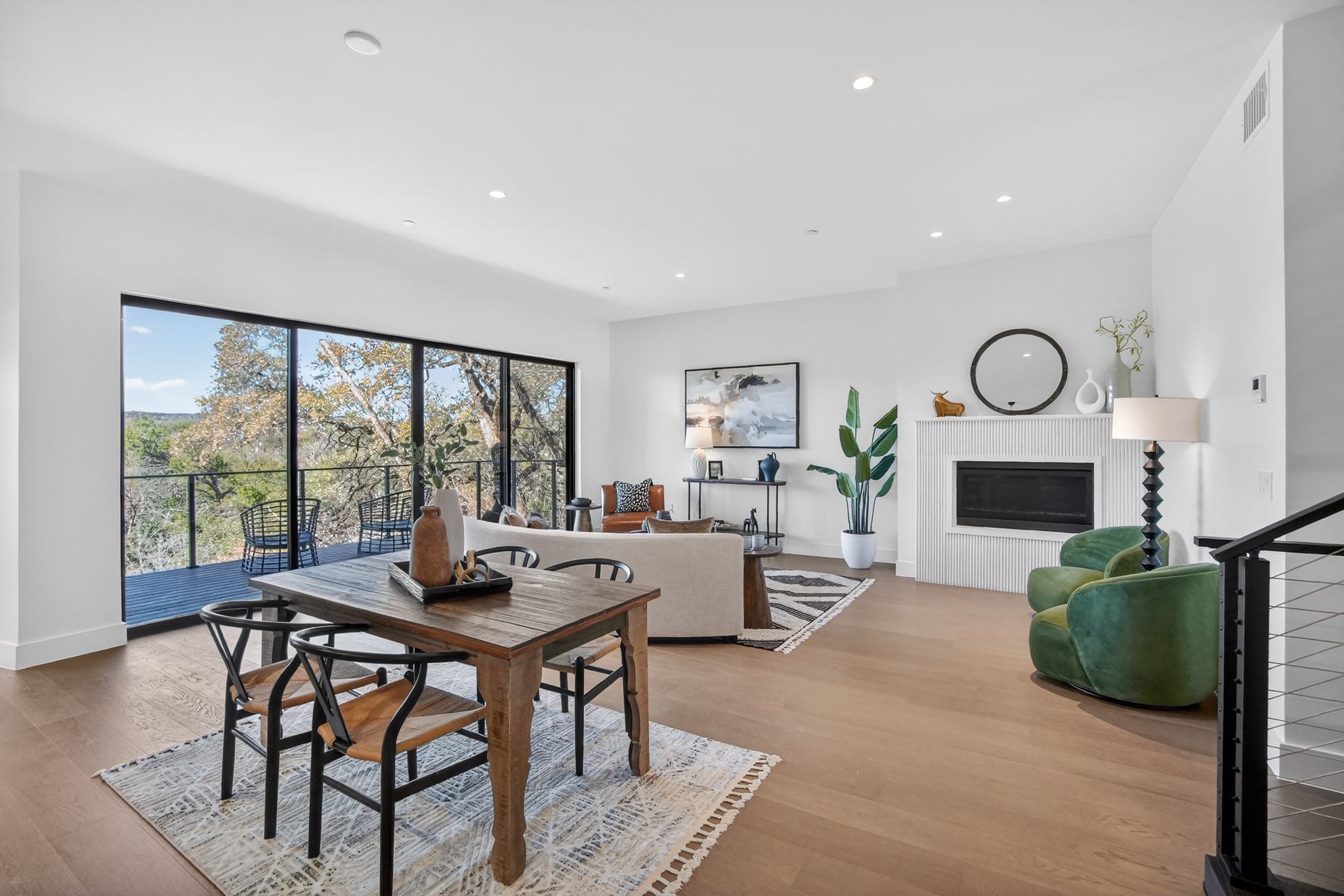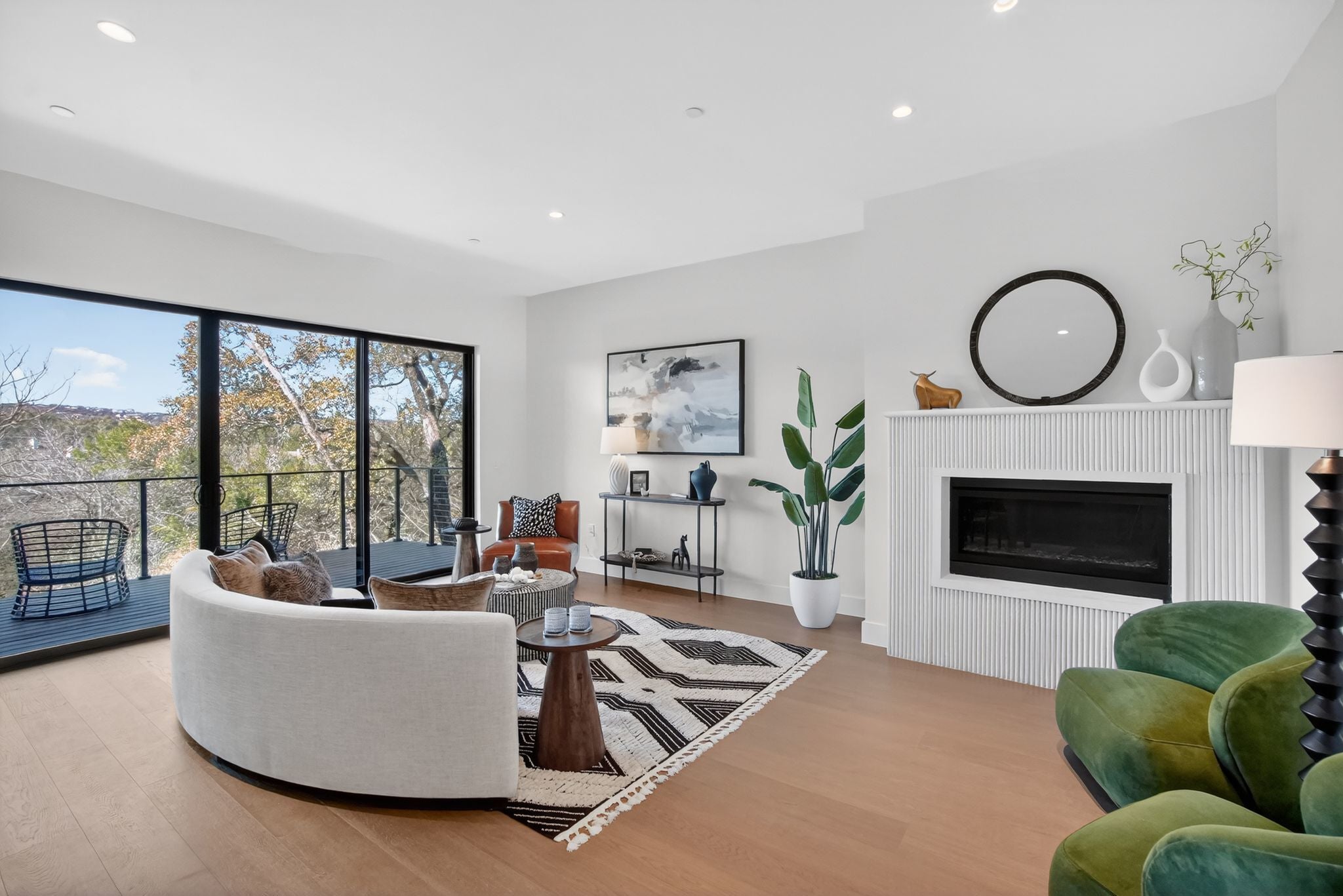 Introducing a striking new construction residence steps from Rollingwood park, where modern architecture meets the serenity of mature trees and Hill Country surroundings. Privately positioned yet just minutes from the vibrancy of Downtown Austin, this sleek luxury home blends refined design with effortless livability. A dramatic designer floating staircase serves as a stunning architectural centerpiece, setting the tone for the home’s contemporary aesthetic. Wide-plank wood floors flow throughout the home, complemented by a custom-designed fireplace anchoring the main living space. The chef’s kitchen is a true showpiece, featuring quartzite countertops and backsplash, a premium Thermador appliance suite including a 6-burner range with griddle and statement hood—counter-depth refrigerator, dishwasher, microwave, and built-in wine refrigerator. Designed for everyday living and elevated entertaining, the kitchen opens seamlessly to main living and dining areas. Walls of glass invite natural light indoors and open to a spacious balcony overlooking rolling hills and lush treetop views. The primary suite is bathed in natural light and offers a spa-inspired ensuite bath with double vanities and oversized walk-in shower, a peaceful private retreat. The lower level is designed for exceptional flexibility—entertaining, multigenerational living, or nanny quarters—with a separate living area opening directly to pool, kitchen, full bath, and versatile flex room ideal for a media room, gym, or additional bedroom. Upstairs, 3 spacious bedrooms feature their own ensuite baths, accompanied by a secondary living area ideal for a game room or lounge plus a convenient second laundry room. Located in one of Austin’s most coveted neighborhoods offering a rare blend of privacy and accessibility and zoned to highly rated EANES ISD. Residents enjoy quick access to Downtown Austin, Zilker Park, trails along Lady Bird Lake, boutique shopping, popular coffee shops, and acclaimed dining.
