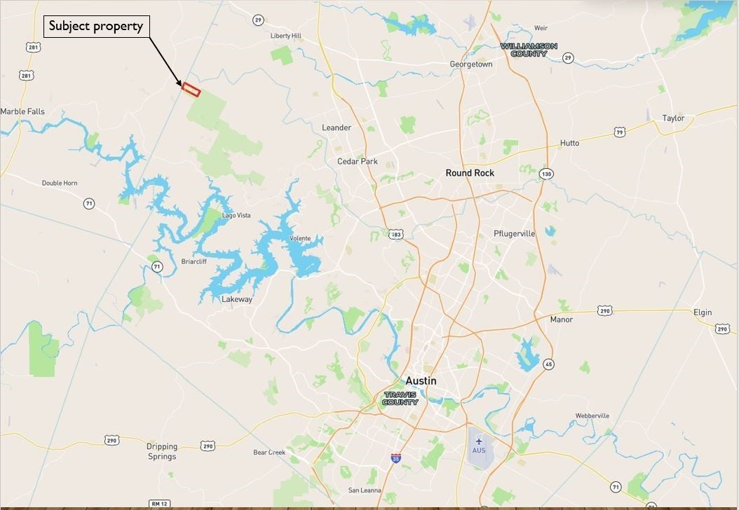 This 405-acre Hill Country ranch is surrounded on two sides by the Balcones Canyonlands National Wildlife Refuge. The property is located in the Balcones Canyonlands area, just east of Marble Falls and just on the western edge of Travis County. The area is well known for its spectacular Hill Country views and scenic countryside and this property has it all. It is unrestricted, rugged and ready for new ownership. Potential uses include a family recreational ranch or homesite, subdivision into large tract homesites or commercial operations such as glamping, rental cabins or other recreational type development. The property includes a 1400 sqft livable cabin with water well, electric and septic and two smaller, approximately 500 sqft cabins that need work. Wet weather Cottonwood Branch Creek runs through the property and drains into the well-known live water Cow Creek not far away. Elevations range over 320 feet on the ranch from a low of 1,020 feet at the bottom of Cottonwood Branch on the south side of the property to a high elevation of 1,340 feet on the northeast part of the property. These elevations allow for panoramic views of the surrounding Hill Country with multiple high locations and multiple canyons. The terrain is rough, rocky and dramatic and includes some very interesting limestone shelfs and outcrops. The soil supports native oak, elm, juniper, and mesquite trees as well as native grasses and other vegetation. Wildlife includes whitetail deer, coyotes, turkeys, mourning dove, and many other native wildlife species. The property is currently used for grazing and recreation. 1-d-1 agricultural tax valuation is held via a grazing lease keeping the taxes low.