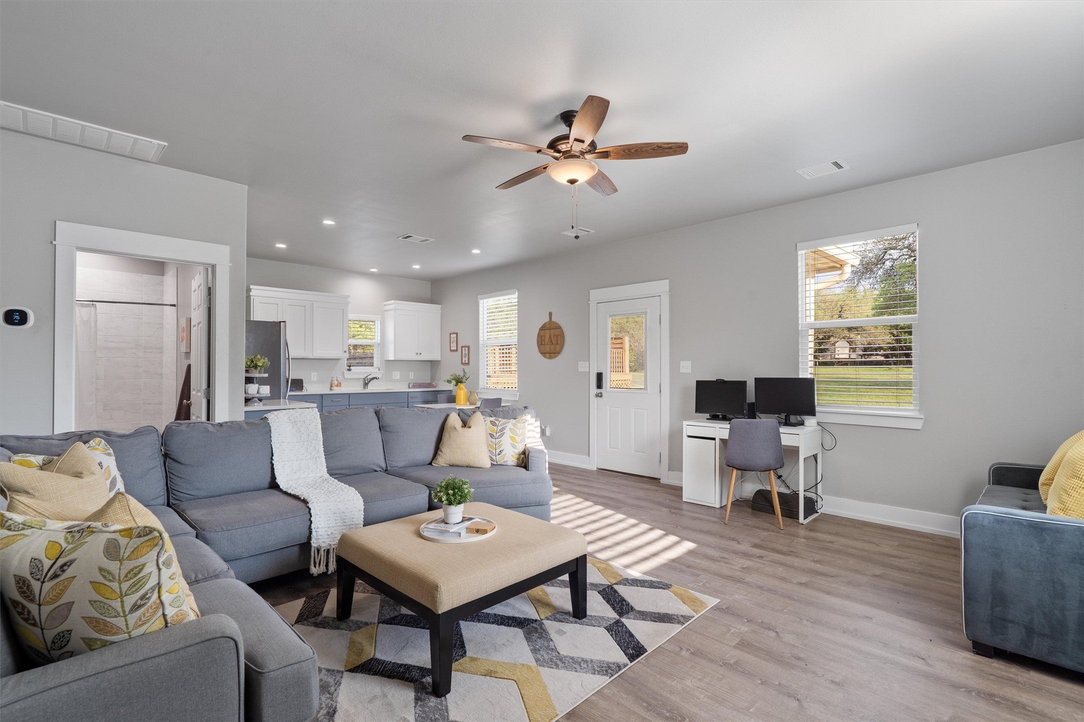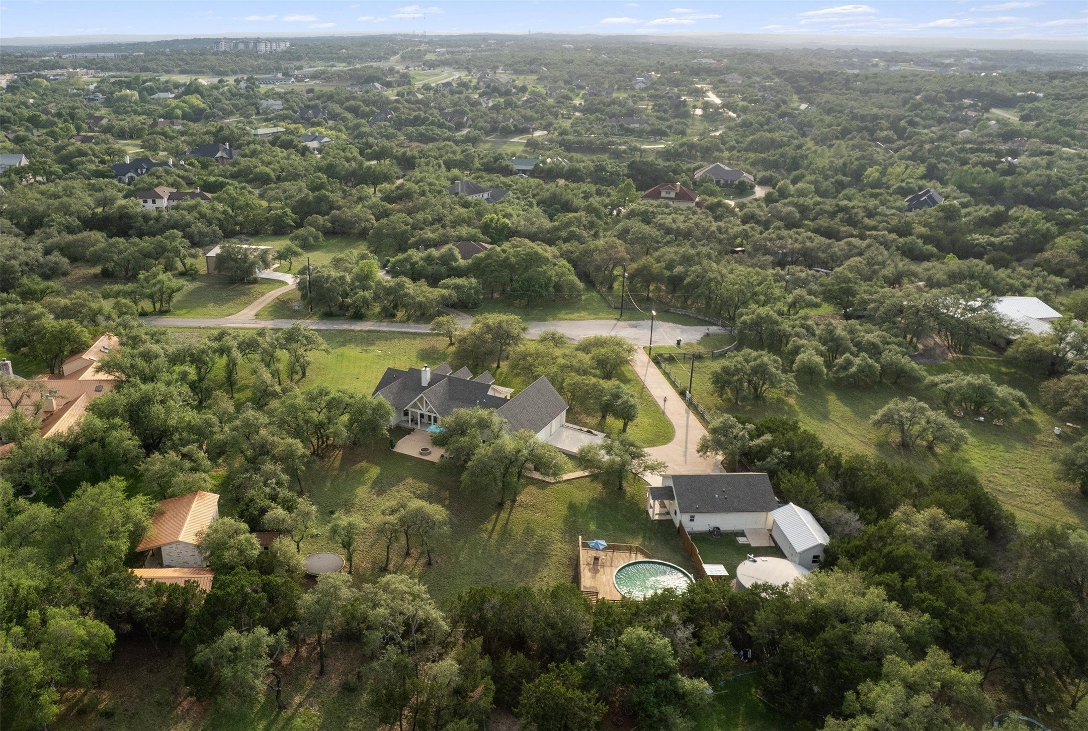 Welcome to an exceptional custom estate in the heart of Dripping Springs, where privacy, craftsmanship, and modern Hill Country living come together on 1.5 serene acres at the end of a quiet road. This thoughtfully designed property features a stunning main residence plus a private casita—perfect for guests, multigenerational living, or income potential. Inside, engineered wood flooring, elevated ceilings, and an open-concept layout create a warm, refined atmosphere. The chef’s kitchen shines with custom cabinetry, under-cabinet lighting, gas range, built-in microwave, and expansive prep space—flowing seamlessly into the living area with a striking stone fireplace (wood-burning or propane). The first primary suite offers a luxurious retreat with separate vanities, a walk-in shower, and a jetted soaking tub, while a second primary suite adds flexibility. An oversized office and upstairs game/flex room provide space for work and play, all supported by a three-zone HVAC system with newer condensers. Step outside to true Hill Country living with an oversized patio, built-in grill station, and fire pit—plus an above-ground pool with expansive decking and crystal-clear water, perfect for relaxing or entertaining. The almost 500 sqft detached casita with open concept includes a full bedroom, bathroom, and walk-in closet. Both homes feature spray foam insulation for energy efficiency and the property is further enhanced by a 29,000-gallon rainwater collection system with a 2,000-gallon overflow tank, offering both sustainability and peace of mind providing a reliable, independent water source—so you never have to worry about wells running dry or water boil notices. Additional highlights include two propane tankless water heaters, a 250-gallon propane tank, a fully finished oversized garage with EV plug, and an additional storage shed. With unmatched privacy, modern upgrades, and flexible living, this one-of-a-kind property delivers luxury and functionality.
