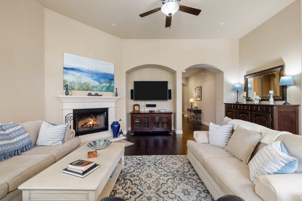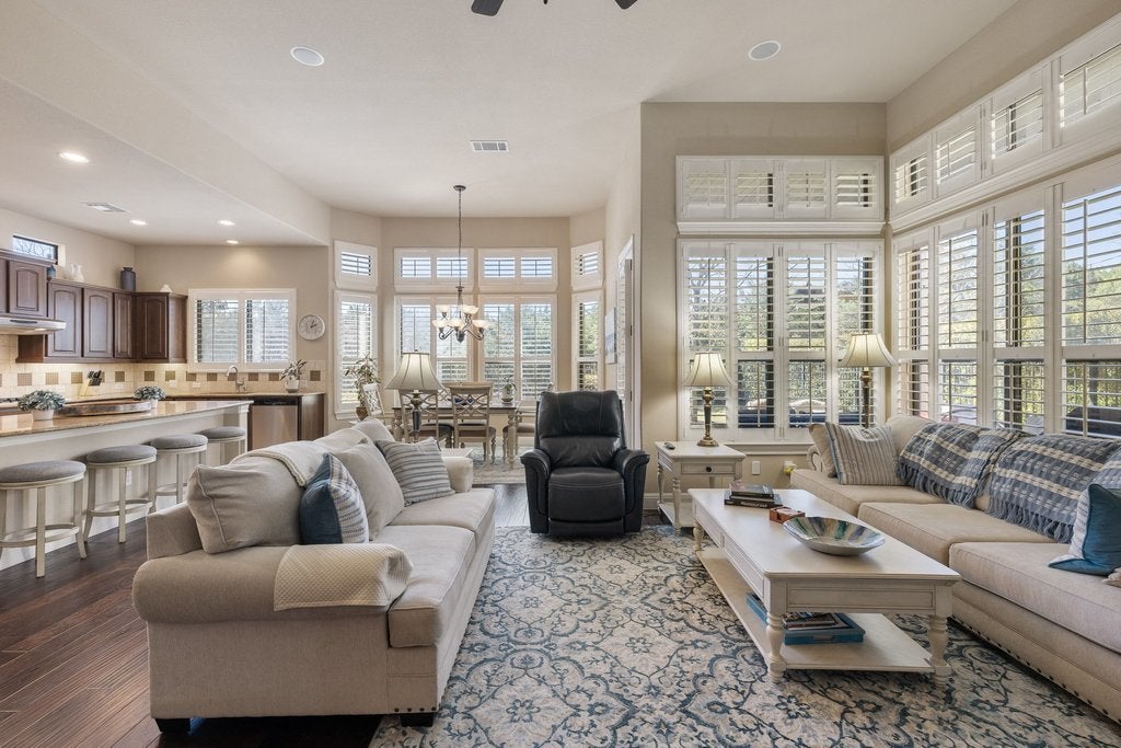 Effortless Luxury in Flintrock Falls! This 2,335-square-foot residence offers refined living in the prestigious Flintrock Falls, home to a Jack Nicklaus-designed golf course. The home features 3 bedrooms, 3 full baths, and expansive windows with plantation shutters throughout, combining style and function for modern living. At the heart of the home is a beautiful open kitchen that flows seamlessly into the living room, perfect for preparing meals while staying connected with family and guests. The kitchen includes a built-in desk, walk-in pantry, and oversized island with seating, making entertaining effortless. Anchoring the family room is a limestone-surround gas fireplace that adds timeless warmth and sophistication. Situated on a quiet cul-de-sac in this guard-gated community, the home offers peaceful, resort-style living. The level backyard is low-maintenance and thoughtfully designed for a lock-and-leave lifestyle. Located near LTISD exemplary schools, Hill Country Galleria shopping and dining, and with access to first-class country club amenities, this home offers luxury living in one of Lakeway’s most sought-after communities.