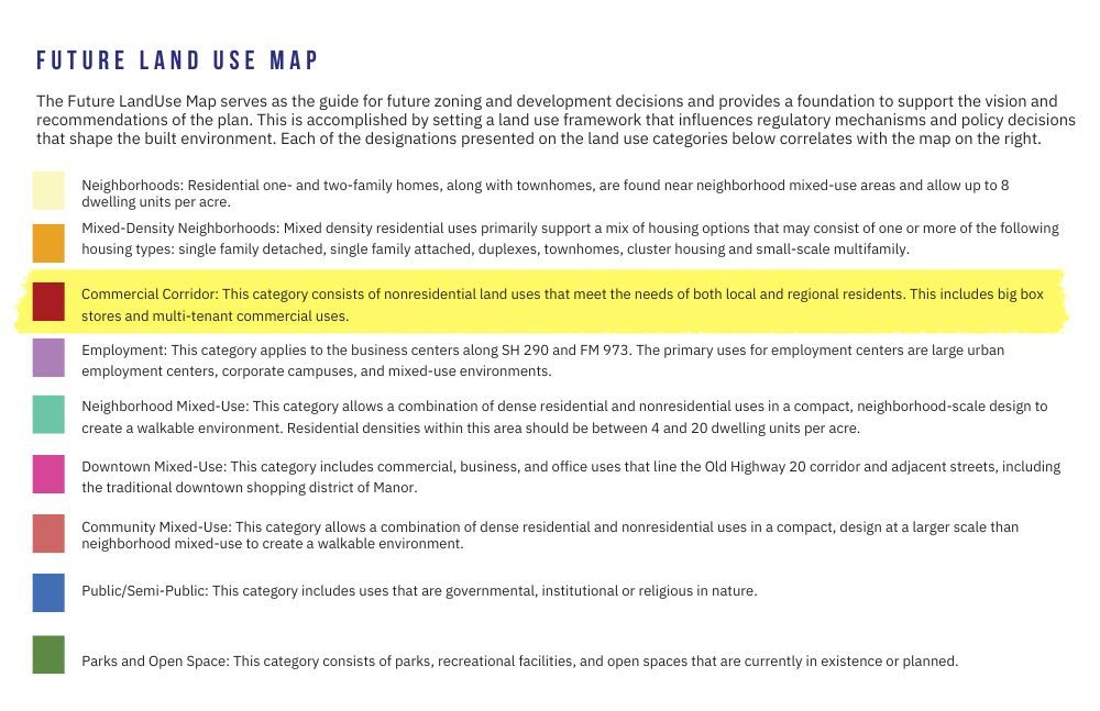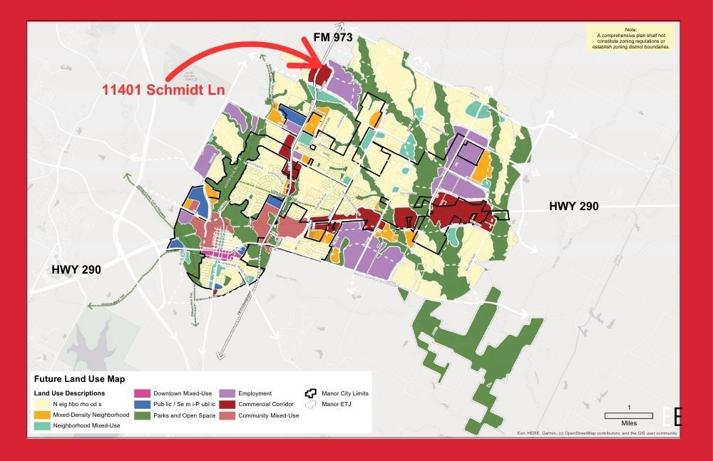 Positioned at the high-visibility intersection of FM 973 and Schmidt Lane, this 5.25-acre property offers exceptional opportunity in one of the fastest-growing corridors in Central Texas. With over 800 feet of frontage along FM 973 and 517 feet of frontage on Schmidt Lane, the property provides maximum exposure and accessibility. Located within the Manor ETJ and designated as a “Commercial Corridor” in the City of Manor’s future land use plan, the tract is ideally suited for large-scale commercial development including big box retailers or multi-tenant commercial uses. The land is level, buildable, outside the floodplain, and features no restrictions. Aqua Water supply is available, and the property also includes a 1,500 sq ft home and well-maintained outbuildings that provide rental income potential while you plan future development. Just 12 minutes south of Samsung’s new semiconductor facility and 24 minutes north of Tesla’s Gigafactory, this rare small-acreage tract on FM 973 offers endless investment and commercial possibilities.