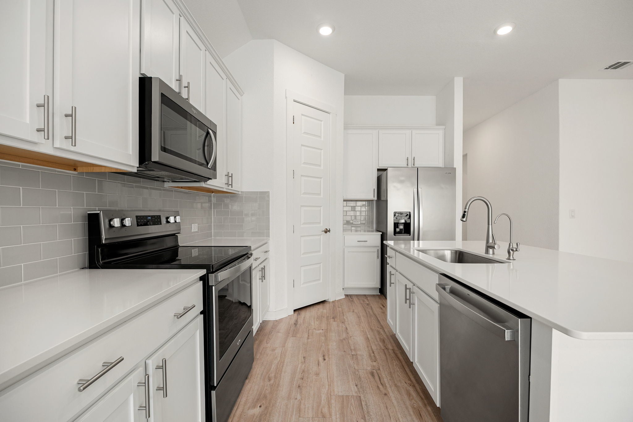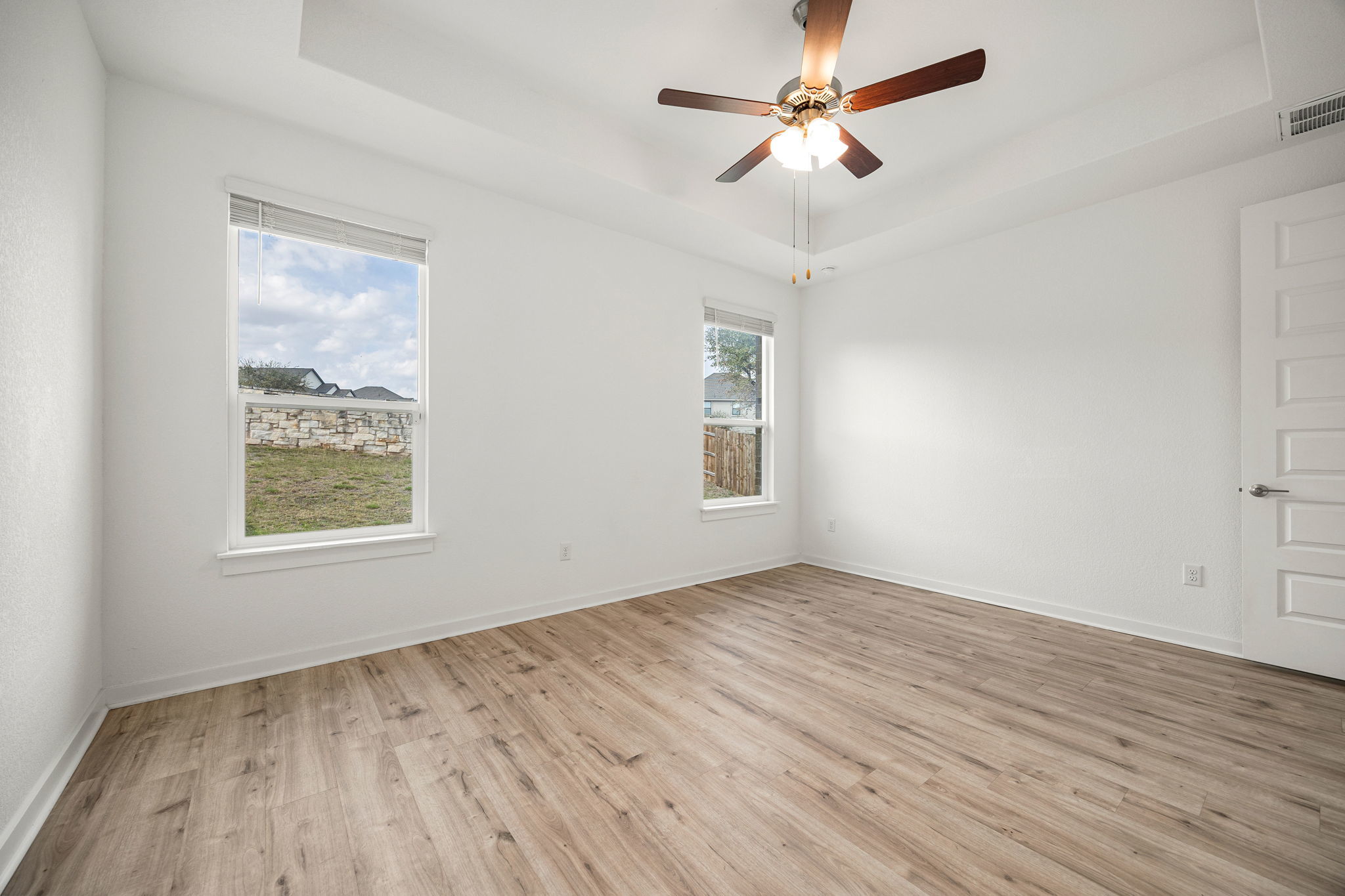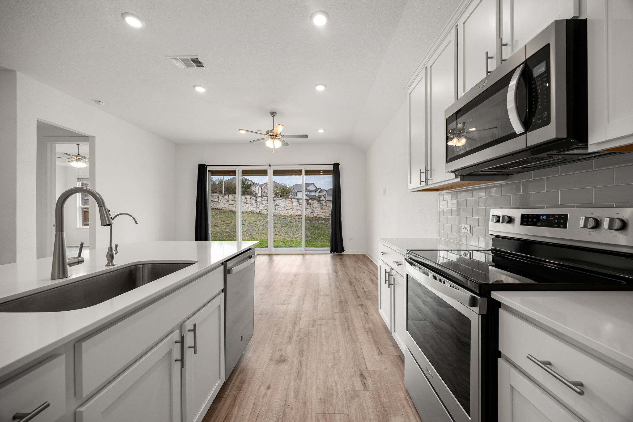 **Move in Special - April move in get April RENT FREE!** Modern single-story home on a peaceful cul-de-sac in the desirable Riverview community, offering easy access to Georgetown’s best amenities. Residents enjoy scenic San Gabriel River trails, a community pool, playground, beach volleyball court, and beautifully maintained green spaces. Just minutes from historic Downtown Georgetown, Wolf Ranch Town Center, and a variety of dining, shopping, and entertainment options. Within 15 minutes, HEB, Costco, IKEA, and Round Rock Premium Outlets are easily reachable. Convenient access to IH-35, SH-130, and Hwy 29 allows quick commutes to Round Rock, Cedar Park, and North Austin. This stunning home offers an open-concept layout with 4 spacious bedrooms and 2 full bathrooms, abundant natural light from large windows and sliding glass doors, 10 feet ceilings in Living, Kitchen, Dinning, Hallway (tray ceiling in primary bedroom is 11 feet, other bedrooms are 9 feet), and luxury vinyl plank flooring throughout the main living areas. All doors are 8 feet high! The entry opens into a bright great room seamlessly connecting the living room, dining area, and chef’s kitchen. The kitchen features an extra-large center island with breakfast bar, quartz countertops, walk-in pantry, water softener, reverse osmosis faucet, and premium stainless-steel appliances. Oversized sliding doors provide a seamless transition from indoor to outdoor living. The private primary suite is separated from secondary bedrooms and includes luxury vinyl plank flooring, tray ceiling, spacious walk-in closet, and a spa-like en-suite with quartz double vanity and large walk-in shower. Secondary bedrooms are generously sized with carpet flooring and share a full guest bath with quartz vanity and tub/shower combination. Step outside to a large fenced backyard with a covered patio—perfect for relaxing, grilling, or entertaining. Exterior features four-side brick construction for durability and curb appeal.