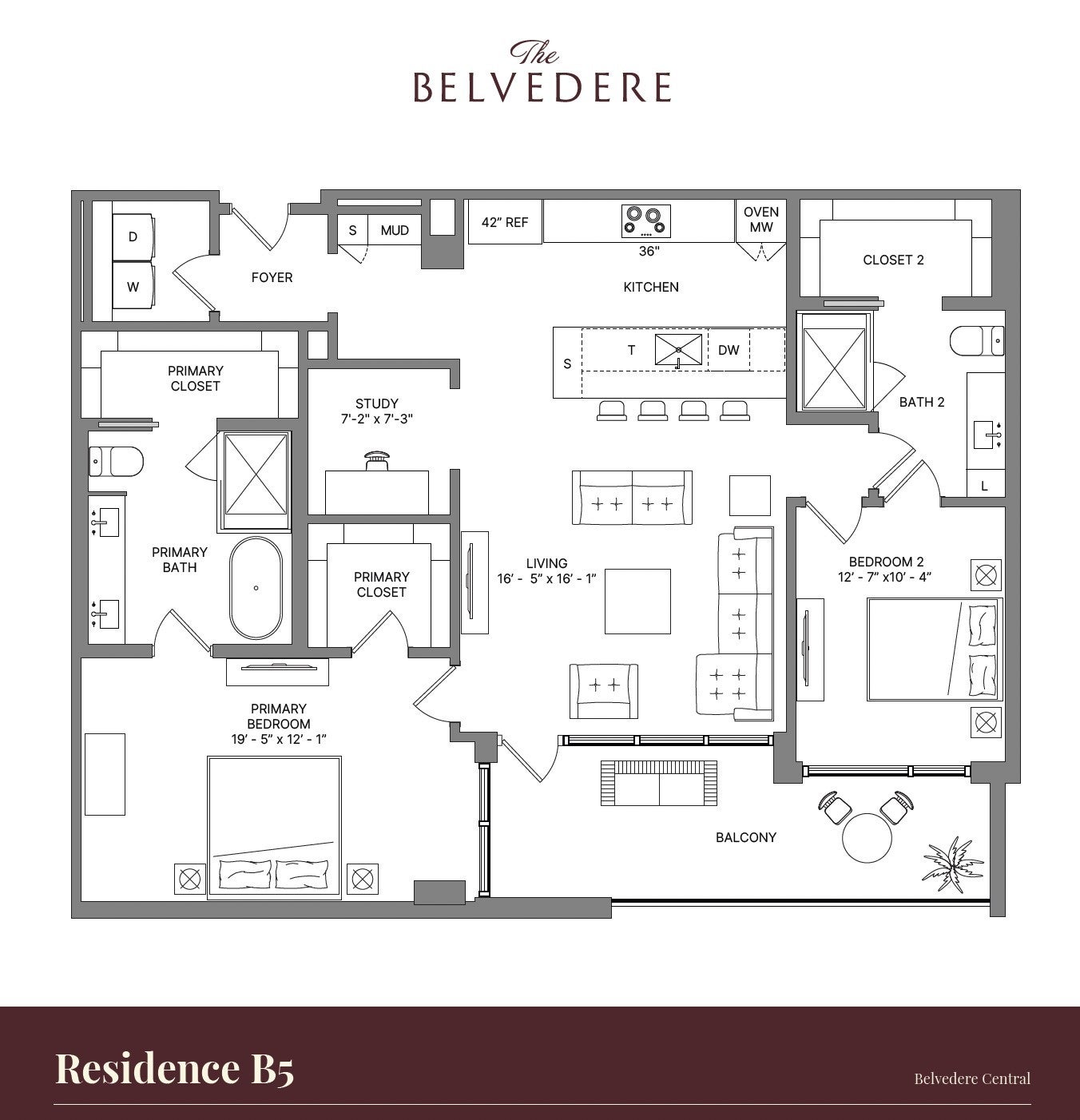 Designed by KTGY Architects with interiors by Kim Lewis Design, The Belvedere brings boutique mid-rise living to Old West Austin. Perfectly positioned between Downtown, Clarksville, and Lady Bird Lake, the building sits at one of Austin’s most connected addresses. The Belvedere offers a rare connection to Austin’s most beloved outdoor space: the Butler Hike and Bike Trail along Lady Bird Lake. In partnership with the Austin Parks Foundation, a new on-site trailhead will connect residents directly to the trail, making morning runs, evening walks, and lakeside moments part of everyday life. This connection is further enhanced by a new park on The Belvedere lawn. Expanded green space will include upgraded sidewalks, dedicated bikeways, and improved public access to the trail, creating a seamless link between the residence and the lakefront. Residents arrive through a 24 hour attended lobby with concierge service. Amenities are designed for both wellness and ease, including shaded outdoor seating, water features, and direct trail access designed by Nudge Design. The Wellness Level features Austin’s largest downtown lap pool, saunas, cold plunges, treatment rooms, and a state of the art fitness center. Additional spaces include an owner’s lounge, pet lounge, co working suites, golf simulator, and a guest suite. Residence 212 is a 2-bed 2-bath + study floor plan, with a south-facing private balcony that overlooks the 75 foot lap pool, the park, and Lady Bird Lake. Interior finishes include stone and wood flooring, natural stone countertops, Thermador appliances, and spa style baths. Type I concrete construction with acoustic glass provides lasting quality and quiet comfort. Estimated delivery Q3 2027. Schedule a tour of the sales gallery, located at 504 Oakland Ave.