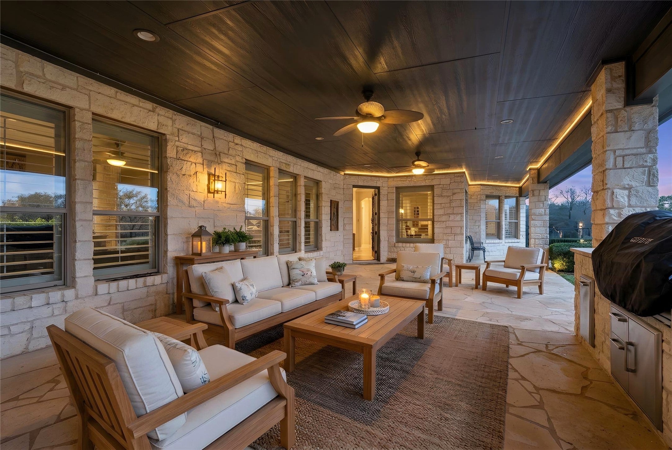 102 Voca is an exceptional golf course property in the heart of Horseshoe Bay West, ideally positioned along the 10th green of Apple Rock Golf Course and offered with the adjacent lot, creating a rare 0.78-acre homesite with added privacy and space. This beautifully maintained home features 4 bedrooms, 4.5 baths, and a 4-car garage, along with timeless finishes and thoughtful updates, including a 5-year-old metal roof, granite countertops, wood flooring, plantation shutters, recessed lighting, and custom window treatments. The well-appointed kitchen includes an LG stainless steel refrigerator, double ovens, induction cooktop, walk-in pantry, farm sink, built-in refrigerator drawers, microwave, island seating, tile-wrapped bar with backsplash, dual-temperature wine fridge, ice maker, and Jan Barboglio lighting. The spacious living area features built-in shelving and a wood-burning fireplace, while the private primary suite offers a tray ceiling, soaking tub, walk-in shower, dual vanities, and a custom closet with built-ins. Each guest bedroom includes its own ensuite bath, and an additional office or flex space with French doors provides versatility. Outdoor living shines with an expansive covered patio, wrought-iron fencing, a heated in-ground resistance pool/spa, and a full outdoor kitchen with propane grill, refrigerator, stone gas fireplace, and buried propane tank, perfect for year-round entertaining in Horseshoe Bay West.