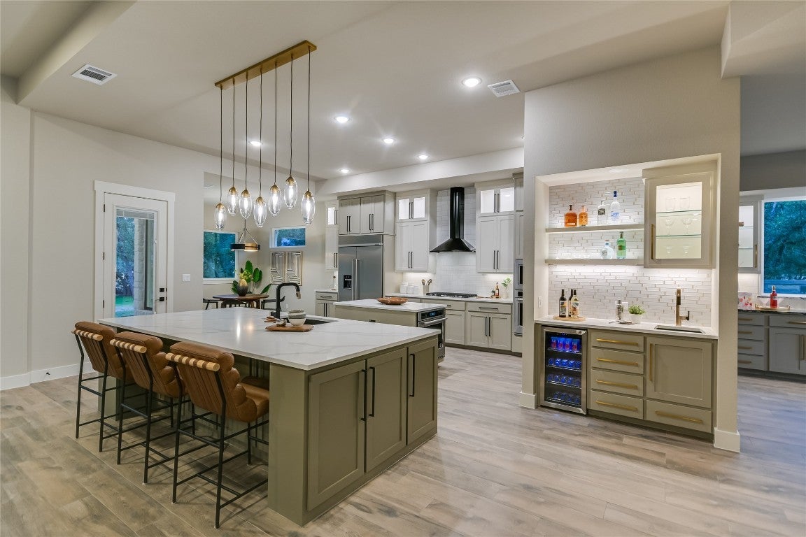 - Built-In Refrigerator, Convection Oven, Double Oven, Dryer, Dishwasher, ENERGY STAR Qualified Appliances, Disposal, Gas Water Heater, Microwave, Propane Cooktop, Range Hood, Stainless Steel Appliance(s), Vented Exhaust Fan, Wine Refrigerator, Washer, Warming Drawer