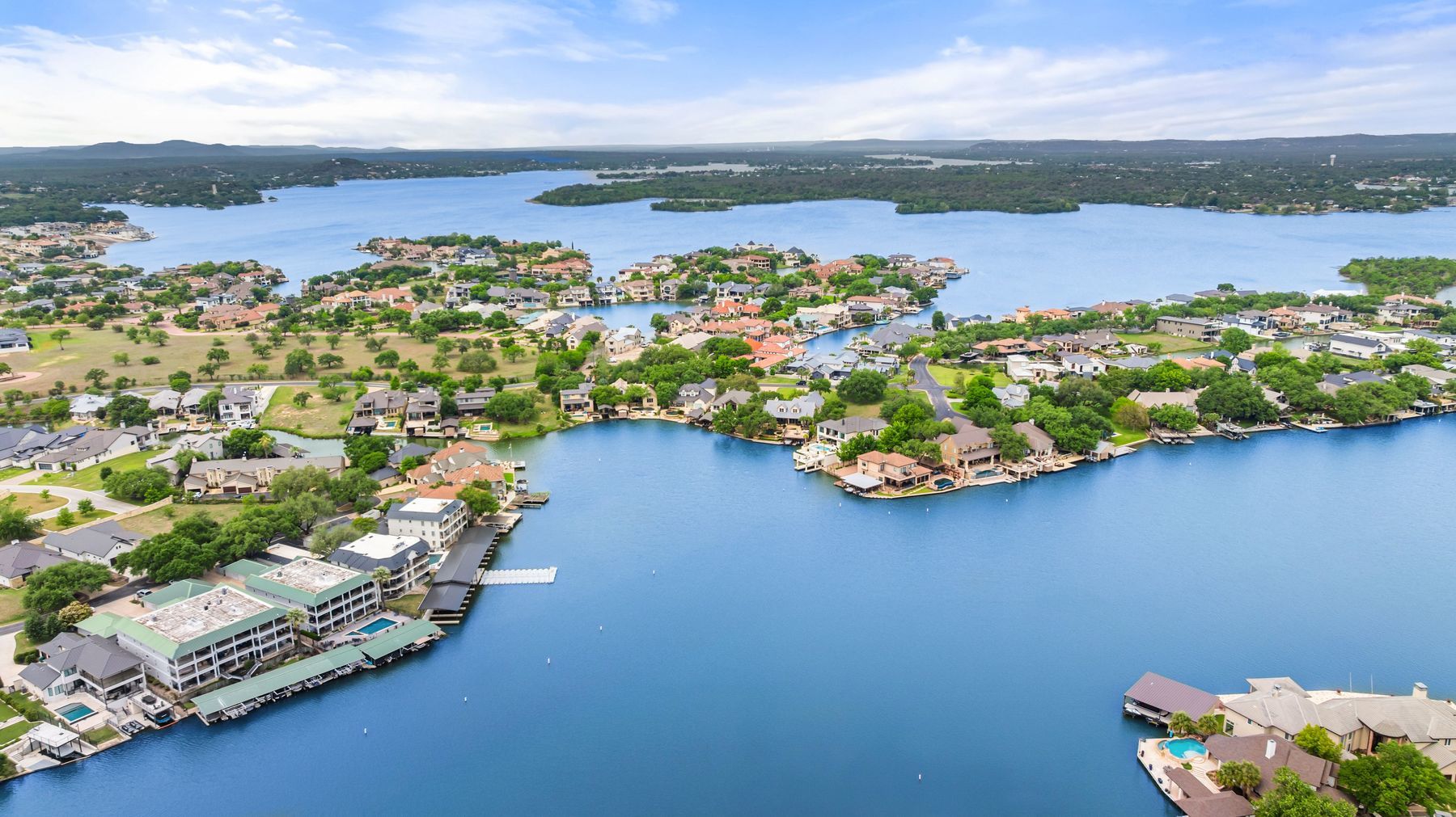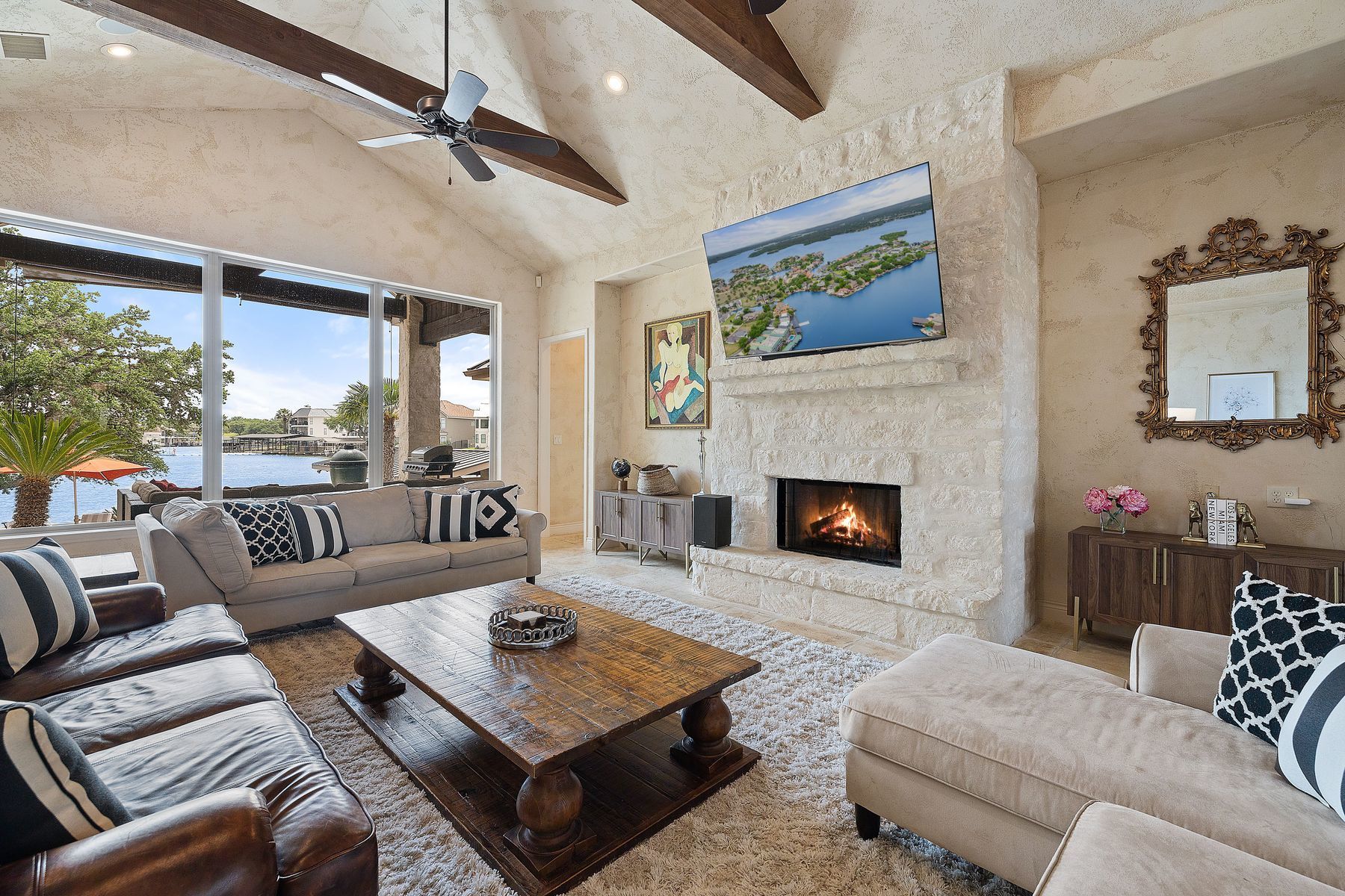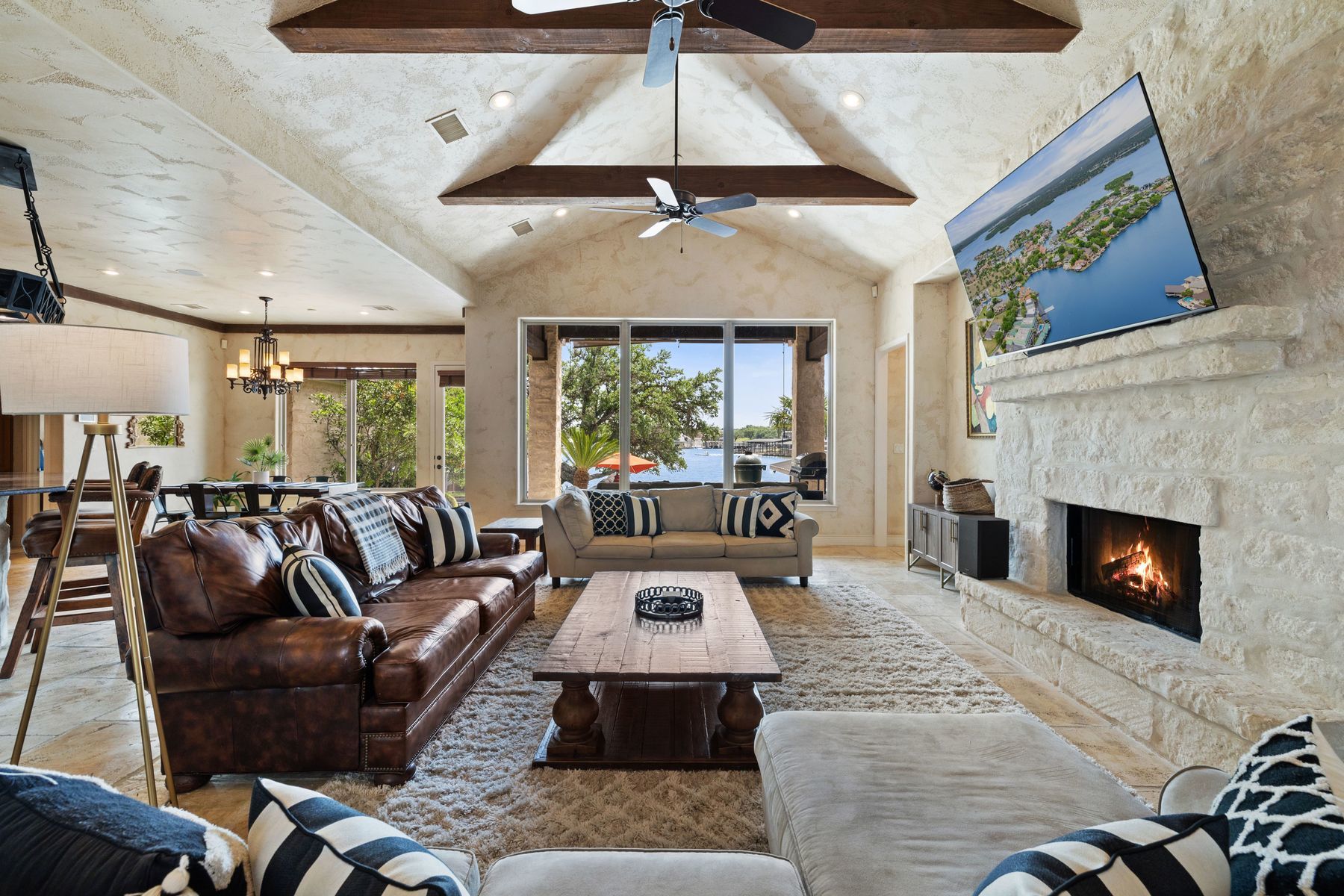 113 Wennmohs Place isn’t just a home—it’s a lakefront dream woven with luxury and adventure. This 3,218 sq ft lakefront gem sits on 95’ of east-facing open waterfront along the shores of beautiful Lake LBJ, where the vibrant lake lifestyle unfolds in the heart of Horseshoe Bay. Surrounded by majestic oak trees, this 4-bedroom, 4-bath sanctuary blends rustic charm with modern luxury, offering a front-row seat to shimmering waters and fiery sunrises. Step into an open-concept living room where wood beam ceilings soar above cool travertine flooring, creating an inviting, airy ambiance. Floor-to-ceiling windows frame stunning lake views, bathing the space in natural light. The gourmet kitchen dazzles with granite countertops, custom cabinetry, and a large island, perfect for hosting lively gatherings. The primary suite is a tranquil haven, boasting lake vistas, a spa-like en-suite with dual vanities, and a walk-in closet. Three additional bedrooms, each with full baths, ensure comfort for family or guests. Outside, the lake lifestyle shines. Lounge by the sparkling pool, shaded by ancient oaks, or gather on the expansive covered patio for al fresco dining with waterfront views. The boat house has a hydraulic lift and double jet ski ramps. Horseshoe Bay // Lake LBJ is a favorite destination for Texans, with its endless recreational activities and world class resort amenities. Located just 45 minutes Northwest of Austin and 90 minutes North of San Antonio in the Highland Lakes region of the Texas Hill Country.