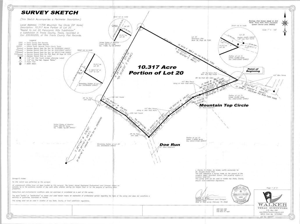 Set on 10.317 acres in the Texas Hill Country, this property offers a practical opportunity to build, invest, or hold land in an area where larger tracts are becoming harder to find. Located within Leander ISD and surrounded by a quiet stretch of countryside, the property directly borders a 580-acre section of the Balcones Canyonlands National Wildlife Refuge—part of more than 25,000 acres of protected land—providing long-term privacy and preserved natural surroundings. This tract has been surveyed from a larger 34.851-acre property, giving buyers the option to start with a manageable footprint while maintaining the ability to expand. An alternative purchase option is available for the full 34.851 acres, which includes a 2-bedroom, 3-bath home and existing improvements (MLS #8938820). The land features rolling terrain with a mix of open and wooded areas, offering multiple potential building sites and flexibility for a range of uses. Located within the ETJ of Lago Vista and outside of typical subdivision restrictions, the property supports a variety of residential, recreational, or long-term investment plans. Pedernales Electric service can be extended to the tract, and Jonestown Water Supply has indicated that a water line extension may be possible. Combined with minimal permitting requirements in the area, the path to development is relatively straightforward compared to more restricted locations. Positioned approximately 20 minutes from Cedar Park and under an hour from Austin, the property offers a balance of accessibility and separation. With usable acreage, adjacency to protected land, and long-term flexibility, this is a solid opportunity in western Travis County.