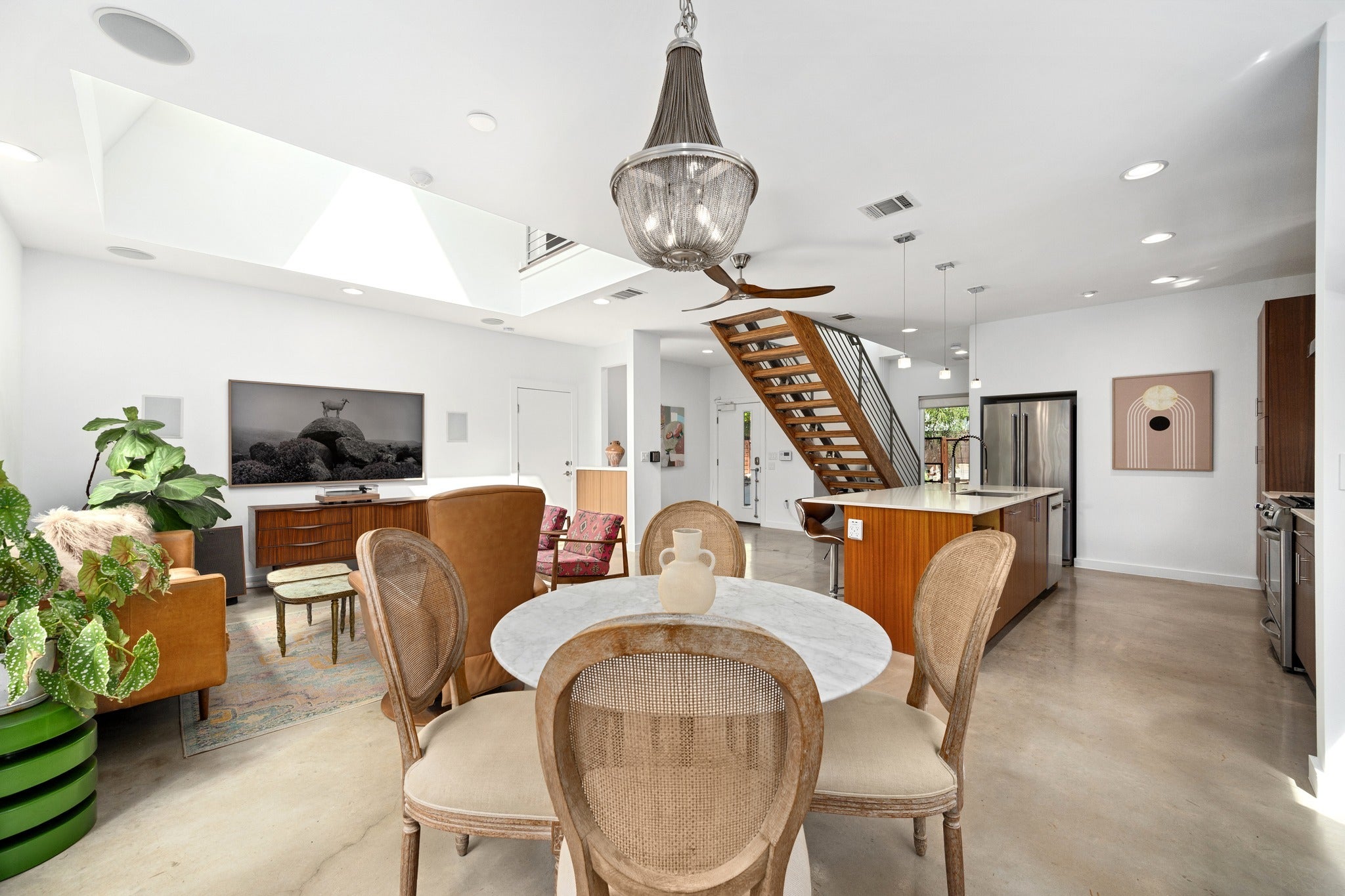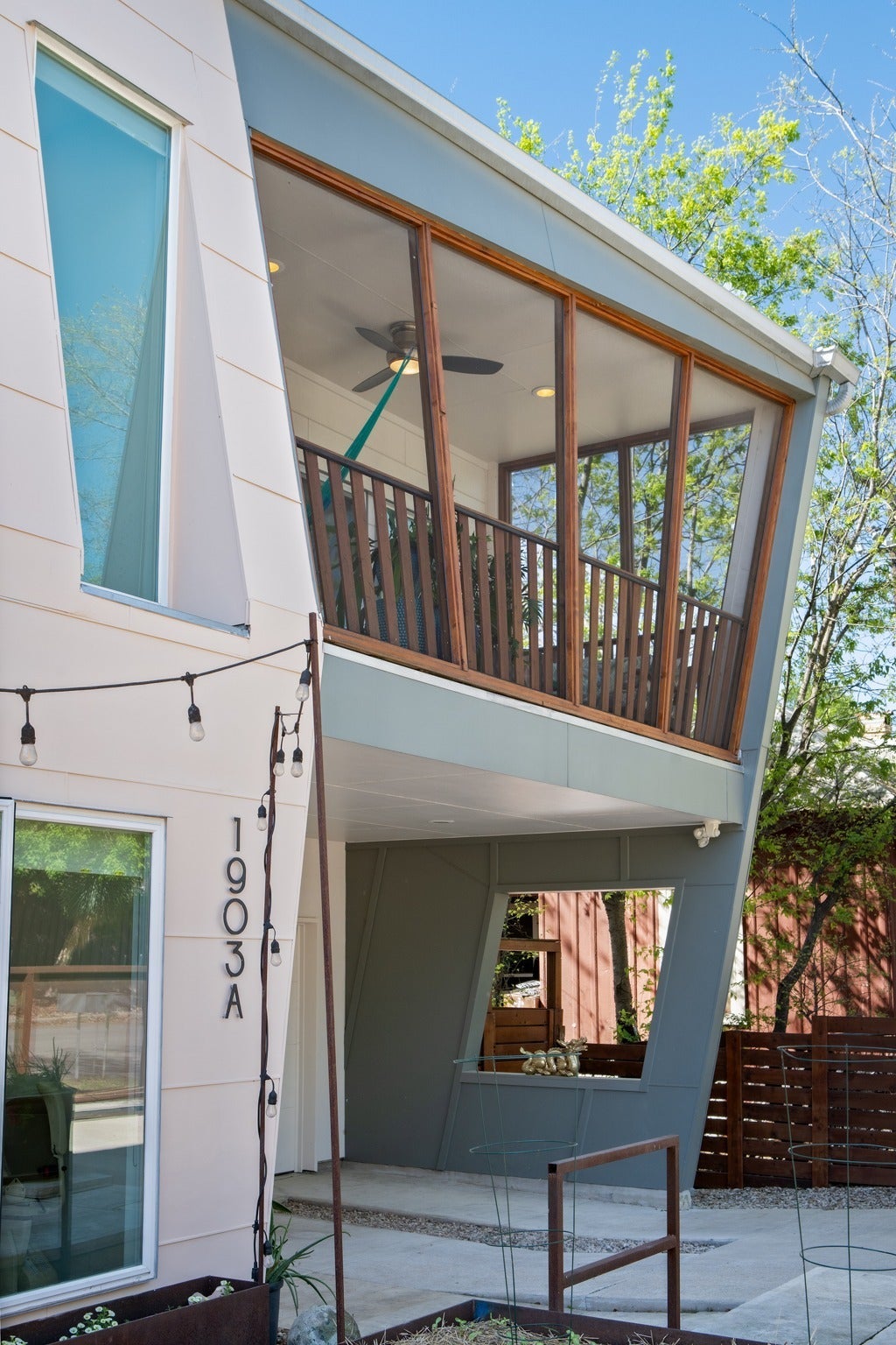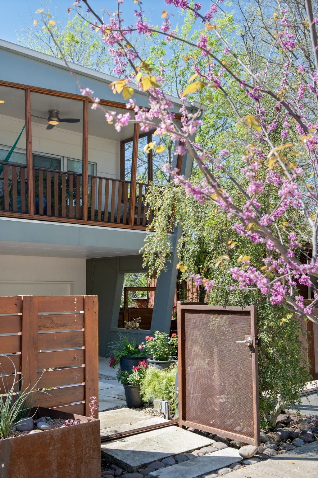 DragonWING isn’t subtle—and it’s not supposed to be. The rooflines and angles give the home its name, creating a silhouette that feels intentional, architectural, and just a little unexpected. Designed by architect Guido Porto, the interiors follow through on that first impression. A two-story living space opens upward to a second story skylight that brings in natural light without the usual heat gain. The effect is bright, cheerful, and comfortable throughout the day. The 3-bedroom, 3-bath layout is flexible and quietly functional, with accessible features fully integrated into the design. Clean lines, thoughtful proportions, and a natural connection between the living, dining, and kitchen spaces create an easy rhythm—one that works just as well for everyday living as it does when the house is full of guests. Two screened porches extend the living space and primary bedroom in a way that actually changes how the home is used. Doors open, people drift outside, and the boundaries between indoors and out start to blur. Multiple seating areas, an outdoor shower, and raised vegetable garden beds add to the outdoor living opportunities. Native landscaping for beauty and wildlife keeps things grounded—lush without asking much in return. Sustainability here isn’t a feature list—it’s integral to the design. Solar panels, rainwater collection, EV charging, energy efficiency, and masterful daylighting all work together in a way that makes sense for the resident and the environment. And then there’s the location. Only two blocks from Sour Duck, The Wheel, Juiceland, Austin Daily Press, LaPlancha, Bennu, Sukha Yoga, Casa de Luz, VAIN salon, FUSE co-working.and a long list of East Austin staples, with UT, Dell Med, rail, and transit all close at hand. Fully fenced front yard with a custom steel automatic gate, plus garage and carport. Completely separate fenced yard from B unit, which is accessed from alley. DragonWING has a point of view—and is awaiting your visit.