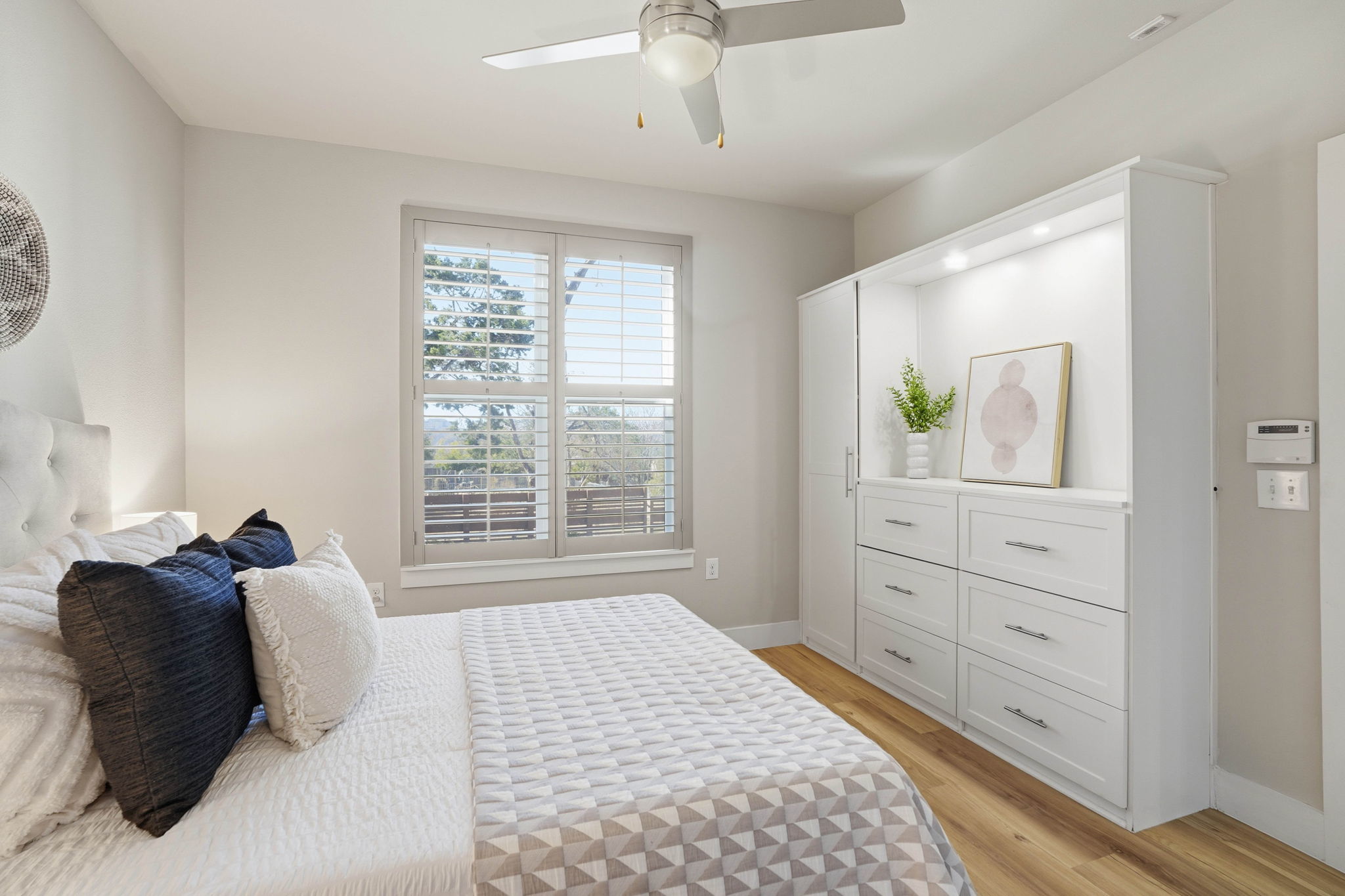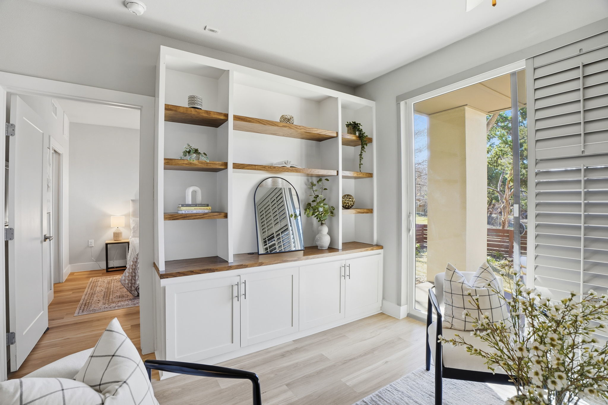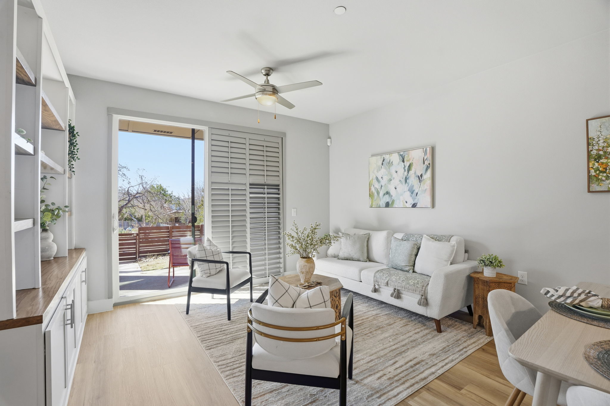 This is one of the most walkable complexes you will find. Across from South Austin Recreational Center. The community garden right outside your back yard is so peaceful. No carpet. The beautiful condo has life proof vinyl flooring throughout and tile in the bathroom. California closet and built in entertainment cabinet with storage are just some of the stand out features in this unit. Open the shutters on the sliding glass door to look at your covered patio and spacious private yard. 1 car garage, a nice sized storage closet, washer/dryer and stainless steel refrigerator are included. HVAC installed approx. 2024.