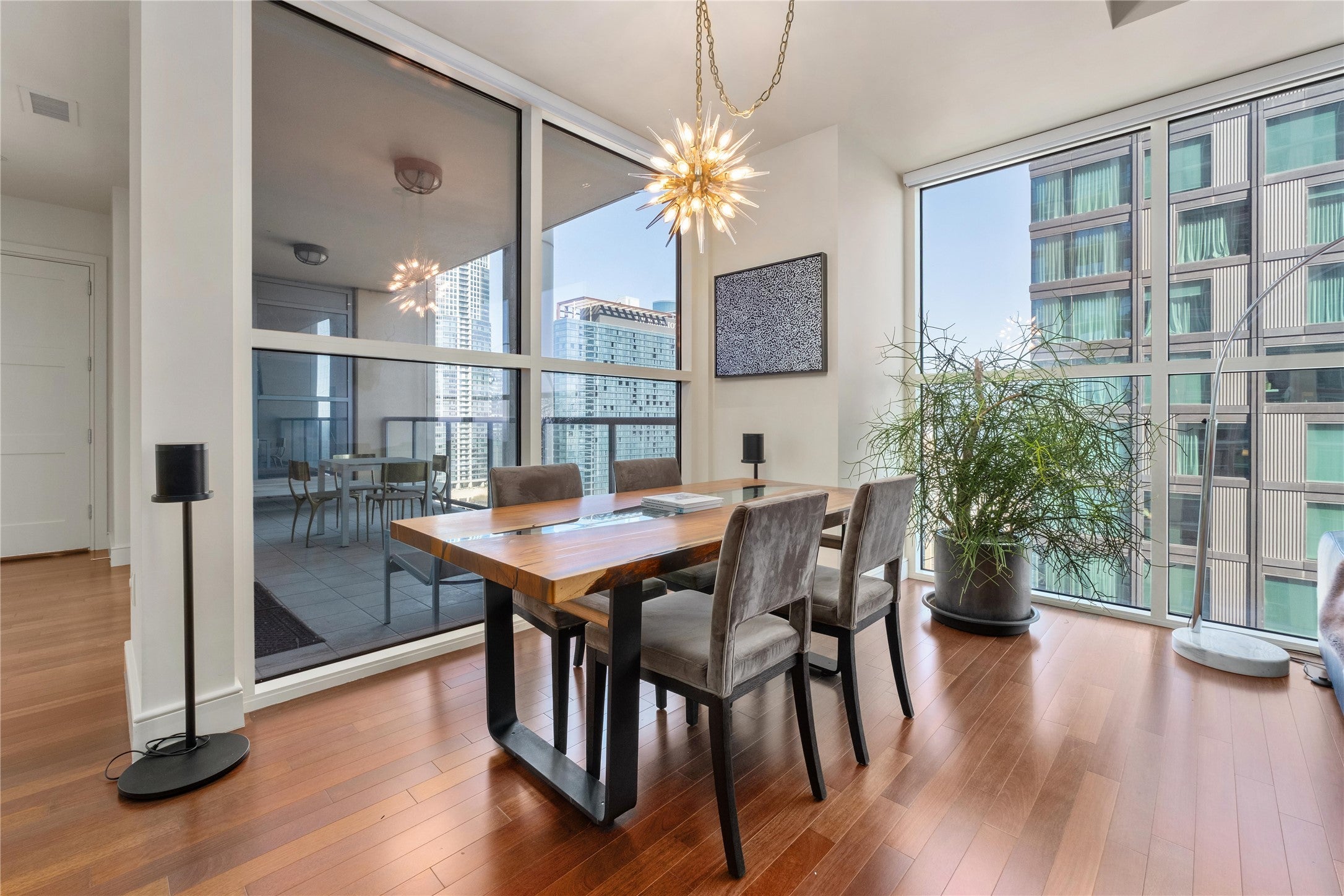 Four Seasons Residences. Large living room with corner window and skyline views. Expansive covered balcony large enough for living and dining space, accessible from living room and bedroom. Open kitchen with Wolf and Sub-Zero appliances, wine fridge. Spa-like bathroom suite. Four Seasons services including concierge, valet parking, room service* and more. 24-hour notice to tour required. Call or text agent for appointment.