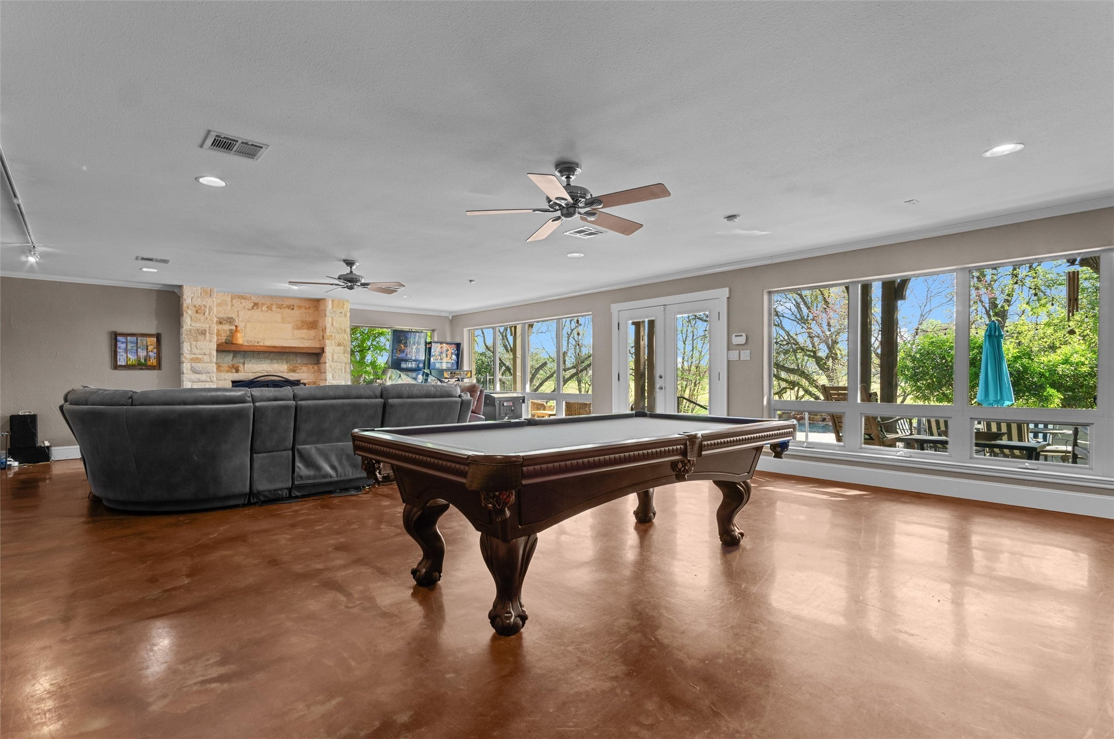 RARE SALADO PROPERTY built for VIEWS ON ALL LEVELS! Property includes a Main House with over 5,600sf on THREE LEVELS PLUS a separate 950sf workshop/studio AND 200sf GUEST CABIN. Main level GREAT ROOM is lined with windows and French doors, has scraped-wood custom flooring, beamed ceiling and opens to FULL COVERED BALCONY. GRAND KITCHEN has quartz and granite counters, custom cabinetry and lighting, DOUBLE OVENS and GAS cooktop all framed by VIEWS through the room-length PICTURE WINDOW. Large Primary suite on MAIN level has jetted tub, customized closet system and endless counter space. SECOND LEVEL has 2 beds with EN-SUITE baths and a COVERED BALCONY for MORE VIEWS off bedroom 2. BASEMENT LEVEL has a full BAR AND KITCHEN, WINE CELLAR, giant living/game room, SECOND FIREPLACE, full 4th bedroom with built-in desk and shelves and FULL 4th bathroom. AMAZING OUTDOOR LIVING access and VIEWS are from the basement level and lead to POOL/PATIO area. OVER HALF-ACRE Lot on the MILL CREEK GOLF COURSE. Golf Cart in minutes to Downtown Salado, Golf Club and Driving Range. 40 min from Austin; 30 min from Georgetown. No HOA.