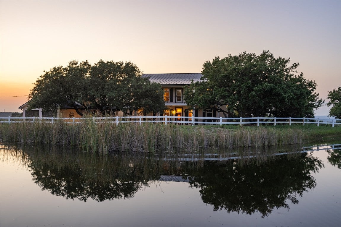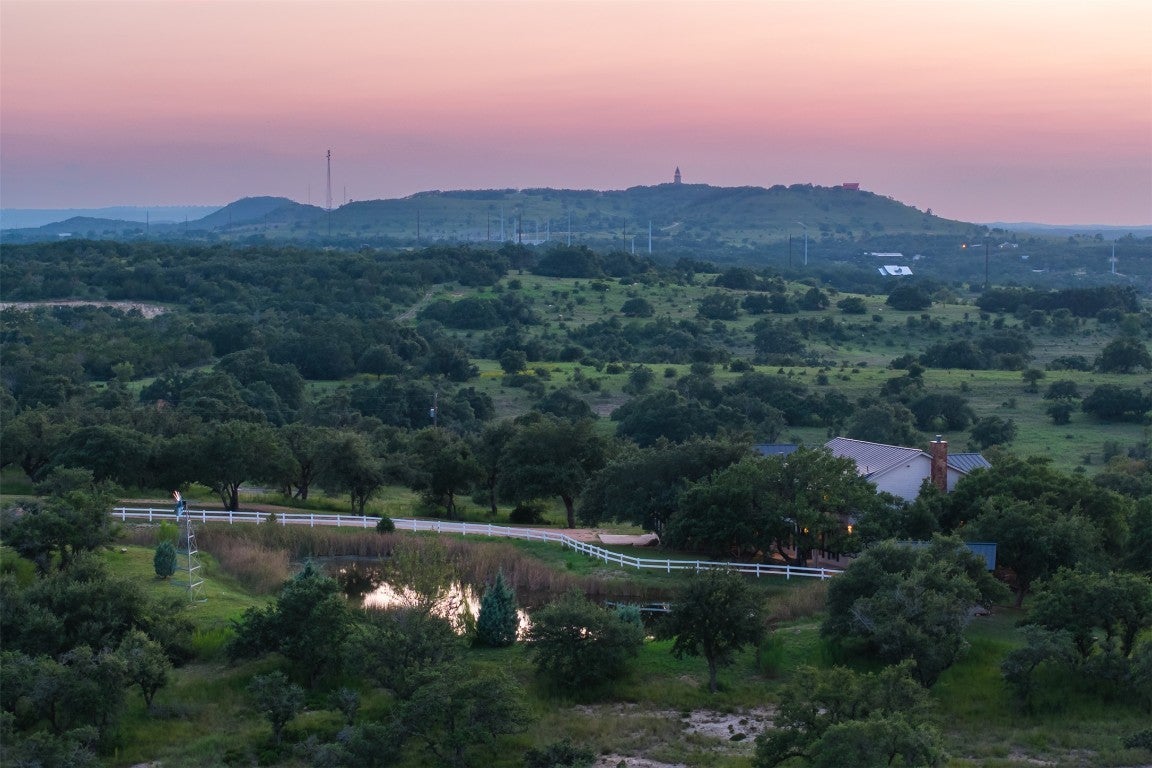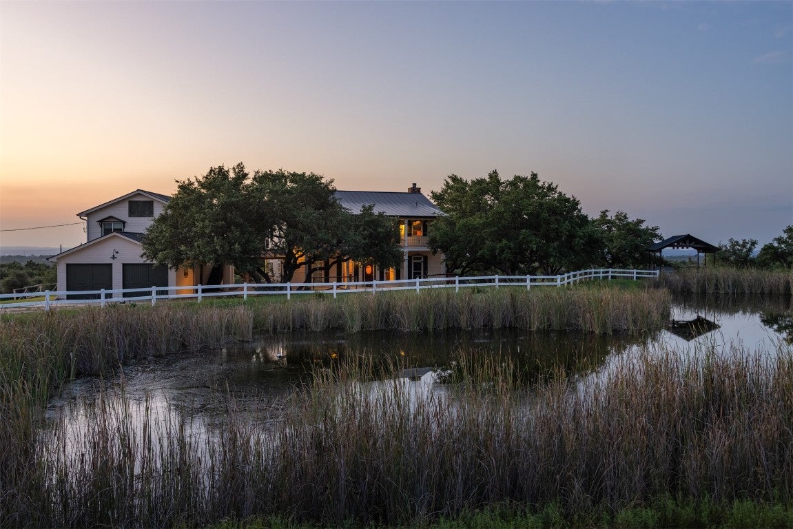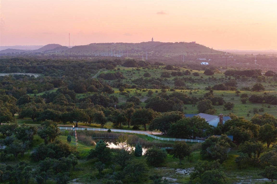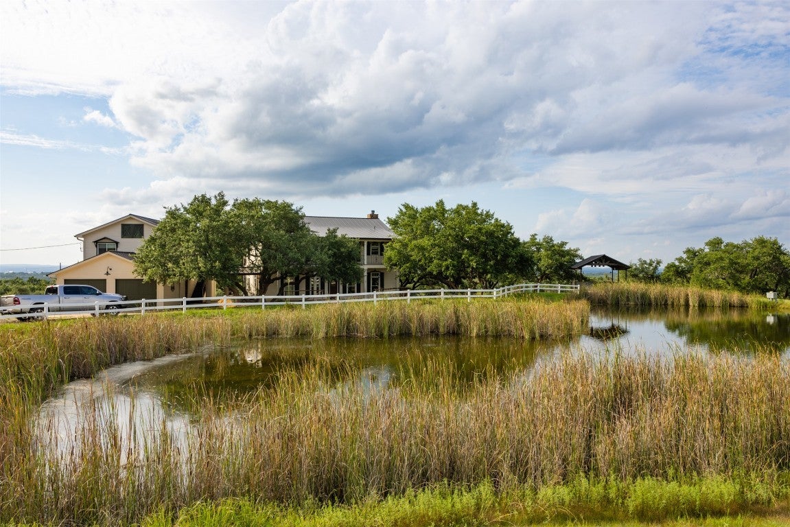 Experience luxurious Hill Country living at this 25-acre estate within gated Byrd Ranch Estates in Eastern Blanco County. Accessed by a picturesque bridge over Miller Creek, this private haven blends scenic beauty with opulent spaces. The property is cedar-cleared and high-fenced, with land sloping to reveal stunning northern views. Dominant hardwoods include live oak and Spanish oak. The lined, irrigated pond holds water year-round for bass and catfish. A water well services the property, and a rainwater collection system could be added. The property is high game fenced and ready to support just about any type of wildlife including exotics, horses and cattle. The main house features an open floor plan with a spacious kitchen, large dining area, and great room with a fireplace. A cigar and cordial room has antique windows and ports from an old ship. Giant ceilings lead to an upstairs bedroom, a game area with an additional fireplace, and an office or second bedroom. The guest house, connected by a covered walkway, includes four bedrooms, two baths, and a community living area. Multiple porches, patios, and sitting areas adorn all structures, and an attached multi-bay garage adds convenience. The outdoor area features a BBQ, a pavilion overlooking the pond, and a fire pit ring. The pond supports bass and catfish for fishing, and the hardwood cover attracts local wildlife. Conveniently located in the Texas Hill Country near Austin, San Antonio, Dripping Springs, Blanco, Johnson City, and Fredericksburg, this estate is ideal for family gatherings, entertaining, and enjoying the Hill Country.