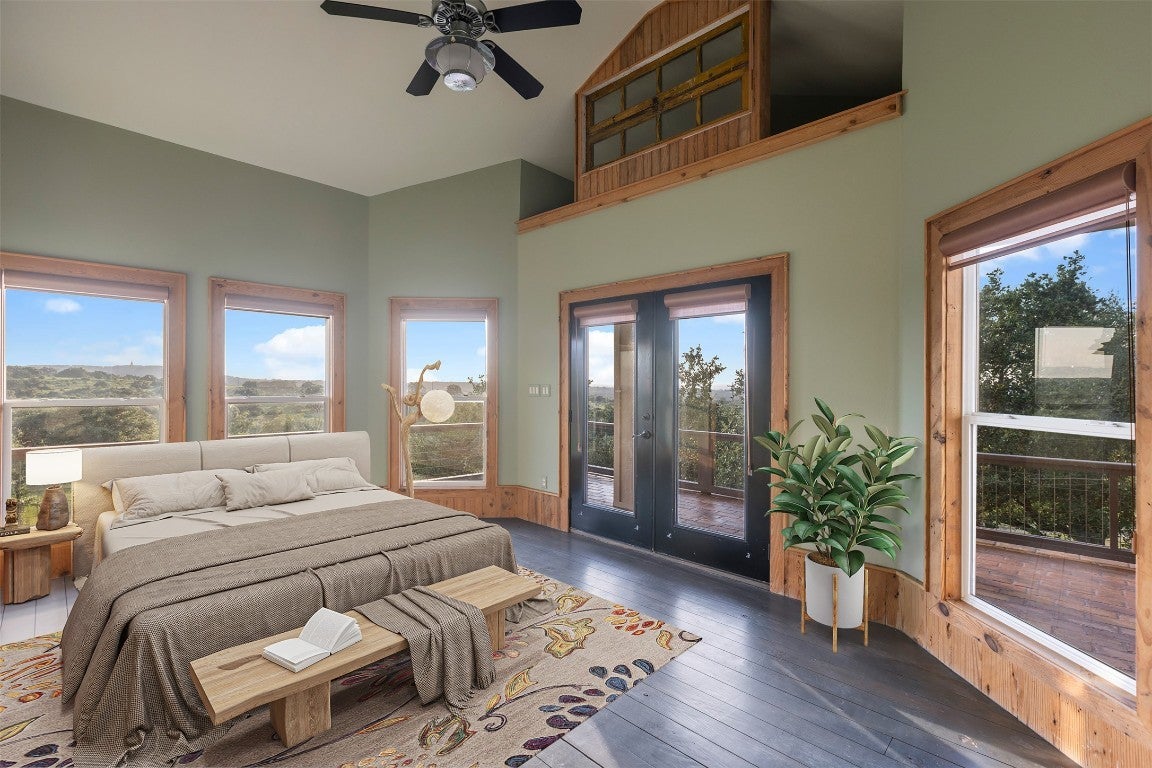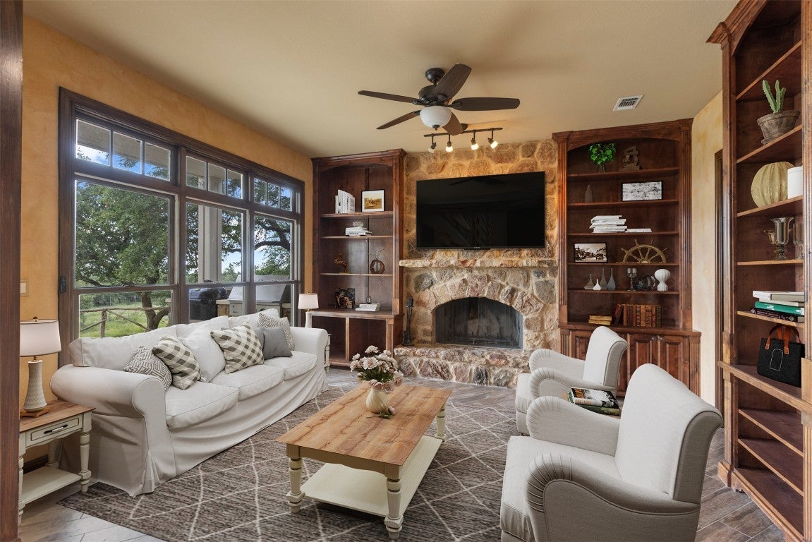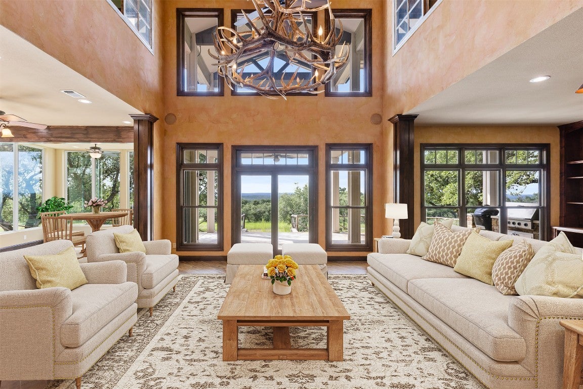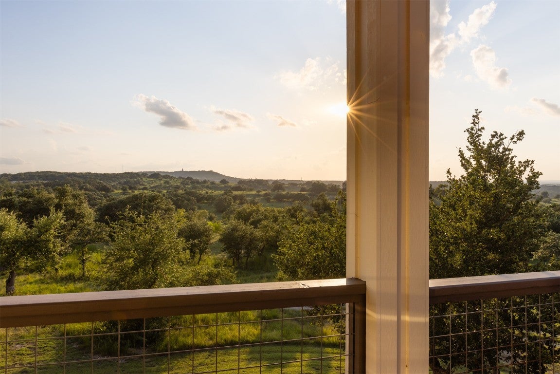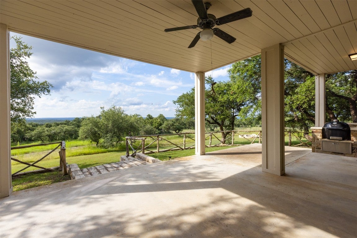 Experience luxurious Hill Country living at this 25-acre estate within gated Byrd Ranch Estates in Eastern Blanco County. Accessed by a picturesque bridge over Miller Creek, this private haven blends scenic beauty with opulent spaces. The property is cedar-cleared and high-fenced, with land sloping to reveal stunning northern views. Dominant hardwoods include live oak and Spanish oak. The lined, irrigated pond holds water year-round for bass and catfish. A water well services the property, and a rainwater collection system could be added. The property is high game fenced and ready to support just about any type of wildlife including exotics, horses and cattle. The main house features an open floor plan with a spacious kitchen, large dining area, and great room with a fireplace. A cigar and cordial room has antique windows and ports from an old ship. Giant ceilings lead to an upstairs bedroom, a game area with an additional fireplace, and an office or second bedroom. The guest house, connected by a covered walkway, includes four bedrooms, two baths, and a community living area. Multiple porches, patios, and sitting areas adorn all structures, and an attached multi-bay garage adds convenience. The outdoor area features a BBQ, a pavilion overlooking the pond, and a fire pit ring. The pond supports bass and catfish for fishing, and the hardwood cover attracts local wildlife. Conveniently located in the Texas Hill Country near Austin, San Antonio, Dripping Springs, Blanco, Johnson City, and Fredericksburg, this estate is ideal for family gatherings, entertaining, and enjoying the Hill Country.