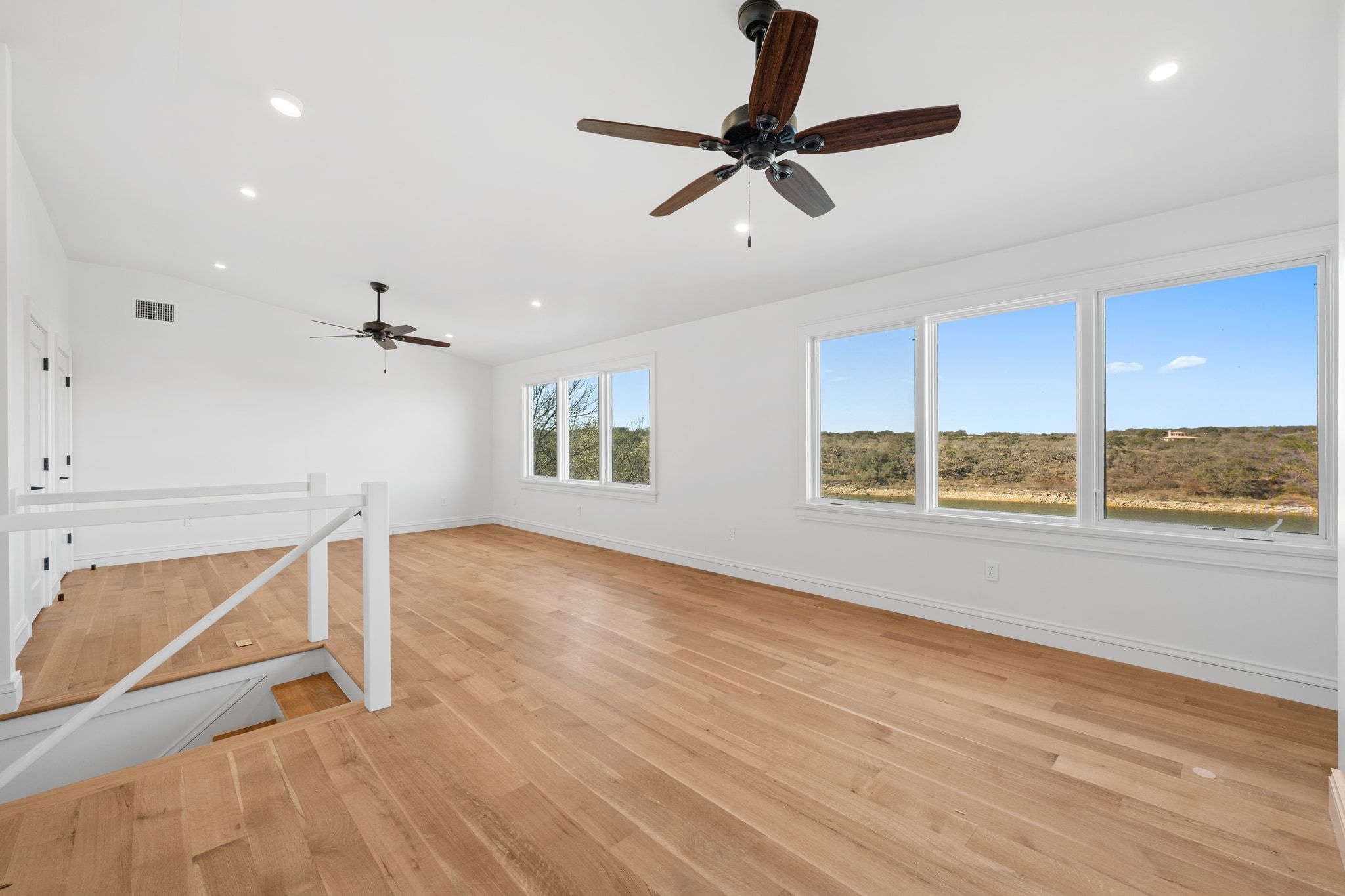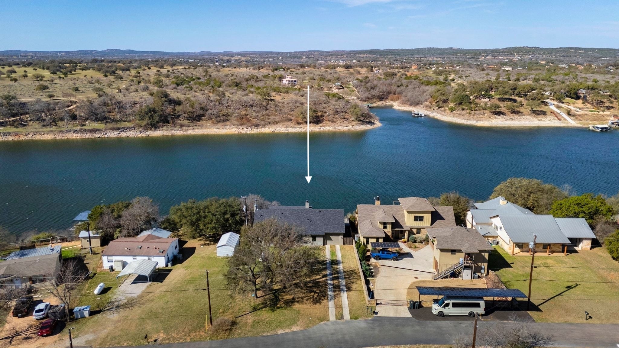 Upstairs offers a spacious open-concept layout with a full bathroom and two closets, providing an easy opportunity to create two private bedrooms. See builder drawings for measurements and potential layout in uploaded documents. Stunning waterfront retreat overlooking the Pedernales River and Lake Travis, where panoramic Hill Country views and peaceful lakefront living come together. Built by Bill Stone and Associates LLC, a respected Austin builder known for delivering high-end homes, this property blends thoughtful design with an exceptional setting. Perched above the shoreline, it captures breathtaking water vistas from expansive windows, covered outdoor living spaces, and a private elevated viewing deck perfect for sunset evenings and entertaining. Currently featuring 2 bedrooms and 2 bathrooms across 1,841 sq ft, the home offers a flexible layout ideal for a primary residence, second home retreat, or investment property. The upstairs level provides exceptional versatility as additional living space, a bunk room, game room, or future private bedrooms. Outdoor spaces are designed to maximize the setting, with multiple vantage points to enjoy sweeping water views and direct access toward the shoreline. Some images may include virtual staging to illustrate potential use of space, including a conceptual rendering of a boathouse and dock, which are not currently in place. With strong short term rental potential, buyer to verify, this property presents a rare opportunity to own a scenic Hill Country escape that blends lifestyle, flexibility, and income producing possibilities. A unique waterfront offering delivering both relaxation and long term upside in one unforgettable setting.