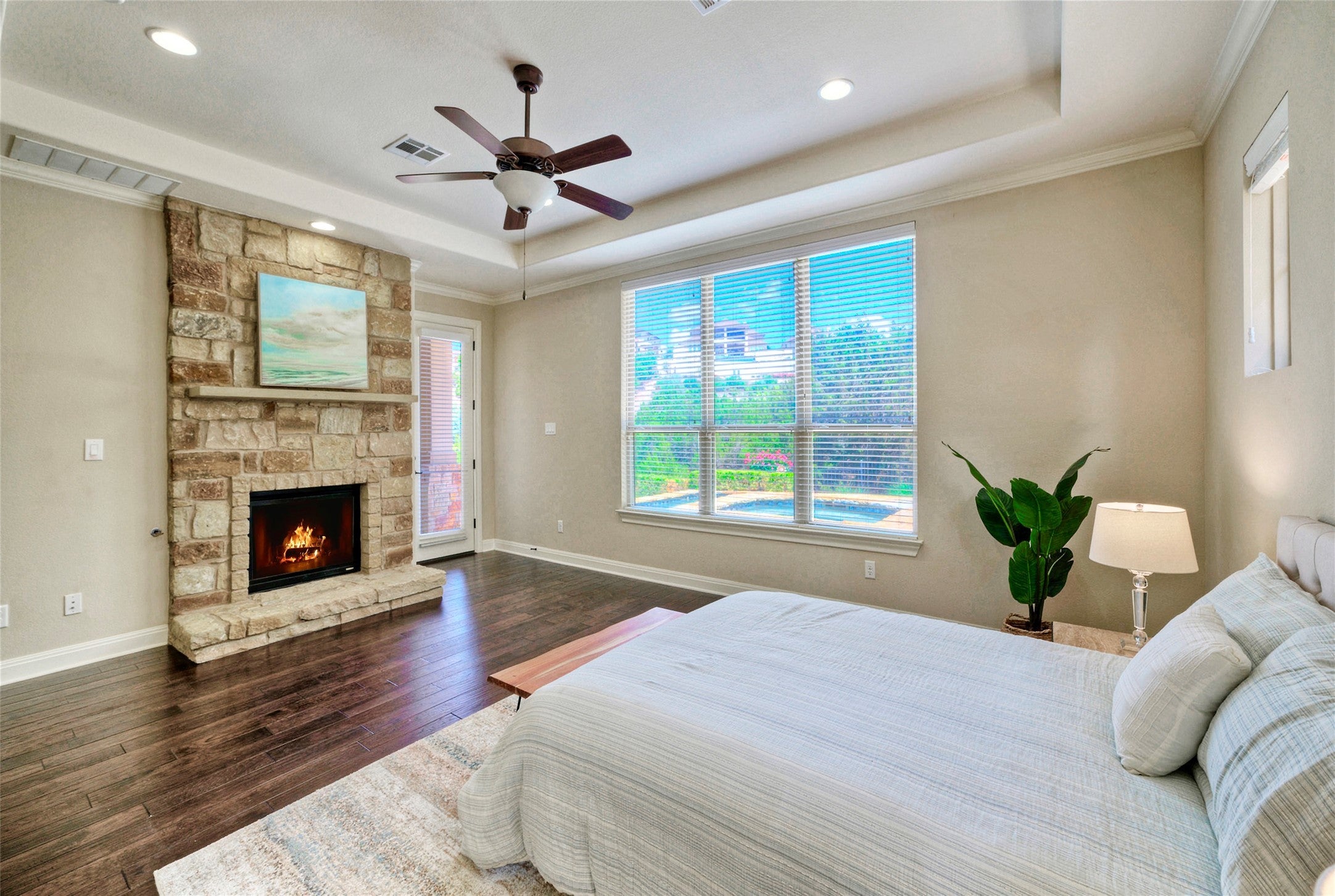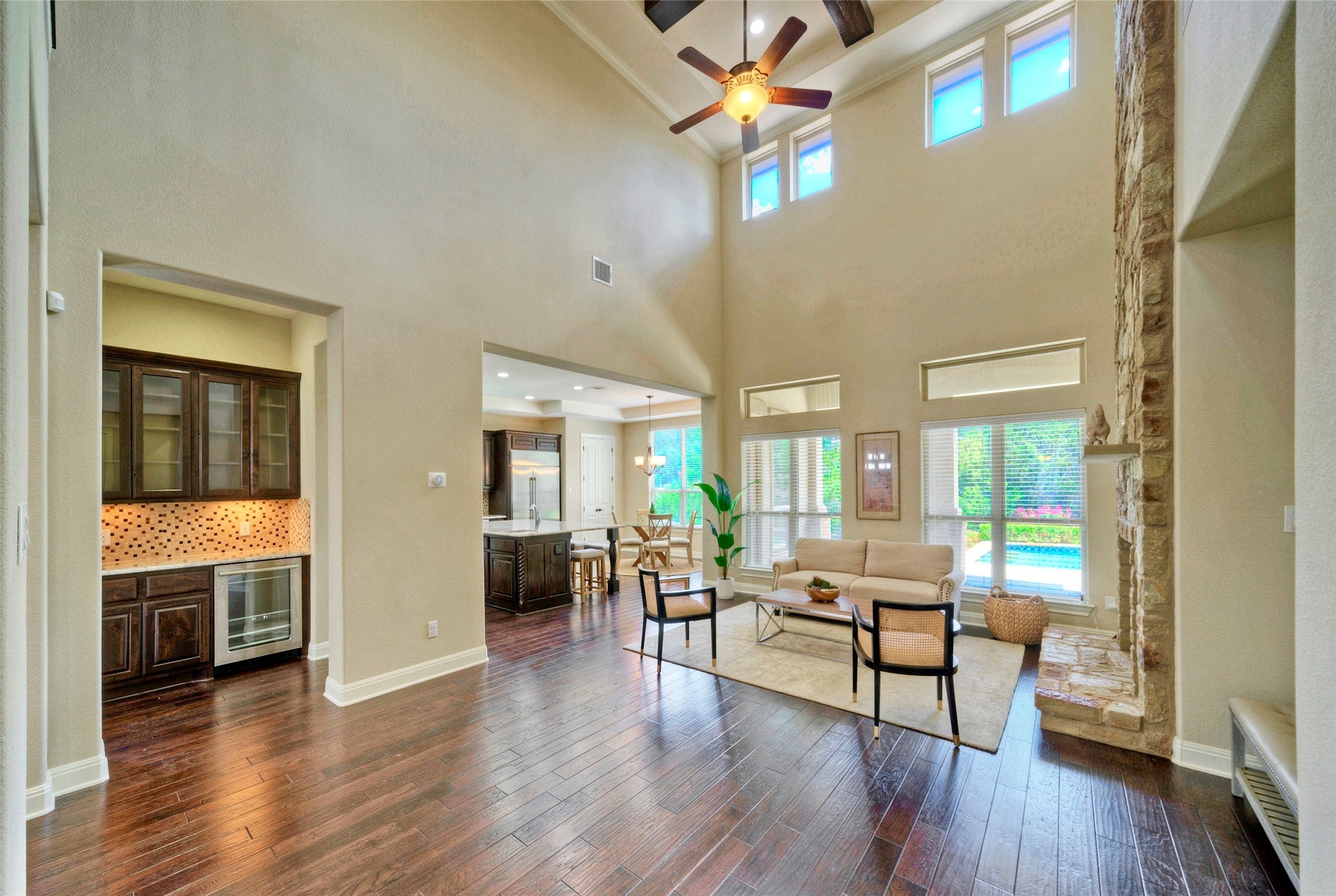 Discover this stunning home in Sweetwater's exclusive gated section of Davenport Summit, featuring a pool, spa, and breathtaking Hill Country views. The luxurious design includes hardwood flooring and abundant natural light. Highlights include a living room with two-story ceilings and a cozy gas fireplace, a spacious kitchen with high-end appliances, and multiple dining options. The primary suite offers walk-in closets, a gas fireplace, and access to the backyard, while the primary bath features dual vanities and a soaking tub. Additional spaces include an office, a media room, and a bonus room. The backyard is perfect for relaxation with a pool and grilling area. Residents enjoy a ten-acre amenity center with sports fields, pools, and trails, all within the sought-after Lake Travis Independent School District and near shopping and dining at Hill Country Galleria.