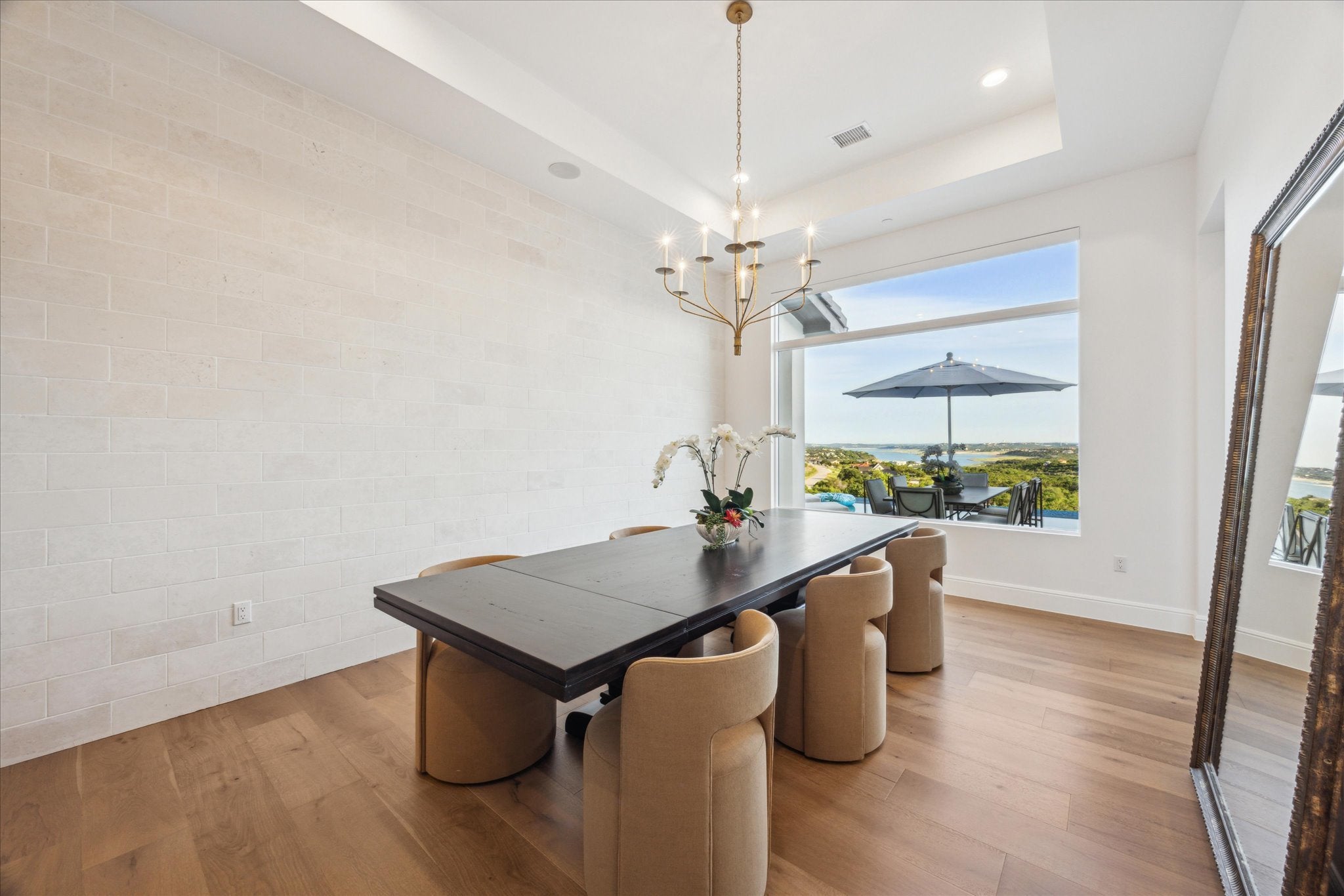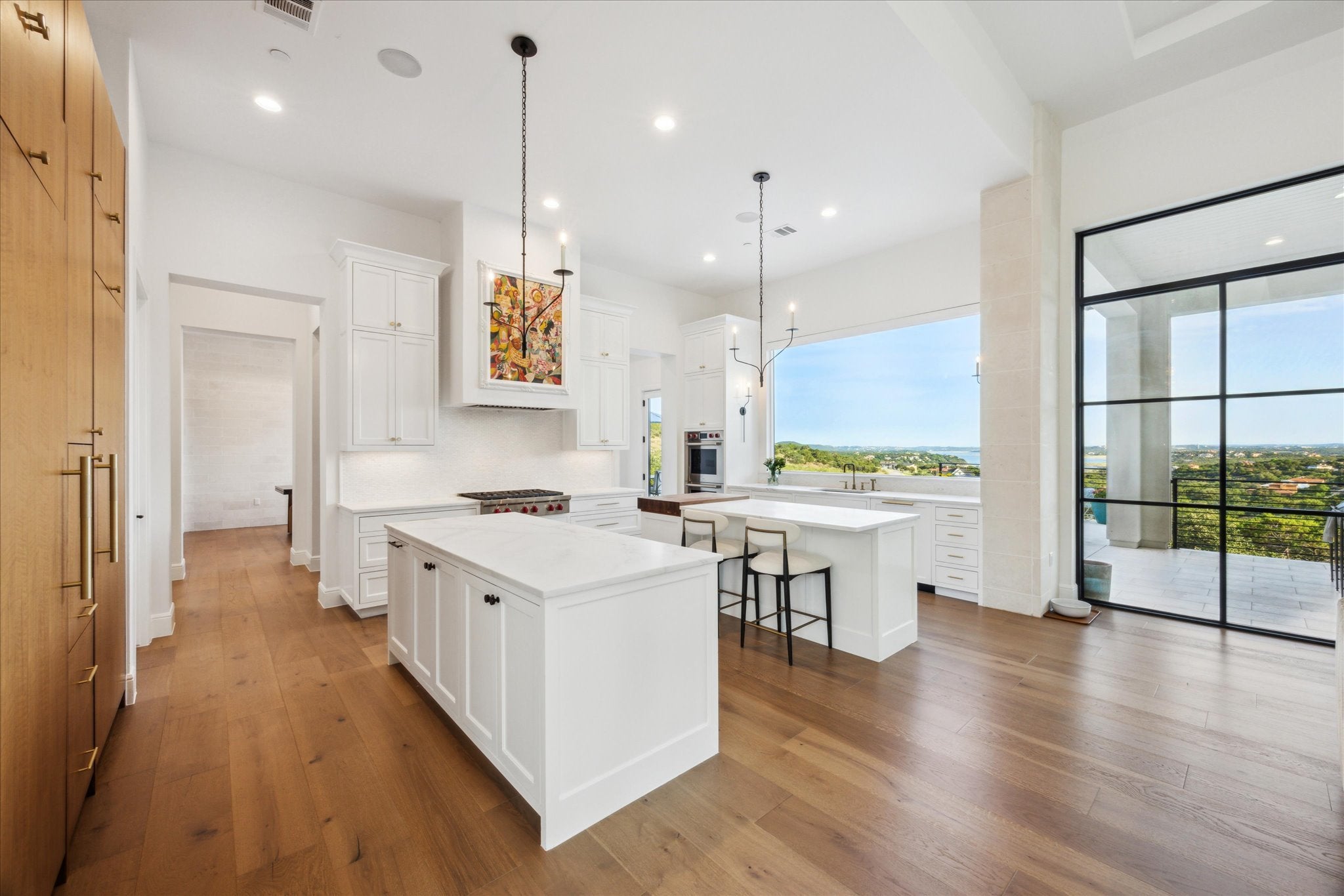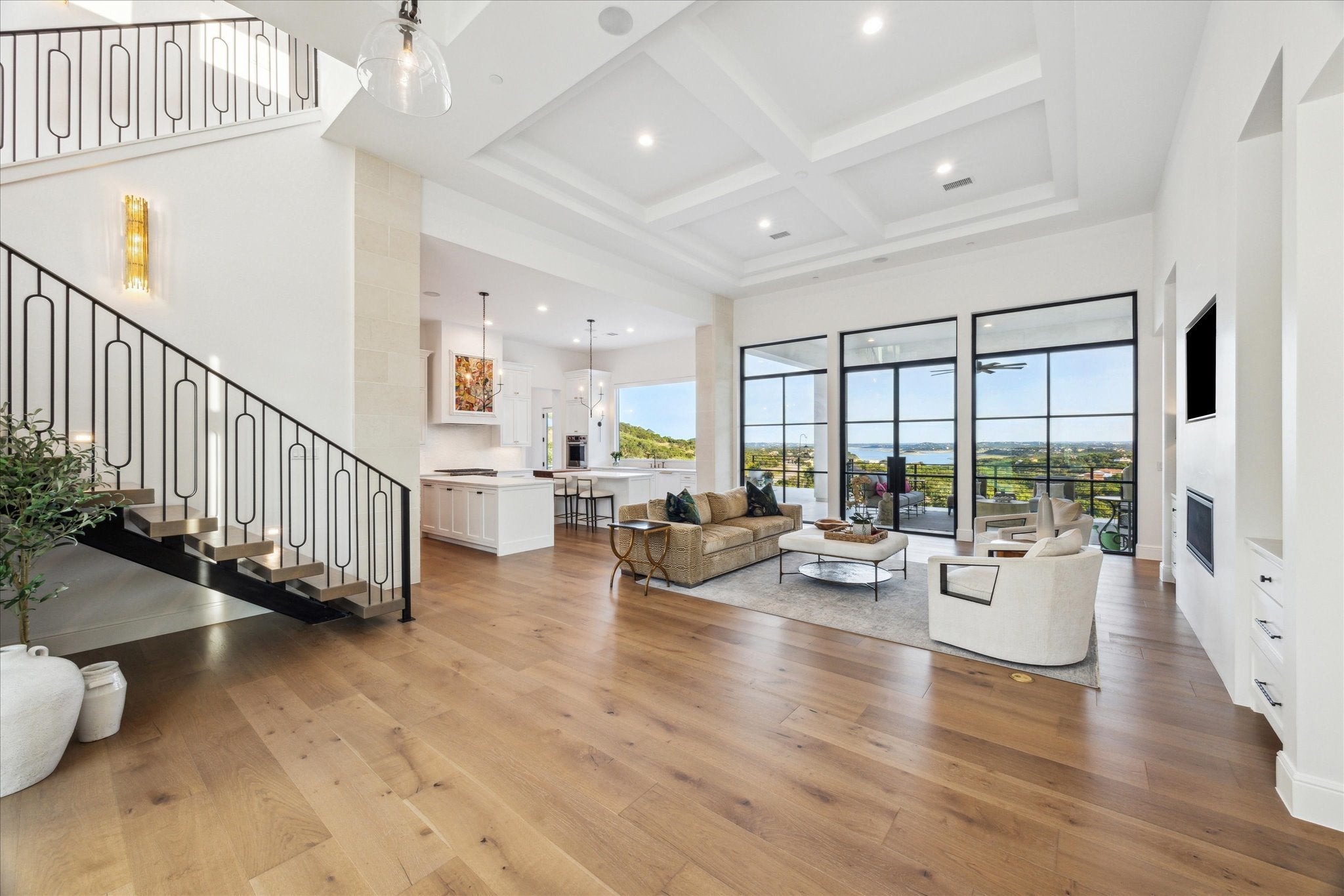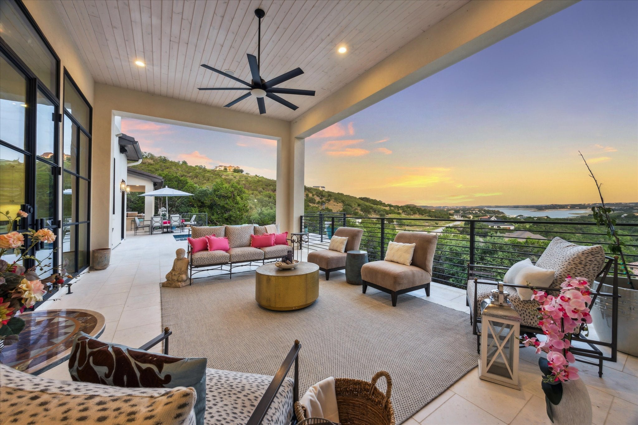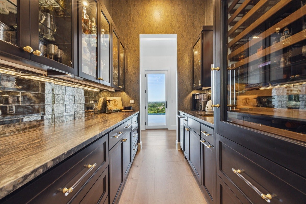 Tucked above Lake Travis in the gated community of Ranchland Hills, this modern Hill Country home by Zbranek & Holt Custom Homes was designed to frame the view. Every room faces the water, blending natural light, warm materials, and seamless indoor-outdoor living. Set on a private 1.66 acre hilltop lot, the home pairs contemporary architecture with a relaxed, refined Texas aesthetic offering comfort, craftsmanship, and a front row seat to the Hill Country. The open-concept design features pecan hardwood floors, soaring ceilings, and walls of glass framing the natural landscapes surrounding north Lake Travis. A chef’s kitchen anchors the home with dual marble islands, custom walnut accents, Sub-Zero and Wolf appliances, and an elegant butler’s pantry with wine storage, refrigerated drawers, Wolf warming drawer, and KitchenAid ice maker. Equipped with a whole house Fire Sprinkler System. The primary suite is a true retreat with lake views, a stylish fireplace in spa-inspired bath with soaking tub and walk-through shower, and a private outdoor shower immersed in a peaceful nature setting. A hidden passage leads to a custom office for work or quiet retreat. Outside, enjoy resort-style living with an infinity-edge pool by Athena Pools, perfectly positioned for sweeping lake views. The expansive covered terrace features multiple lounge areas, a built-in fireplace, and al fresco dining ideal for gatherings from sunrise coffee to sunset entertaining. Exterior lighting and professional landscaping enhance the home’s ambiance. Additional highlights include a media room, custom bunk room, oversized 3-car garage for Texas-sized vehicles, integrated smart-home systems, and low-maintenance grounds. Minutes from Lake Travis marinas, scenic trails, and Jonestown’s growing lakefront community, this modern Hill Country estate offers timeless architecture, resort-style amenities, and unparalleled privacy on an elevated, oversized lot overlooking the water.