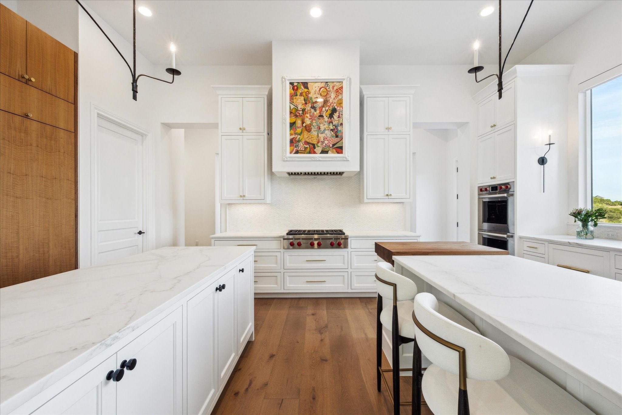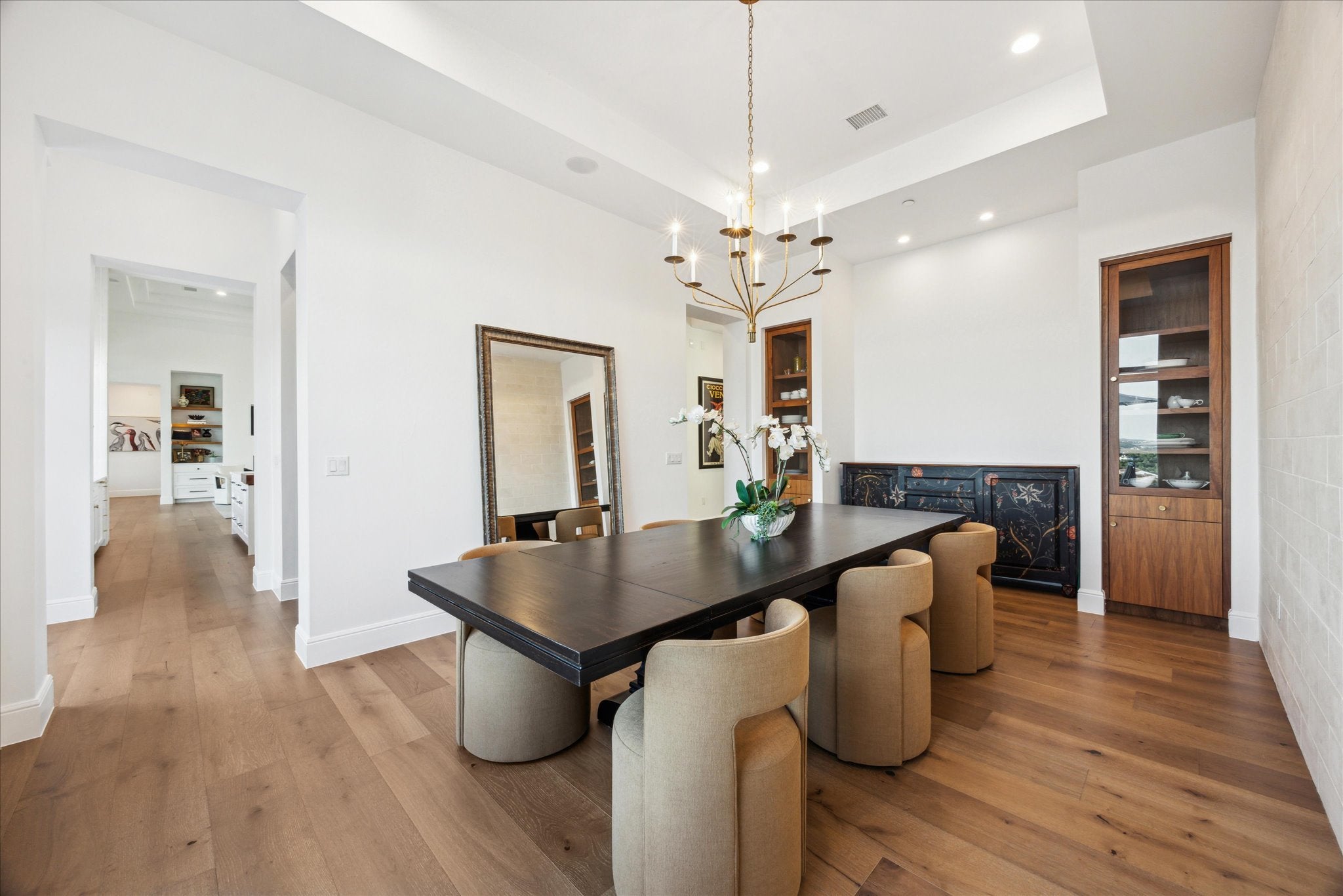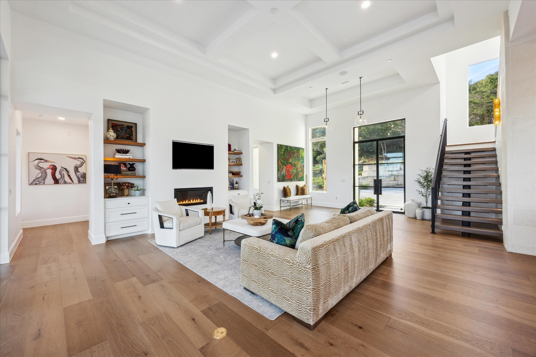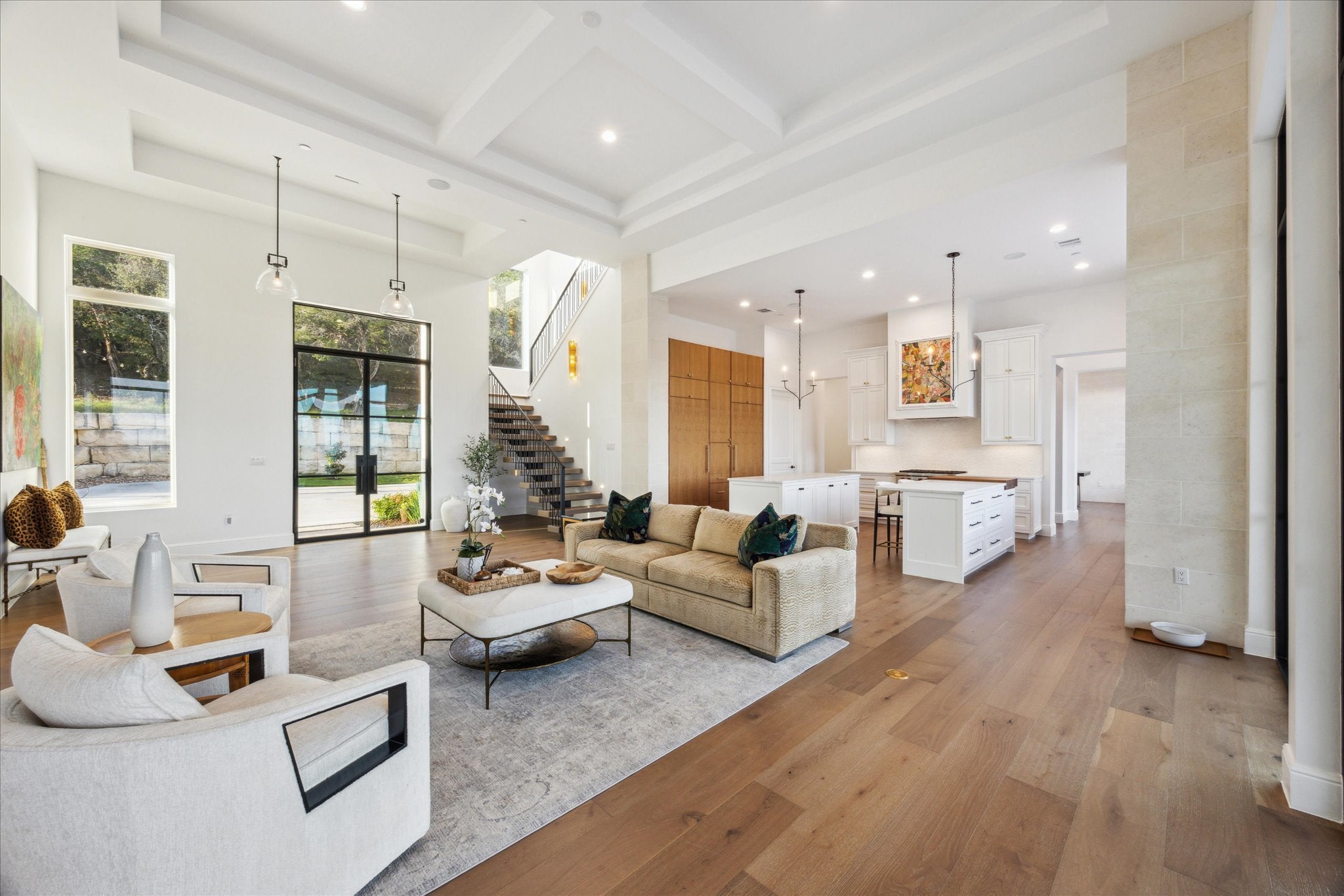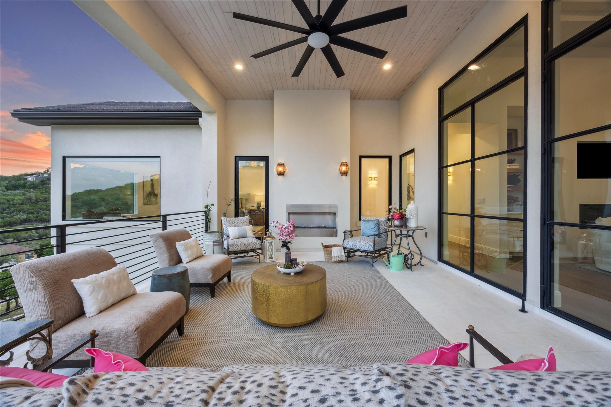 Tucked above Lake Travis in the gated community of Ranchland Hills, this modern Hill Country home by Zbranek & Holt Custom Homes was designed to frame the view. Every room faces the water, blending natural light, warm materials, and seamless indoor-outdoor living. Set on a private 1.66 acre hilltop lot, the home pairs contemporary architecture with a relaxed, refined Texas aesthetic offering comfort, craftsmanship, and a front row seat to the Hill Country. The open-concept design features pecan hardwood floors, soaring ceilings, and walls of glass framing the natural landscapes surrounding north Lake Travis. A chef’s kitchen anchors the home with dual marble islands, custom walnut accents, Sub-Zero and Wolf appliances, and an elegant butler’s pantry with wine storage, refrigerated drawers, Wolf warming drawer, and KitchenAid ice maker. Equipped with a whole house Fire Sprinkler System. The primary suite is a true retreat with lake views, a stylish fireplace in spa-inspired bath with soaking tub and walk-through shower, and a private outdoor shower immersed in a peaceful nature setting. A hidden passage leads to a custom office for work or quiet retreat. Outside, enjoy resort-style living with an infinity-edge pool by Athena Pools, perfectly positioned for sweeping lake views. The expansive covered terrace features multiple lounge areas, a built-in fireplace, and al fresco dining ideal for gatherings from sunrise coffee to sunset entertaining. Exterior lighting and professional landscaping enhance the home’s ambiance. Additional highlights include a media room, custom bunk room, oversized 3-car garage for Texas-sized vehicles, integrated smart-home systems, and low-maintenance grounds. Minutes from Lake Travis marinas, scenic trails, and Jonestown’s growing lakefront community, this modern Hill Country estate offers timeless architecture, resort-style amenities, and unparalleled privacy on an elevated, oversized lot overlooking the water.