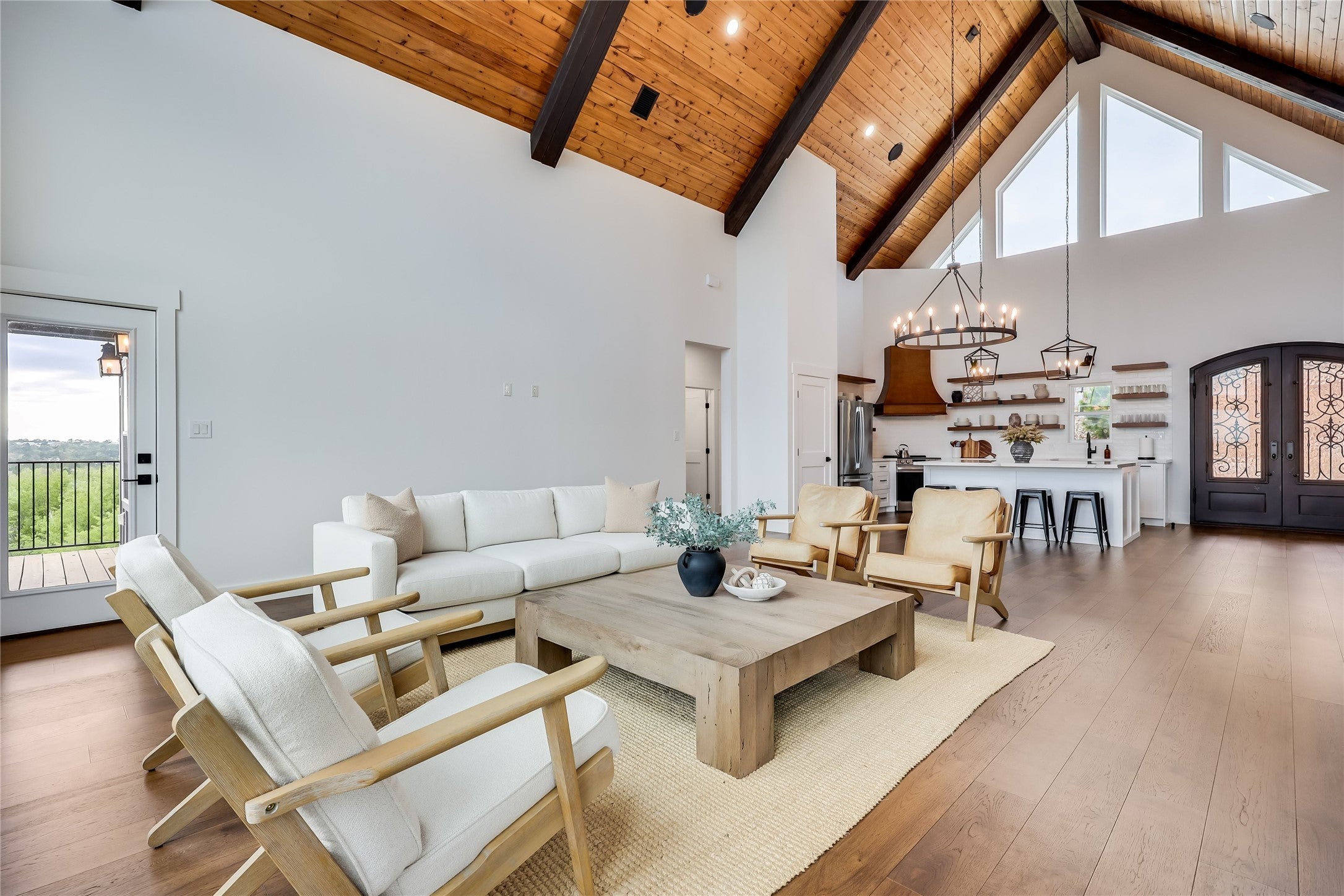 Custom-built and quietly commanding its setting in the Bastrop Pines, this 5-bedroom, 4-bath retreat spans just over two wooded acres with panoramic views and complete privacy. Created for those who value space and architectural presence, it offers room to live - and room to breathe. The main level centers around a dramatic great room with soaring wood-wrapped vaulted ceilings, exposed beams, and a wall of stacked windows framing uninterrupted forest views. A floor-to-ceiling stone fireplace anchors the space, while light pours in from every angle. Beneath the same sculptural ceiling line, the dining area glows under a classic candelabra chandelier, balancing rustic texture with modern refinement. The kitchen is designed for connection: an oversized island with seating, porcelain countertops, statement pendants, custom vent hood, contemporary cabinetry with floating shelving, and high-end stainless appliances - all seamlessly open to the living area. Privately positioned on the main floor, the primary suite captures long-distance views and features vaulted ceilings, a spa-inspired bath with soaking tub, frameless glass shower, dual vanity, designer tile, and a custom walk-in closet. A secondary main-level bedroom with adjacent full bath adds flexibility. Both open onto the entertainer’s covered balcony. Downstairs, a second living area opens to a covered patio and level lawn. A fully outfitted theater with surround sound, included media equipment, and tiered seating delivers a true cinematic experience. Three additional bedrooms offer thoughtful bath access for comfort and privacy. The irrigated backyard is level and usable, wrapped in professional landscaping and backed by dense woods for ultimate seclusion. Low 1.69 tax rate, no HOA, top-rated Bastrop ISD, quick access to Hwy 71, five minutes to Bastrop, and about 30 minutes to Downtown Austin. This one is a Must-See – schedule a showing today!