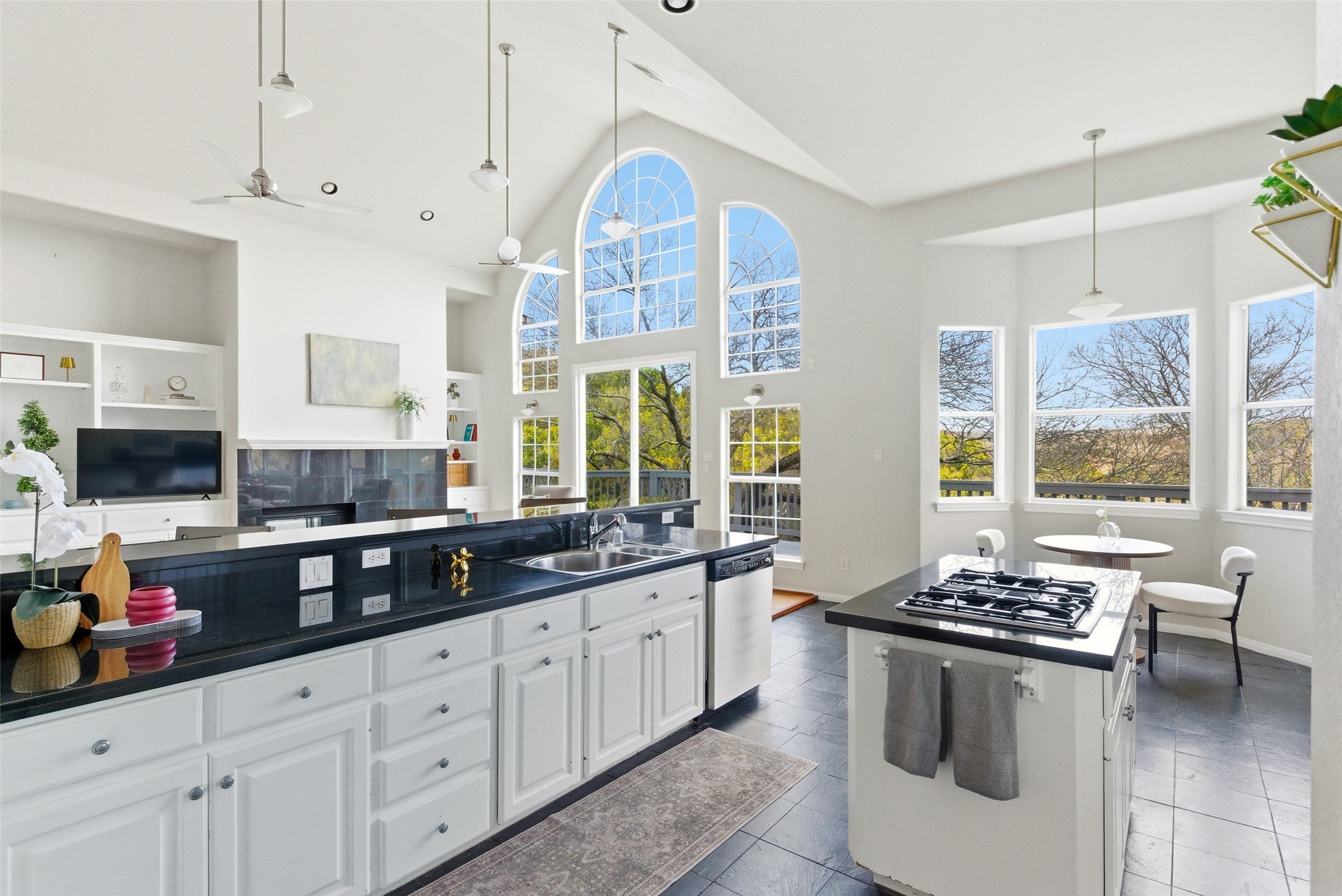 Incredible views set the tone throughout this Great Hills home. From the moment you enter, soaring ceilings, walls of windows, and abundant natural light create an immediate sense of openness and connection to the outdoors. The main level features an open floor plan where the living room flows seamlessly into the spacious kitchen, complete with a breakfast bar and inviting nook, all opening to a private deck, perfect for enjoying the peaceful surroundings. Additionally, on the main level, a dedicated office sits just off the entry, ideal for working from home or could be a fourth bedroom option. The primary suite is thoughtfully tucked away, offering a cozy fireplace and sweeping views that make it a true retreat. Downstairs, a second living area with deck access and a wet bar provides the perfect space for relaxing or entertaining. Two secondary bedrooms and a full bath complete this level, offering flexibility for guests or family. Just steps from Great Hills Country Club and less than ten minutes from The Domain and The Arboretum, this home delivers stunning views, privacy, and a prime Northwest Austin location.