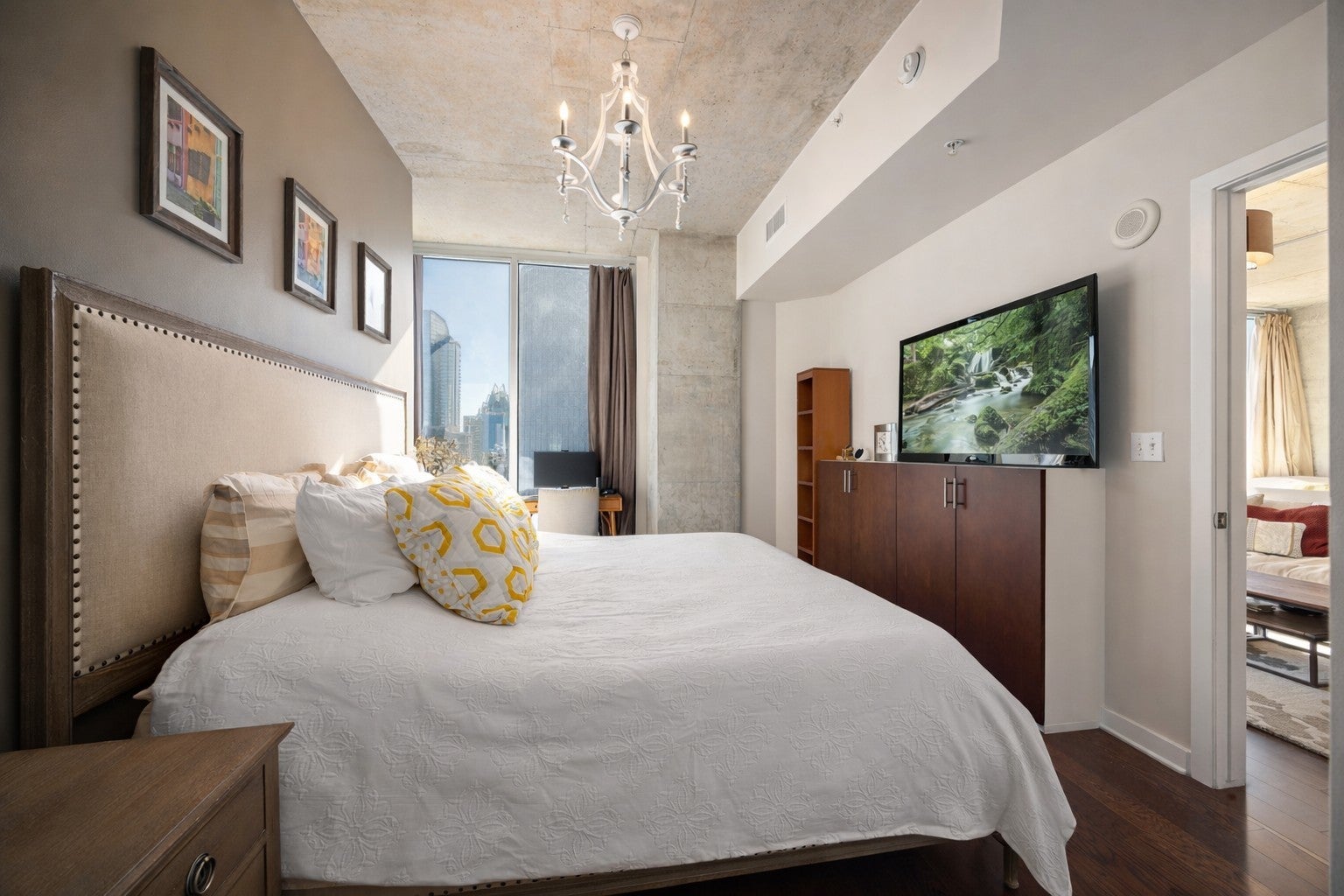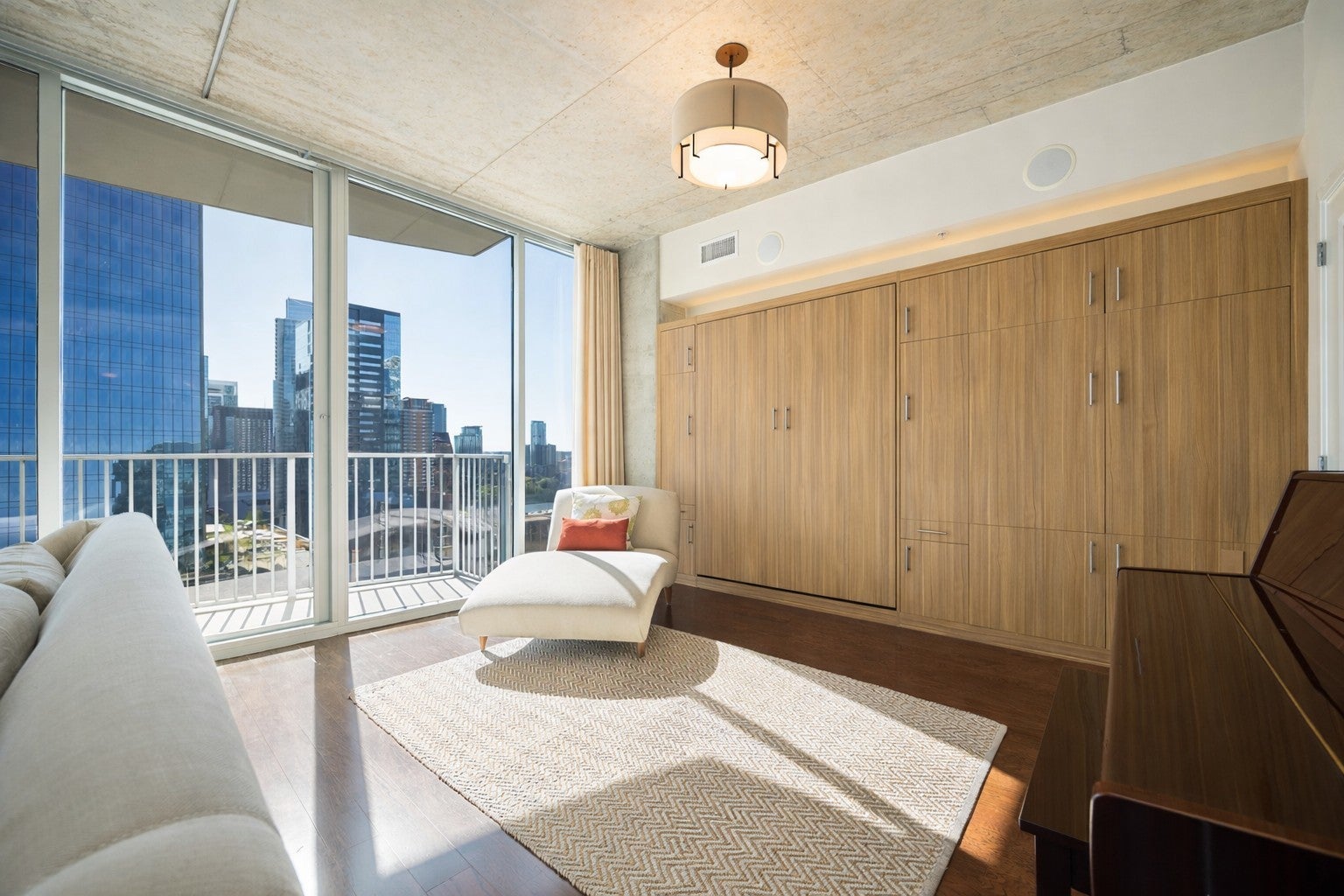 Experience downtown living in this well-maintained 2-bedroom residence at 360 Condominiums, ideally located in Austin’s vibrant Market District. Just steps from Lady Bird Lake, the hike-and-bike trail, Trader Joe’s, Whole Foods, Seaholm District, the Austin Central Library, and premier dining and entertainment, this home offers exceptional walkability and convenience. The flexible floor plan features a Murphy bed in the second bedroom, ideal for use as a guest room, home office, or multi-purpose space. Thoughtful upgrades include custom shelving in the living room, ELFA shelves throughout closets and storage areas, and added cabinetry in the bathrooms for enhanced organization and functionality. Enjoy a private balcony showcasing both downtown skyline and lake views. Residents of 360 Condominiums enjoy access to resort-style amenities, including a pool, fitness center, resident lounge, dog park, and 24-hour concierge service.