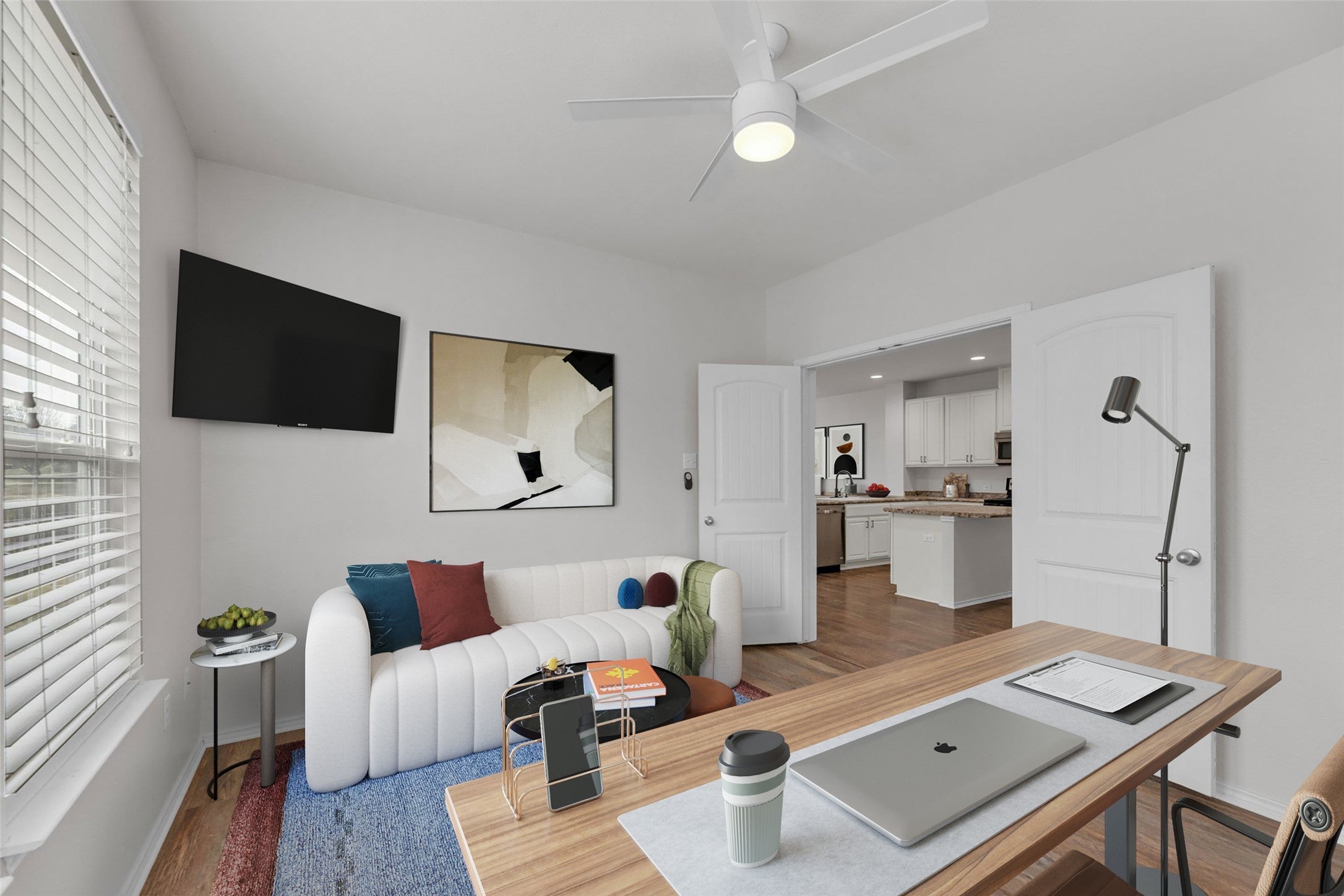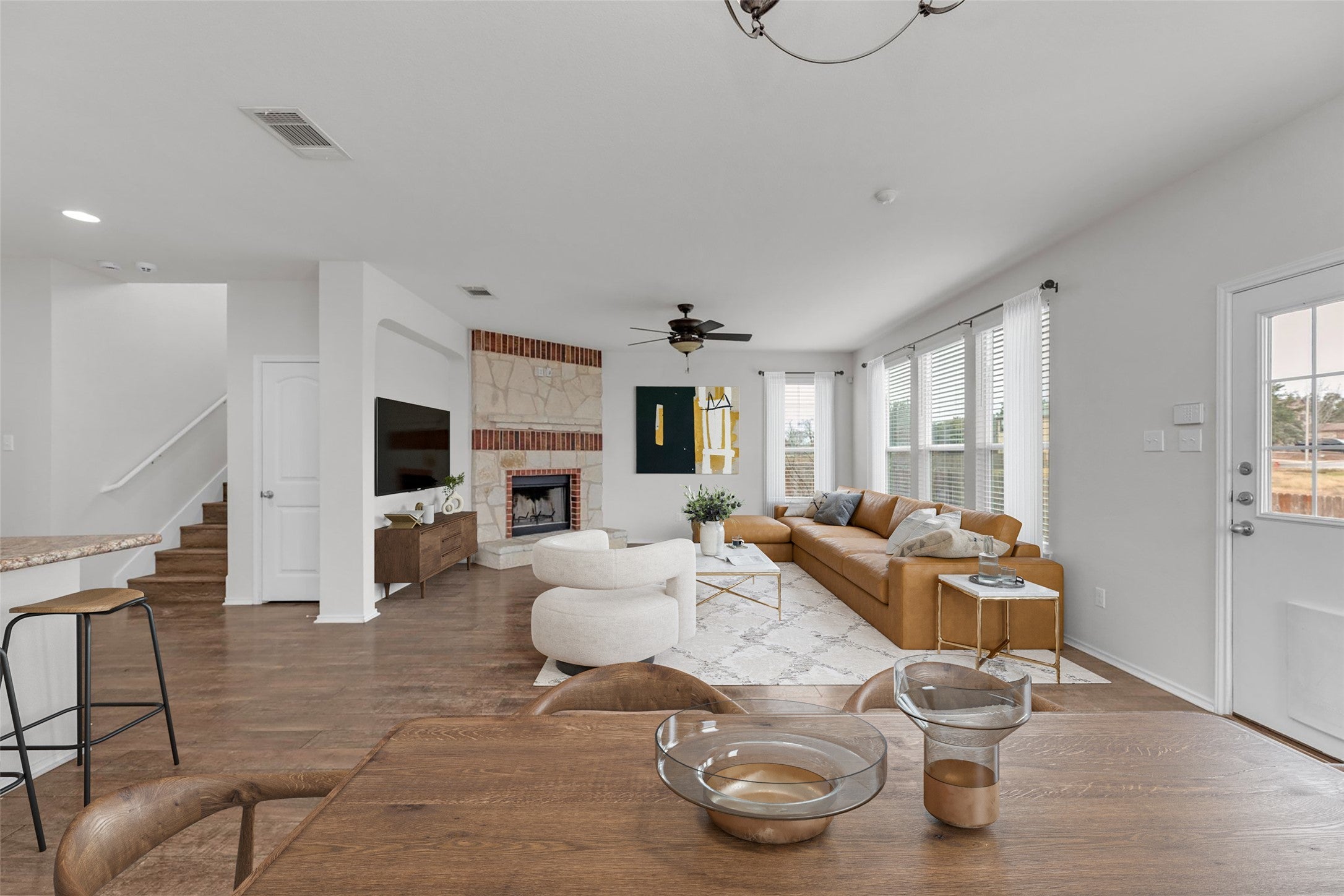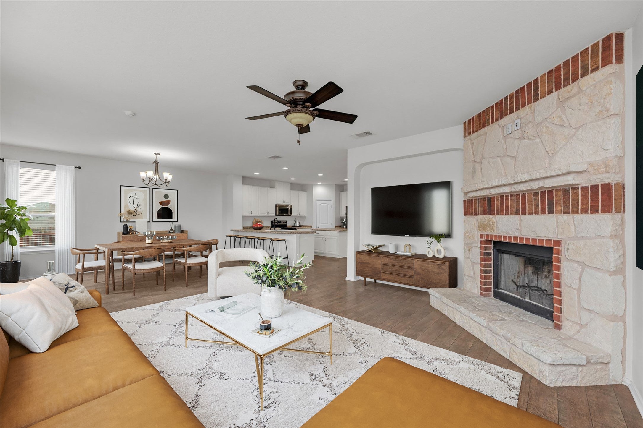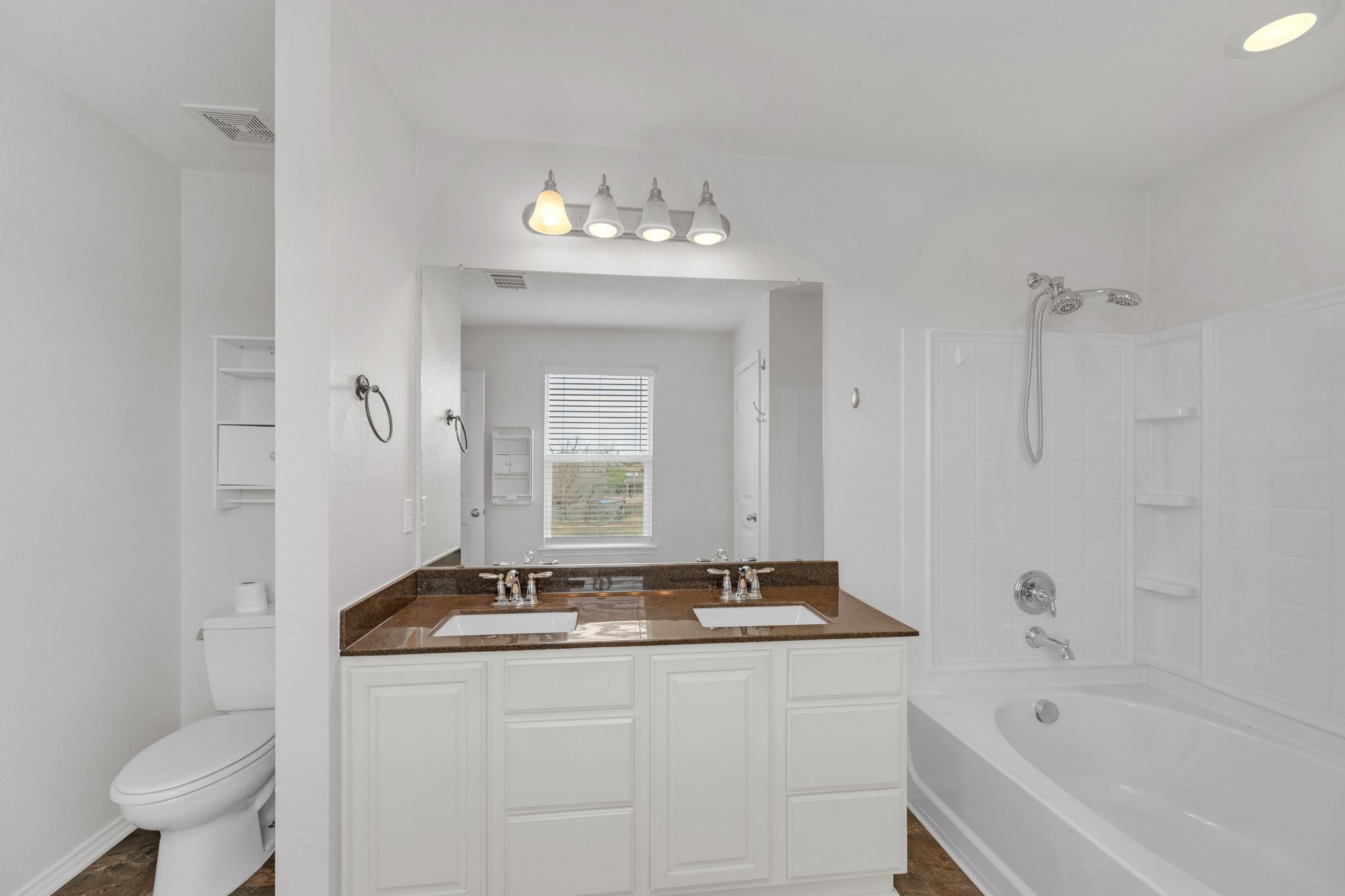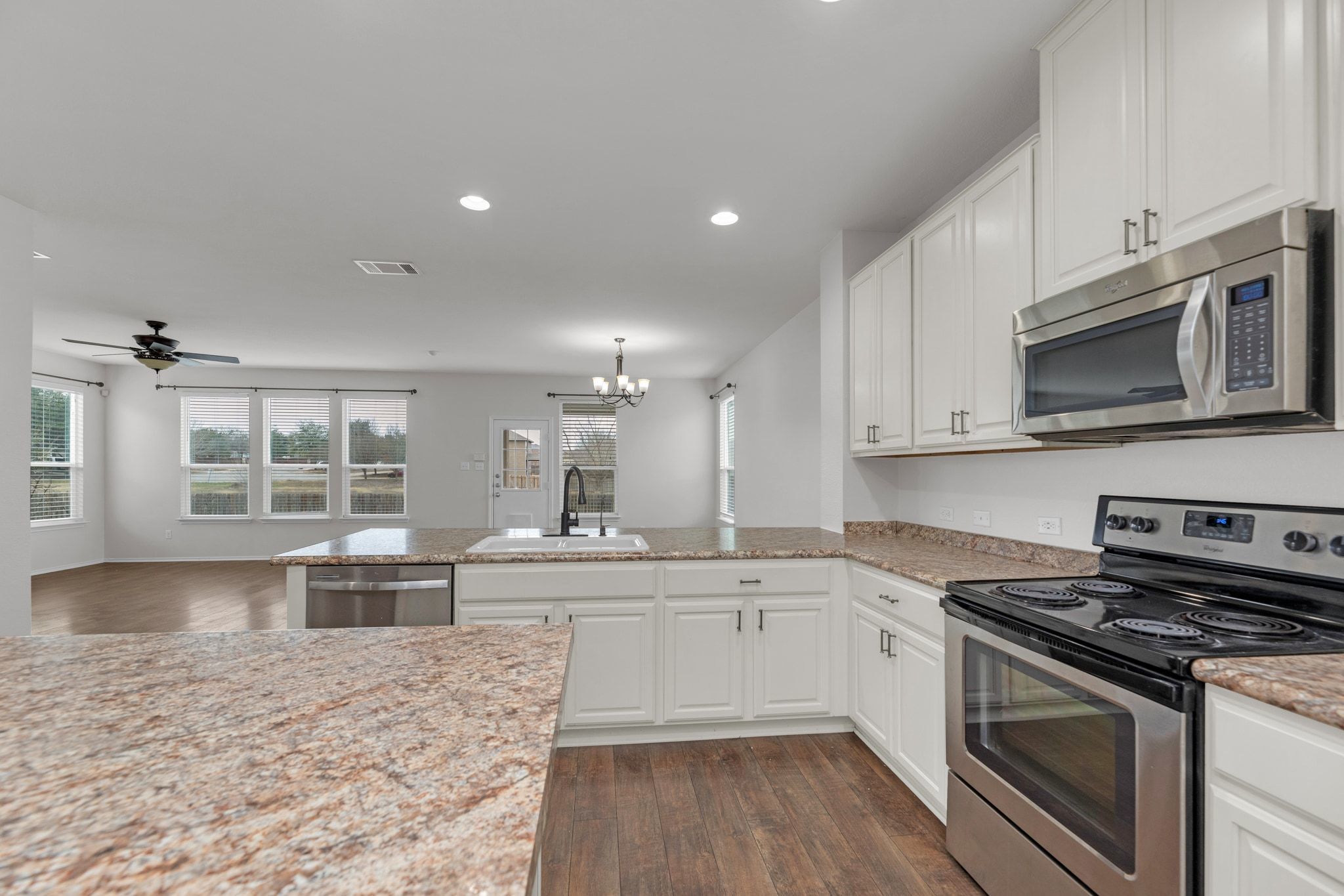 Available now, Located at 150 Jasmine in the Waterleaf community of Kyle, this four bedroom, two and a half bath home sits at the top of a cul de sac on an oversized lot backing to a quiet greenbelt with no neighbors directly behind. Built in 2014 and well maintained, the home has been recently painted and features no carpet throughout, making it clean and move in ready. The layout is open and filled with natural light from large windows across the main living areas. The kitchen is spacious and functional, offering stainless steel appliances, a center island, and a breakfast bar that opens directly to the dining and living spaces, making everyday living and entertaining easy. The living room features a stone fireplace that gives the space a comfortable, relaxed feel. A bonus room on the main level works well as a home office, second living area, gym, or playroom. Upstairs, the bedrooms are well sized and thoughtfully arranged. The primary suite provides room for large furniture, a walk in closet, and an ensuite bath with double vanities. Outside, a covered patio and extended custom deck look out over the greenbelt. The nearly quarter acre fenced backyard offers space to relax, host friends, or enjoy time outdoors with pets. Waterleaf includes a neighborhood pool, playground, and community events, with convenient access to I 35. Kyle continues to add new shopping, dining, and everyday conveniences nearby. Residents are minutes from the new Sprouts Farmers Market, H-E-B Plus!, EVO Entertainment, and Kyle Crossing. Local favorites like Snooze A.M. Eatery are popular weekend stops, and the area’s parks, trails, and open spaces contribute to the strong sense of community. With its proximity to Austin and San Antonio, growing amenities, and established neighborhood feel, Kyle is an appealing option for buyers relocating from out of state and looking to experience Central Texas living.