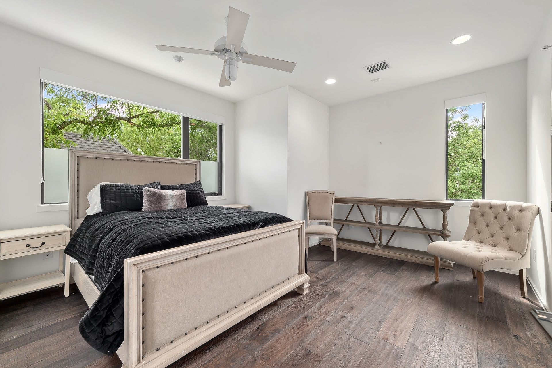 *Fully Furnished, available May 15th* With an unbeatable location, 1208 Hillside is the perfect retreat for Austin life. Built by Moore-Tate, the home exudes modern luxury and privacy (fully fenced front yard with gate) with all of the amenities Travis Heights and South Congress offer. This four bedroom, three bath home has an additional flex space, hardwood floors throughout, and a peaceful primary suite that includes a personal patio entrance, an oversized glass shower and soaking tub, and private laundry closet. Your guest suites upstairs have downtown views to wow the visitors you have. All of the large windows throughout give amazing natural light, and have automatic shades for easy living. Covered carport with automatic gate for privacy and off-street parking. Truly a lock & leave rental, ready for you to call home. Reach out to schedule an appointment for a private tour.