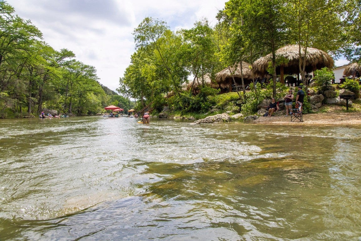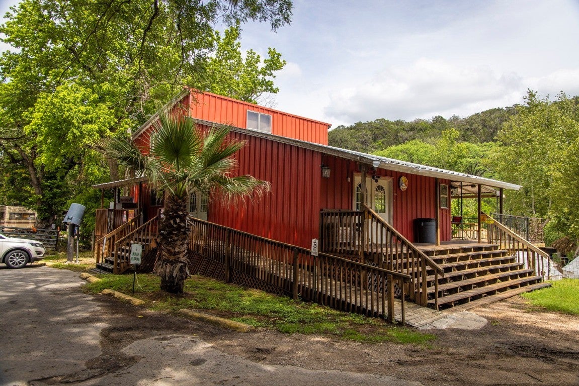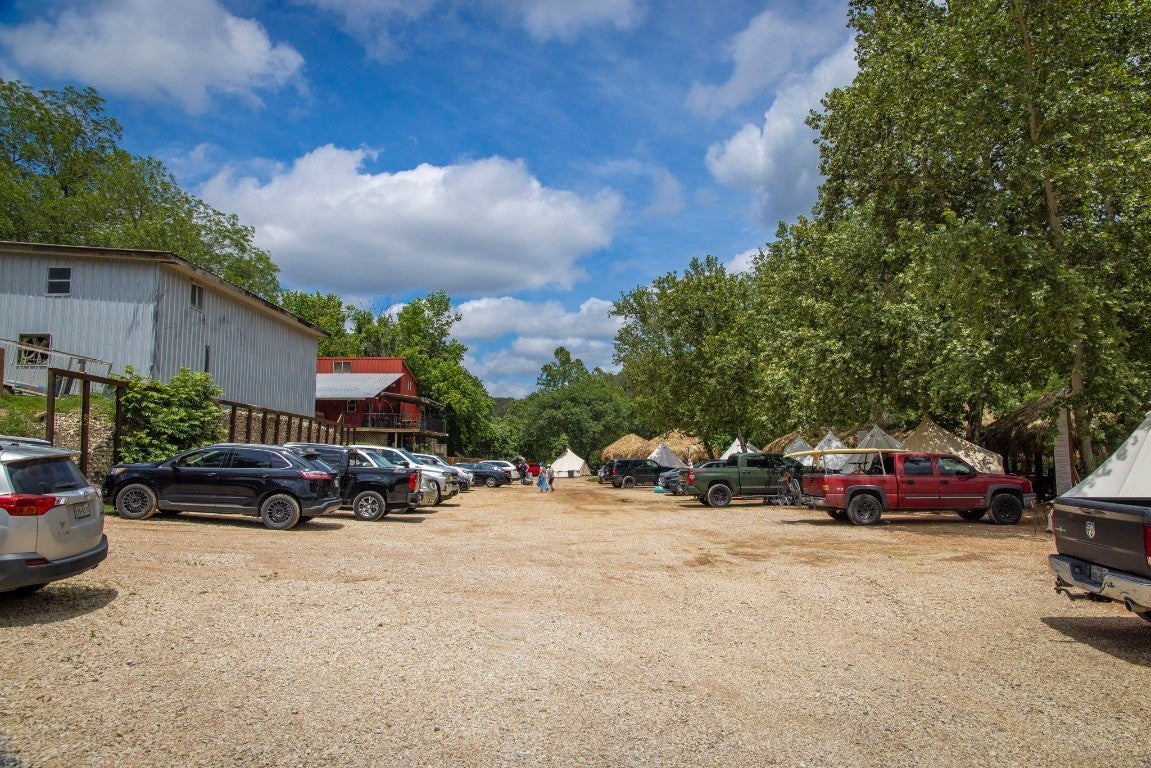 1.76 ACRES WITH OVER 345 FT ALONG THE GUADALUPE RIVER. RECREATIONAL BUSINESS OPPORTUNITY BETWEEN NEW BRAUNFELS AND CANYON LAKE. PROPERTY CONSISTS OF 3 BUILDINGS, 22 THATCH ROOF CABANAS, AND 15 GLAMPING TENTS. Red building contains office/check-in, bar and retail area, half bath, and upstairs bunkroom. Silver building houses the 5 bay bathroom/shower trailer, and features downstairs and upstairs storage for tubes, etc. The 2 story blue building would make a great 2 unit apartment with water facing views.