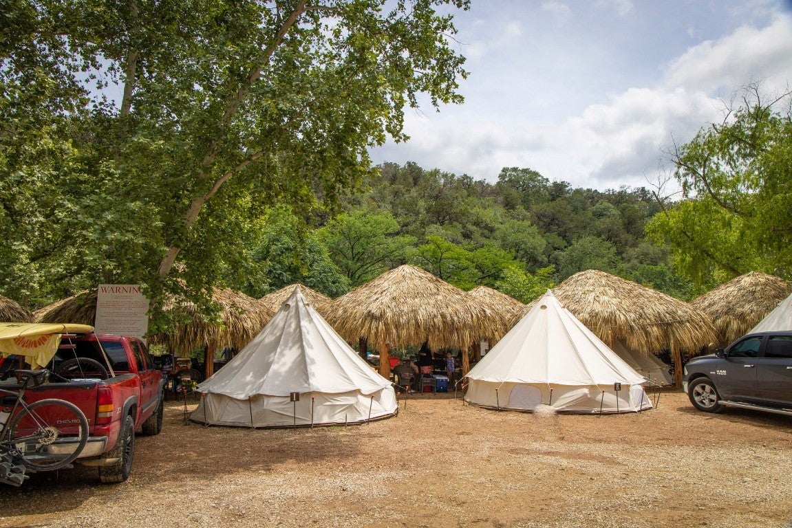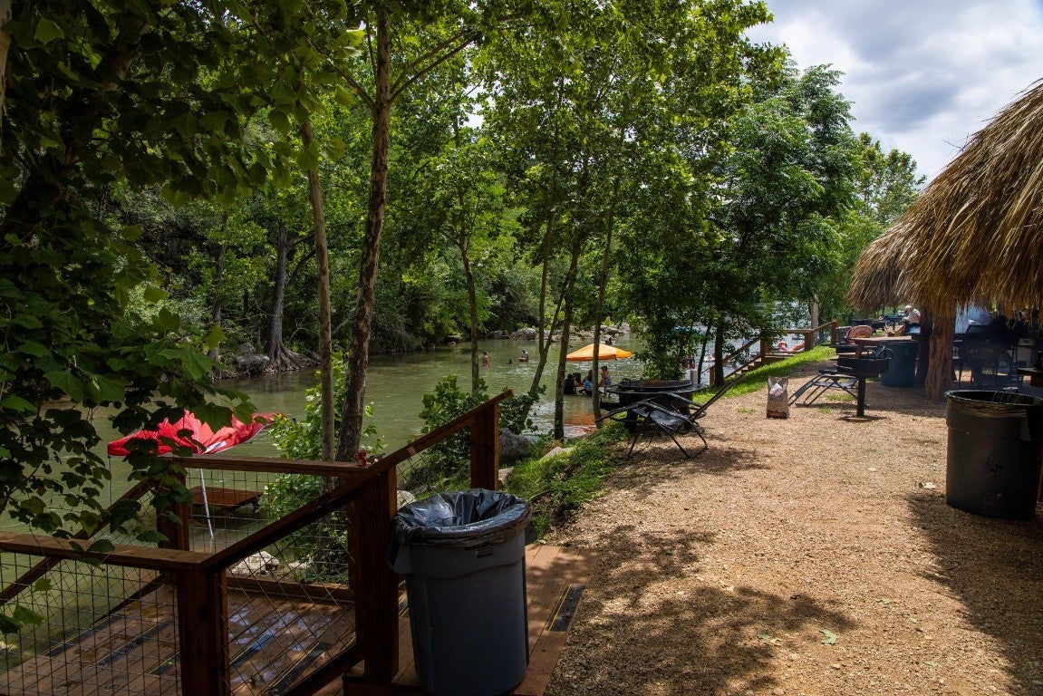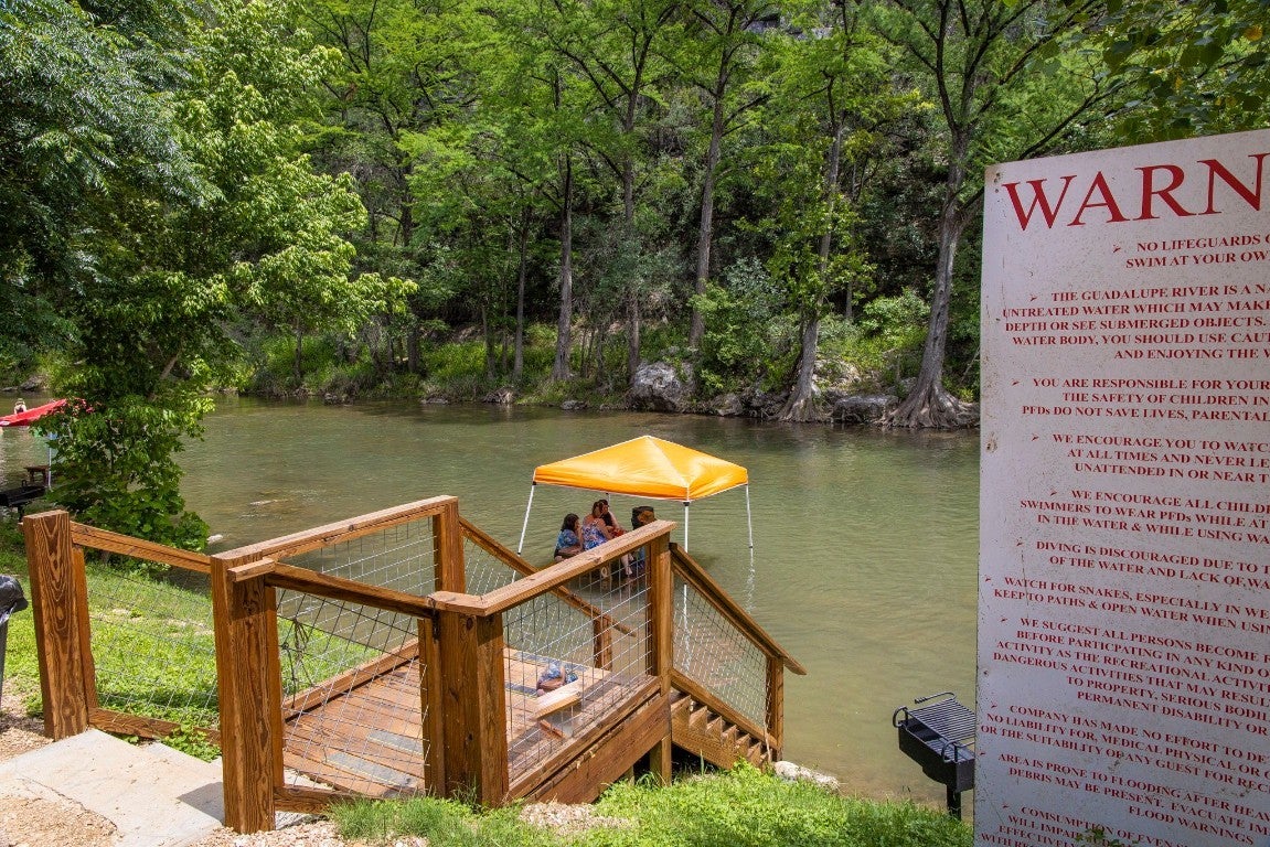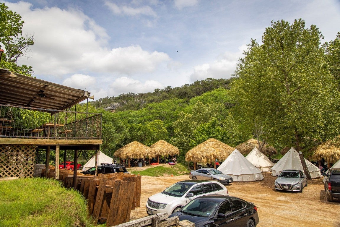1.76 ACRES WITH OVER 345 FT ALONG THE GUADALUPE RIVER. RECREATIONAL BUSINESS OPPORTUNITY BETWEEN NEW BRAUNFELS AND CANYON LAKE. PROPERTY CONSISTS OF 3 BUILDINGS, 22 THATCH ROOF CABANAS, AND 15 GLAMPING TENTS. Red building contains office/check-in, bar and retail area, half bath, and upstairs bunkroom. Silver building houses the 5 bay bathroom/shower trailer, and features downstairs and upstairs storage for tubes, etc. The 2 story blue building would make a great 2 unit apartment with water facing views.