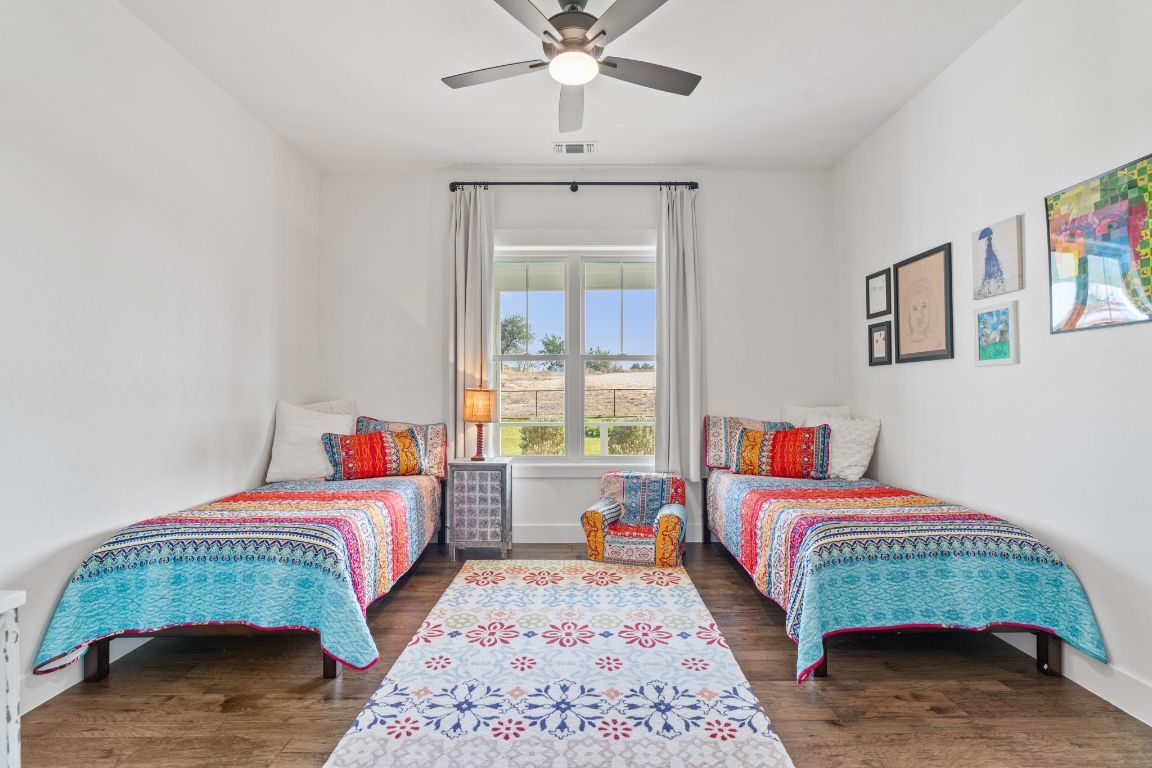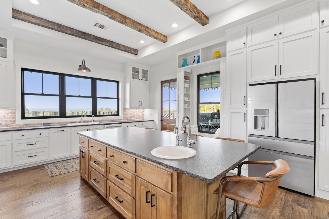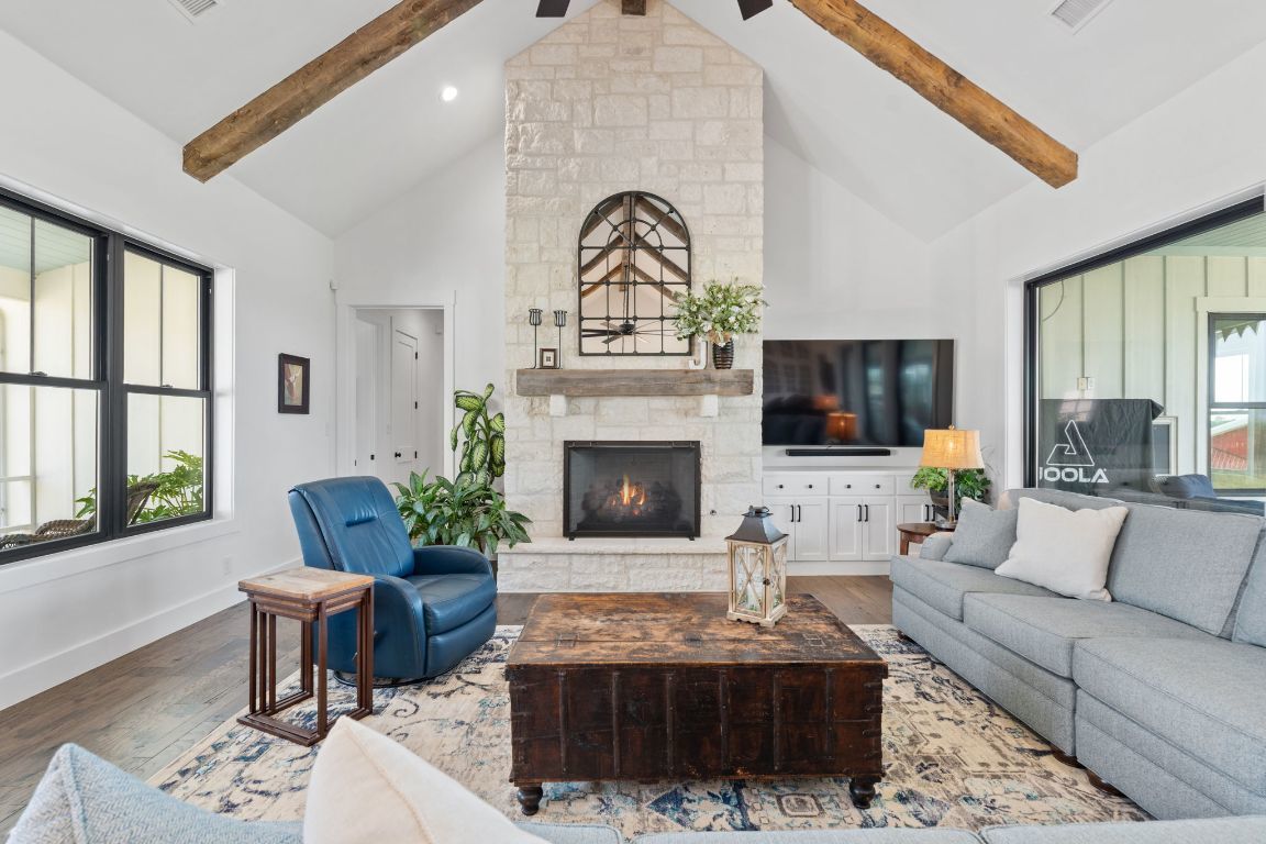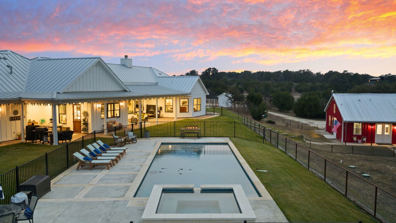 Set on 10 picturesque AG-exempt acres with sweeping Hill Country views, this exceptional single-story ranch-style almost 4400 sf estate offers privacy, comfort, and timeless Texas charm. A scenic drive leads to a thoughtfully designed residence with a heated swimming pool & hot tub, and stunning outdoor living spaces, an approximately 1280sf barn which includes an estimated 442 sf guest quarters, full bath and kitchenette. The heart of the home is a spacious kitchen featuring custom cabinetry, granite counters with chiseled edges, Chicago brick backsplash, walk-in pantry, large island, and dual-fuel cooking. The large open living area boasts a gas fireplace and a vaulted ceiling with exposed wood beams, creating a warm yet grand gathering space. One wing offers 3 bedrooms and 3 baths, including a flexible front room suitable as a playroom. The private owner’s suite is thoughtfully positioned on the opposite end of the house, featuring large windows that overlook the rolling Hill Country. This wing also includes two additional rooms—both with closets—ideal for extra bedrooms, offices, or hobby rooms, along with a hall bath, laundry room, and mud room. An approximately 8’ x 10’ heated and cooled storage room sits off the hall and leads directly to the double garage. This home was thoughtfully designed for comfort and efficiency, features solar screens, a whole-house generator, reverse osmosis system, water softener, and a high-capacity well. The roof was replaced in 2024, and there is a covered RV space attached to the barn offering convenience and versatility. Located just outside Johnson City, this rural retreat offers the perfect balance of seclusion and accessibility—Austin and San Antonio within a 60 min drive, and 30 miles to Fredericksburg’s renowned wine country, and close to numerous state parks and lakes. This is Hill Country living at its finest—beautifully designed, thoughtfully equipped, and ideally located.