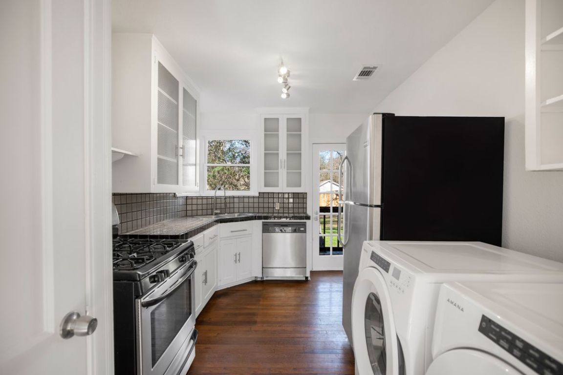 - Dryer, Free-Standing Gas Range, Stainless Steel Appliance(s), Washer, Gas Oven, Refrigerator
