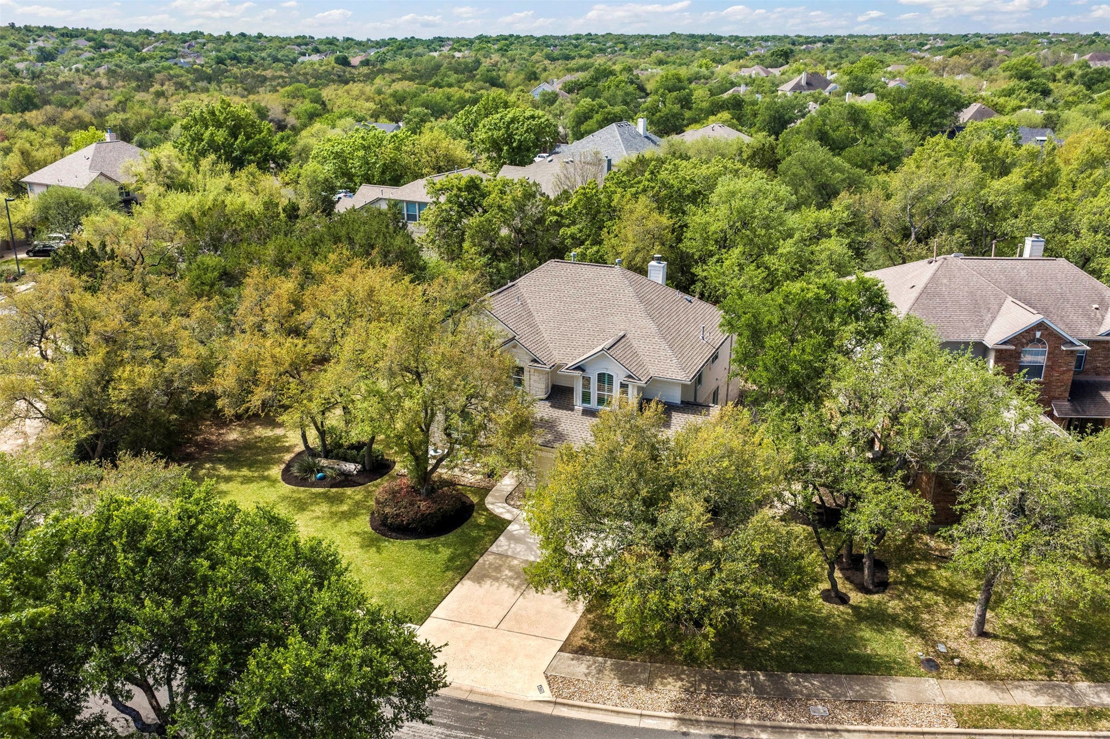 This Circle C Ranch 4-bedroom home on Hansa Loop offers a rare setup for those seeking a quiet retreat with the convenience of a premier Southwest Austin community. Tucked at the back of a street that functions like a massive cul-de-sac, the property sits on a unique lot bordered by greenbelts on two sides. Residents here enjoy a quick commute to the Circle C pool, Grey Rock Golf Course and the various social hubs that make Circle C Ranch a local favorite. Inside, the first floor is centered around a stunning two-story living room. A stone fireplace serves as the focal point, flanked by built-in bookshelves and a wall of arched windows fitted with wood shutters. The open concept kitchen is outfitted with granite countertops, a tile backsplash, and stainless appliances including a gas cooktop and double ovens. A breakfast bar offers a spot for quick meals and drinks. The primary suite is located on the main floor, featuring a tray ceiling and a wall of wood-shuttered windows that look out into the backyard greenery. The ensuite bath feels like a personal spa, equipped with a dual vanity and an expansive walk-in shower with wrap-around tile and a bench seat. The dedicated office off the foyer provides a quiet, separate workspace. Upstairs, a second living area or game room creates a central hub for three guest bedrooms. One of these rooms includes its own private ensuite bath, ensuring a comfortable setup for visitors. The backyard is a park-like escape with massive trees and no neighbors directly behind the property. Solar panels on the roof assist with energy efficiency. Just across the street, you can hop onto the neighborhood trails that lead to Circle C Metropolitan Park. While it feels like a private pocket of the Hill Country, you are only 12 miles from Downtown Austin and 18 miles from the airport, with easy access to Mopac and Highway 45 for quick trips to HEB, Alamo Drafthouse, and Escarpment Village dining.