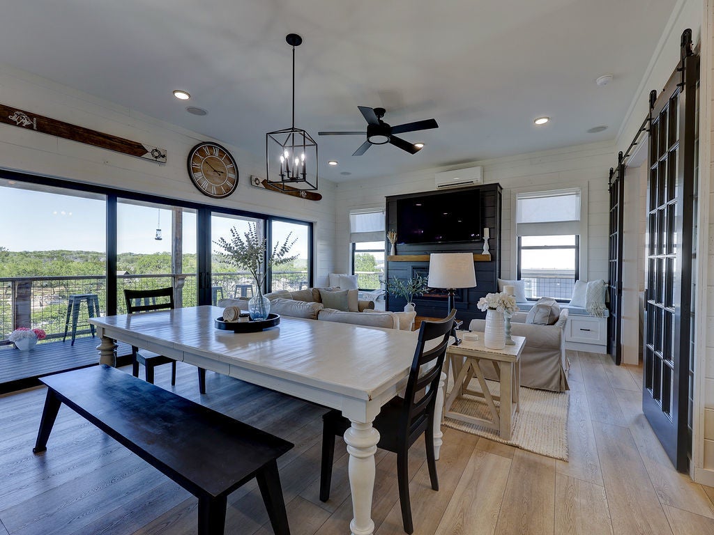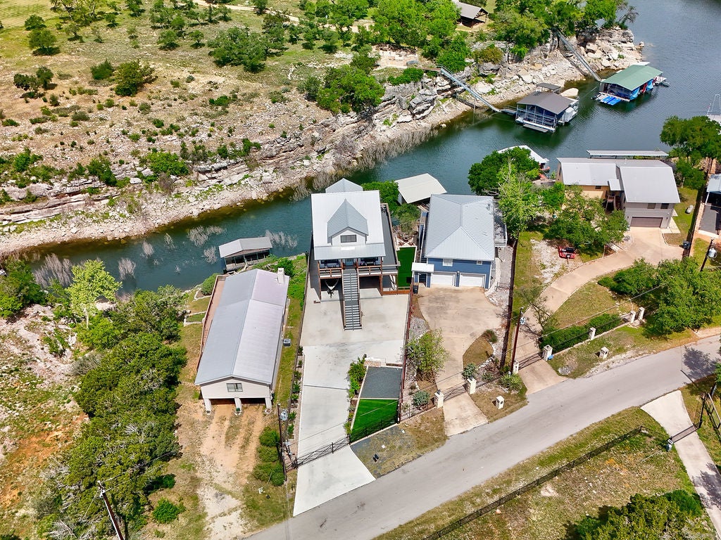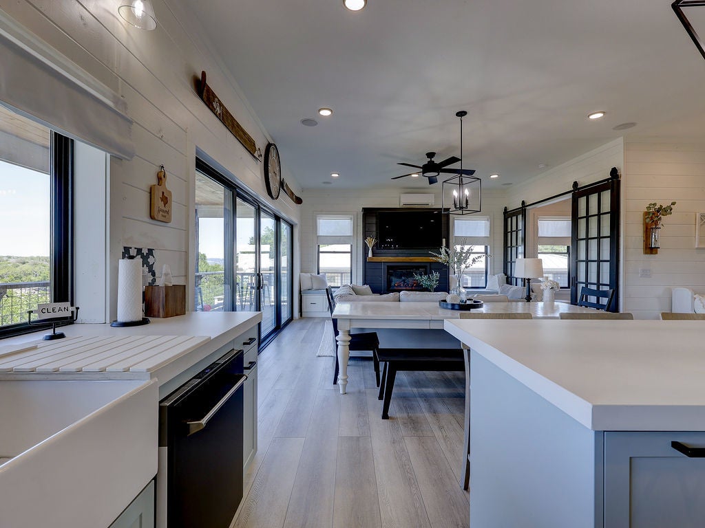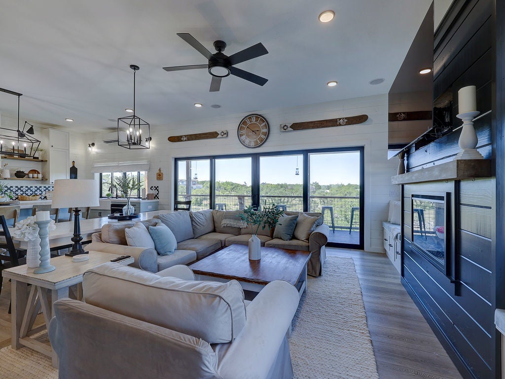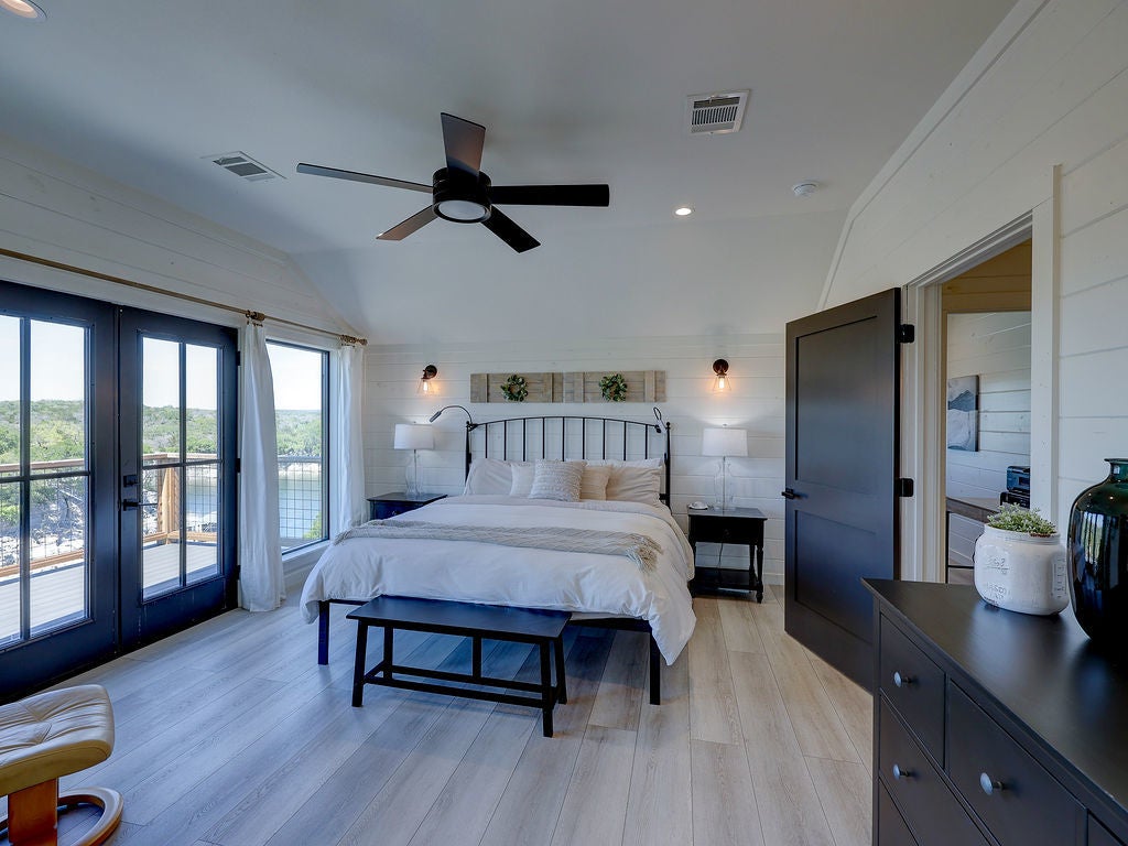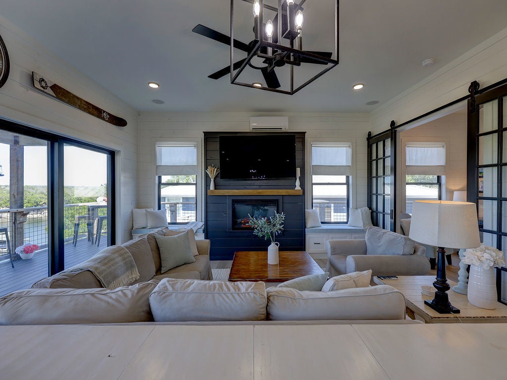 Set along the waterfront shores of Lake Travis in a peaceful, protected cove, this custom coastal-inspired modern farmhouse offers a rare opportunity for relaxed, low-maintenance lake living. Designed for those seeking a quiet retreat rather than a high-traffic recreational setting, the home blends thoughtful design, elevated views, and effortless indoor-outdoor flow—perfect for full-time living or a turnkey second home. The expansive wraparound porch invites slow mornings with coffee overlooking rolling countryside and grazing horses, while evenings are best spent unwinding on the back deck with serene lake and tree-filled views. Rebuilt and completed in Fall 2022 and elevated to meet updated floodplain requirements, the home feels nearly new while offering peace of mind and sweeping vantage points from nearly every room, window, and outdoor living space—creating a constant connection to the surrounding lake and landscape. Inside, natural light fills the space, with large sliding glass doors opening seamlessly to outdoor living. The kitchen is both beautiful and functional, featuring Z-Line appliances, an 8-burner dual-oven gas range, farmhouse sink, leather-finish porcelain countertops, and a large central island. Warm, character-rich details like shiplap walls, barn doors, iron railings, and window seats create a welcoming, lived-in feel. The protected cove is ideal for kayaking, paddleboarding, and fishing, offering calm water enjoyment from your private dock. With ensuite bedrooms, flexible office spaces, and generous storage—including ~1,520 sq ft of unfinished lower-level space ready for customization—this home offers versatility without excess. Available furnished for a true turnkey experience, and located near Briarcliff marina, Pace Bend Park, and local dining, this is Lake Travis living at its most peaceful and refined.