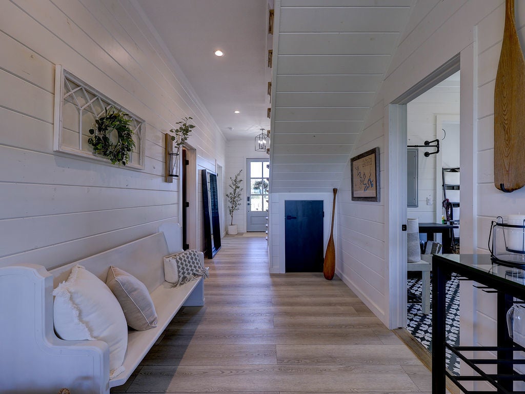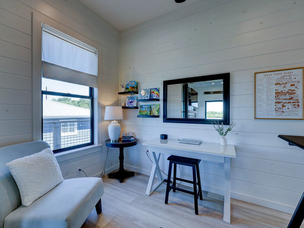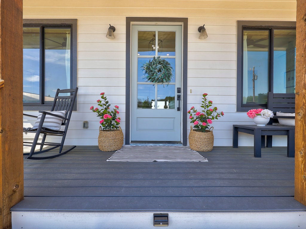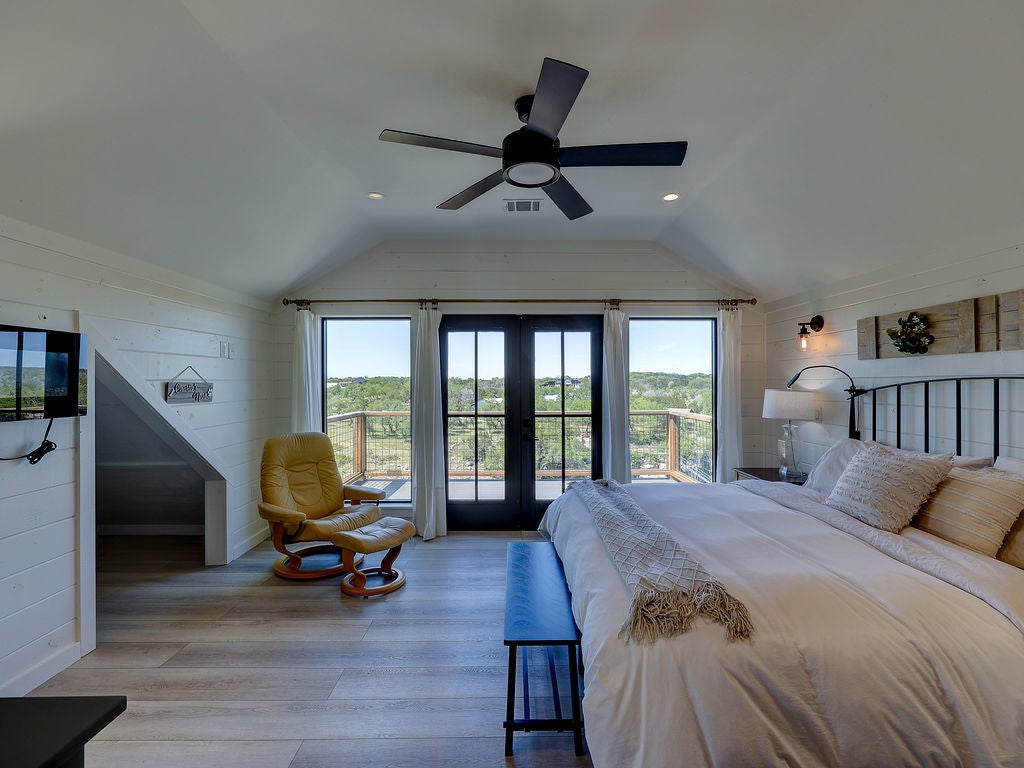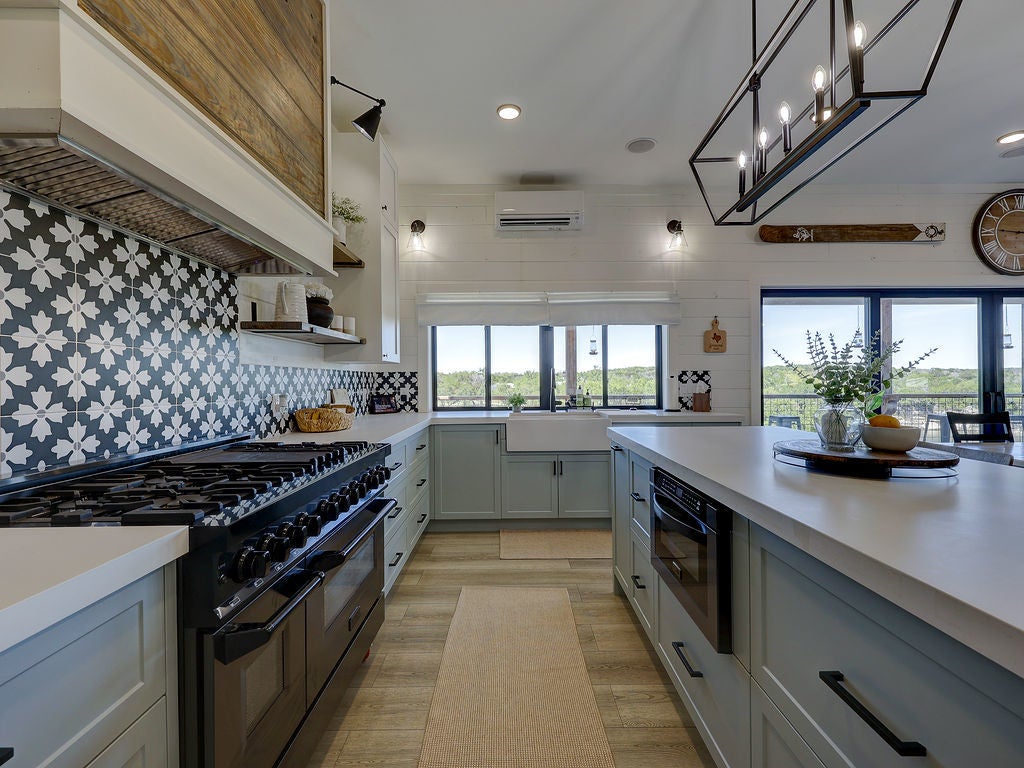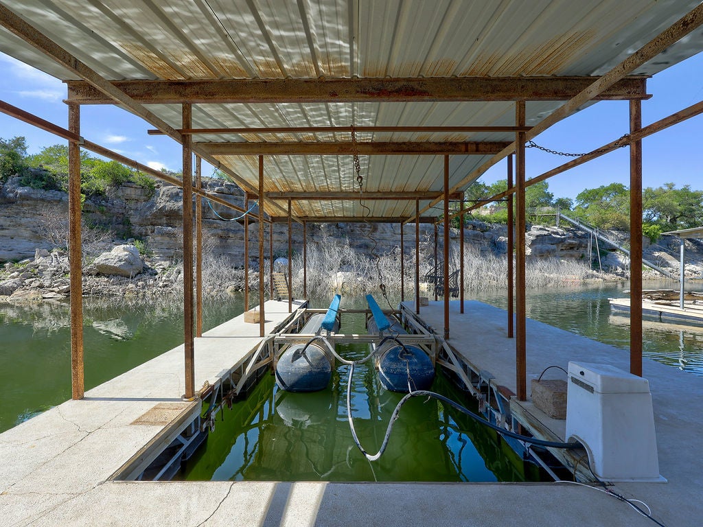 Set along the waterfront shores of Lake Travis in a peaceful, protected cove, this custom coastal-inspired modern farmhouse offers a rare opportunity for relaxed, low-maintenance lake living. Designed for those seeking a quiet retreat rather than a high-traffic recreational setting, the home blends thoughtful design, elevated views, and effortless indoor-outdoor flow—perfect for full-time living or a turnkey second home. The expansive wraparound porch invites slow mornings with coffee overlooking rolling countryside and grazing horses, while evenings are best spent unwinding on the back deck with serene lake and tree-filled views. Rebuilt and completed in Fall 2022 and elevated to meet updated floodplain requirements, the home feels nearly new while offering peace of mind and sweeping vantage points from nearly every room, window, and outdoor living space—creating a constant connection to the surrounding lake and landscape. Inside, natural light fills the space, with large sliding glass doors opening seamlessly to outdoor living. The kitchen is both beautiful and functional, featuring Z-Line appliances, an 8-burner dual-oven gas range, farmhouse sink, leather-finish porcelain countertops, and a large central island. Warm, character-rich details like shiplap walls, barn doors, iron railings, and window seats create a welcoming, lived-in feel. The protected cove is ideal for kayaking, paddleboarding, and fishing, offering calm water enjoyment from your private dock. With ensuite bedrooms, flexible office spaces, and generous storage—including ~1,520 sq ft of unfinished lower-level space ready for customization—this home offers versatility without excess. Available furnished for a true turnkey experience, and located near Briarcliff marina, Pace Bend Park, and local dining, this is Lake Travis living at its most peaceful and refined.