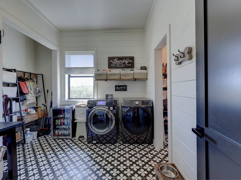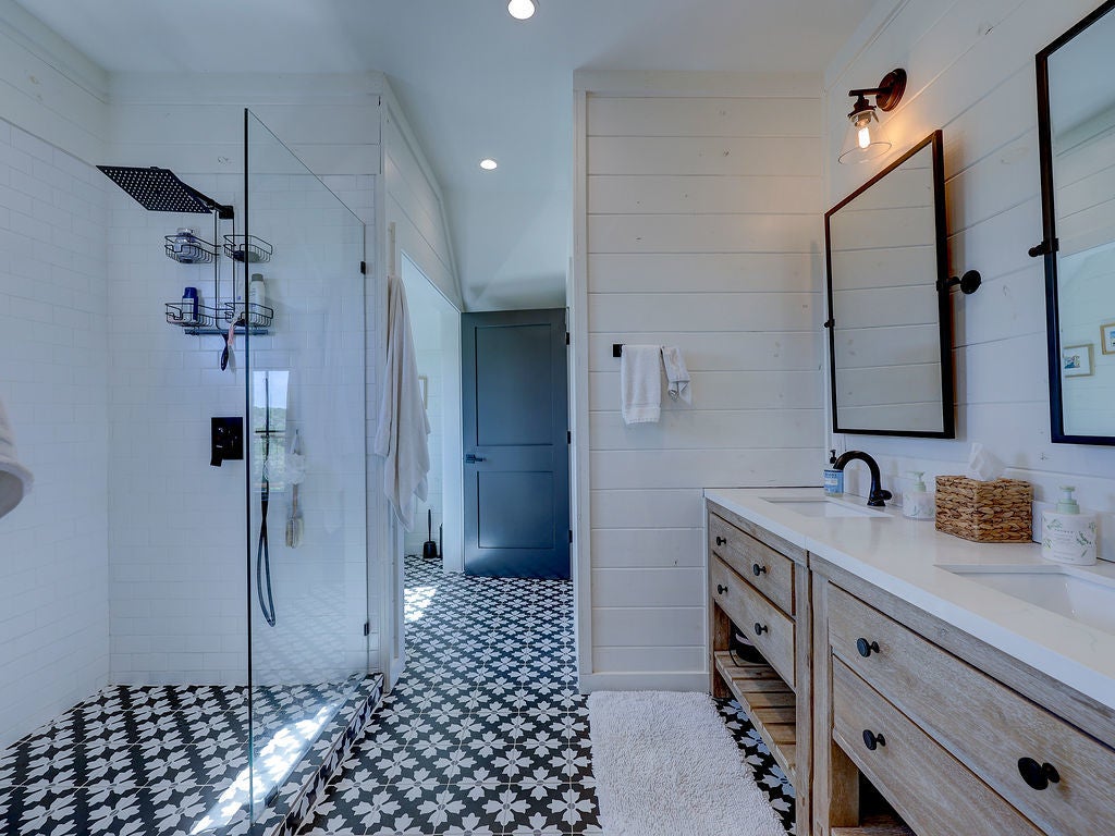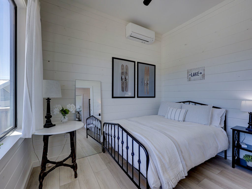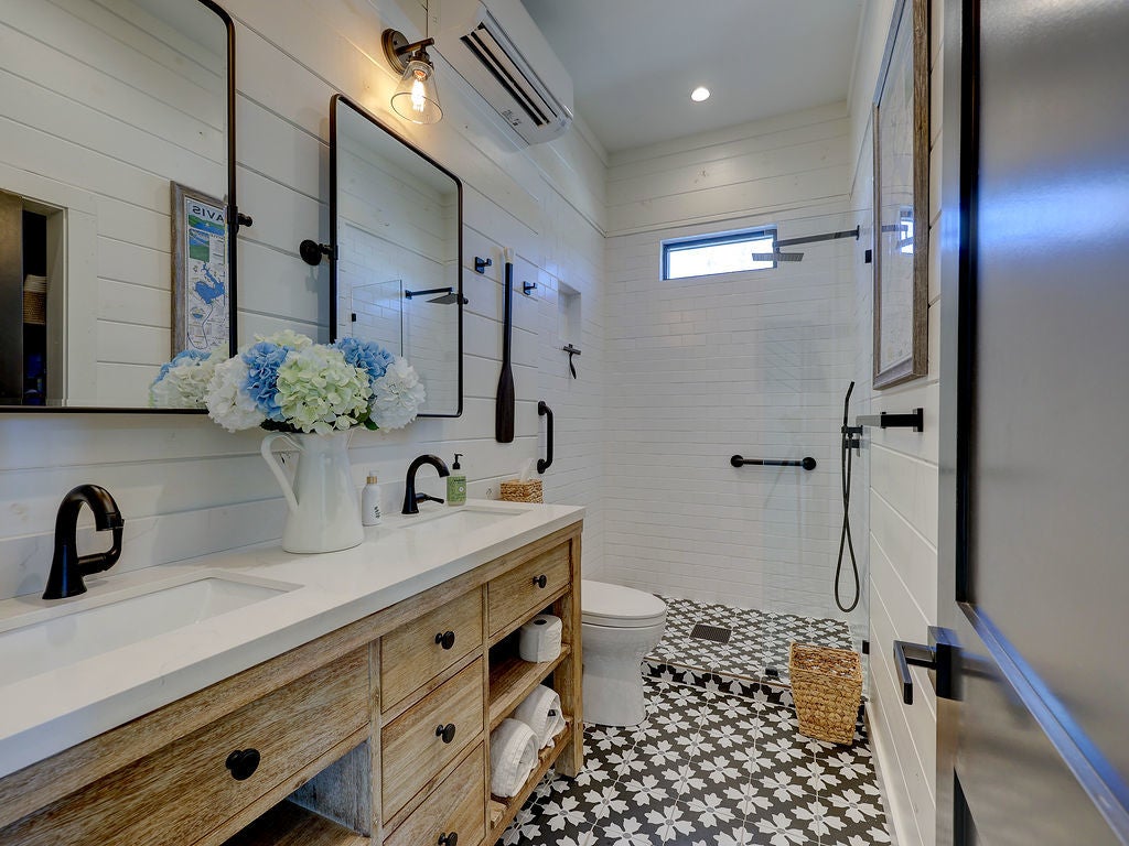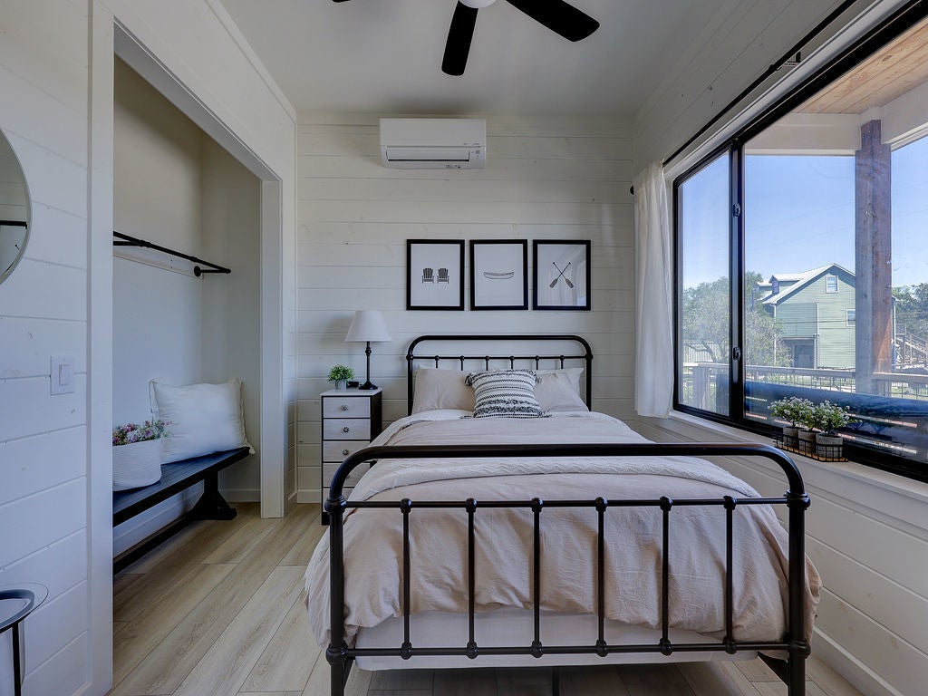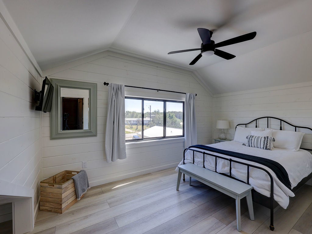 Set along the waterfront shores of Lake Travis in a peaceful, protected cove, this custom coastal-inspired modern farmhouse offers a rare opportunity for relaxed, low-maintenance lake living. Designed for those seeking a quiet retreat rather than a high-traffic recreational setting, the home blends thoughtful design, elevated views, and effortless indoor-outdoor flow—perfect for full-time living or a turnkey second home. The expansive wraparound porch invites slow mornings with coffee overlooking rolling countryside and grazing horses, while evenings are best spent unwinding on the back deck with serene lake and tree-filled views. Rebuilt and completed in Fall 2022 and elevated to meet updated floodplain requirements, the home feels nearly new while offering peace of mind and sweeping vantage points from nearly every room, window, and outdoor living space—creating a constant connection to the surrounding lake and landscape. Inside, natural light fills the space, with large sliding glass doors opening seamlessly to outdoor living. The kitchen is both beautiful and functional, featuring Z-Line appliances, an 8-burner dual-oven gas range, farmhouse sink, leather-finish porcelain countertops, and a large central island. Warm, character-rich details like shiplap walls, barn doors, iron railings, and window seats create a welcoming, lived-in feel. The protected cove is ideal for kayaking, paddleboarding, and fishing, offering calm water enjoyment from your private dock. With ensuite bedrooms, flexible office spaces, and generous storage—including ~1,520 sq ft of unfinished lower-level space ready for customization—this home offers versatility without excess. Available furnished for a true turnkey experience, and located near Briarcliff marina, Pace Bend Park, and local dining, this is Lake Travis living at its most peaceful and refined.
